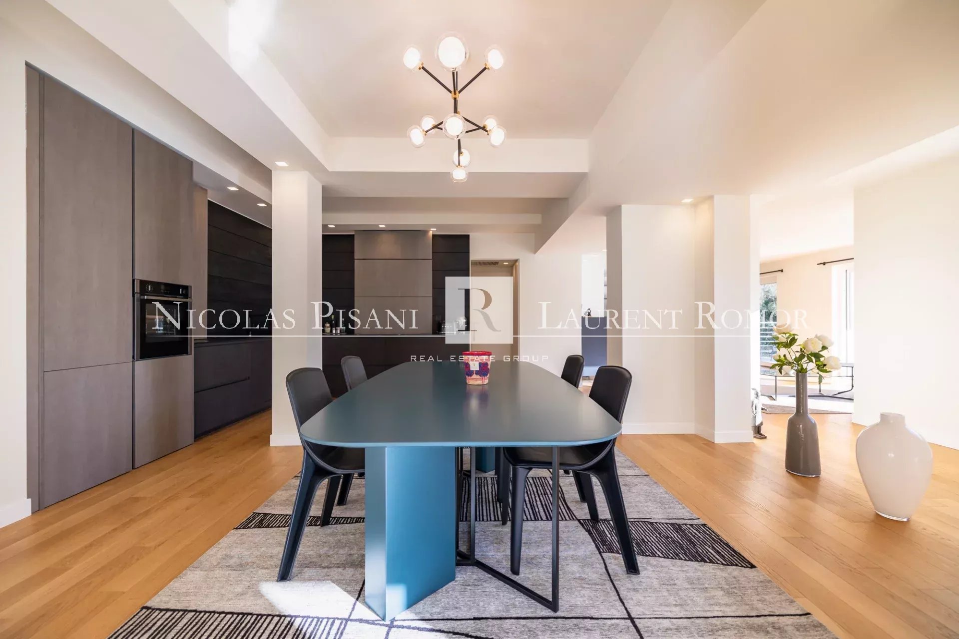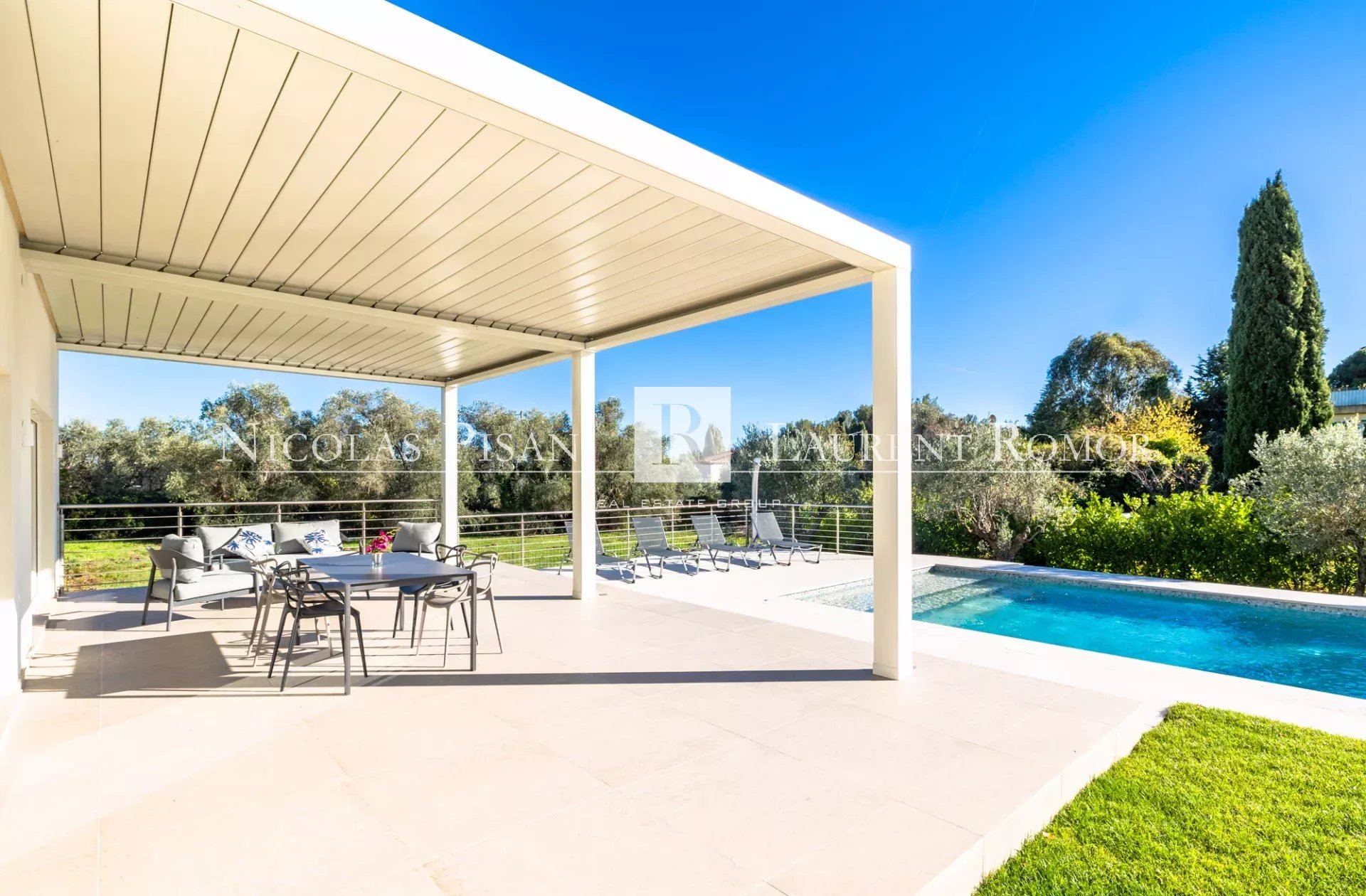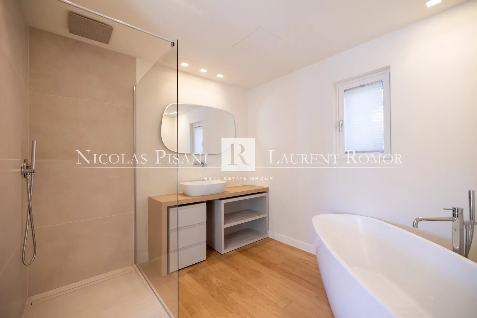 EN VENTE Propriété 4 pièces sur 2 niveaux, située dans un quartier résidentiel recherché et au calme. Élégante villa de 170 m² entièrement rénovée, édifiée sur une parcelle plate de 1 517 m² avec piscine au sel. Au rez-de-jardin : entrée, cuisine ouverte équipée avec coin repas, séjour lumineux ouvrant sur une grande terrasse avec pergola bioclimatique, buanderie, toilettes invités, et première chambre avec dressing et salle d’eau/WC en suite. À l’étage : deux suites, dont une avec salle de bain et l’autre avec salle d’eau, chacune avec WC, bénéficiant d’un accès à une vaste terrasse de 60 m² avec vue sur le jardin et un aperçu mer. Prestations haut de gamme : climatisation centralisée, chauffage au sol, éclairage LED, double vitrage, moustiquaires... Extérieurs : espace piscine sécurisé, jardin paysager, nombreuses places de stationnement. Honoraires à la charge du vendeur. Bien non soumis au régime de copropriété.