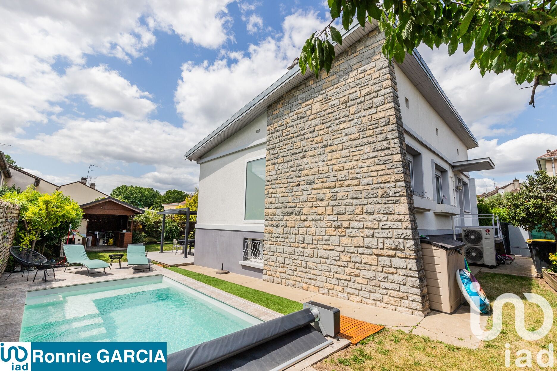 A l'extérieur, terrain de 461 m², un terrasse avec une pergola, une piscine et son coin terrasse / transats, un espace barbecue / plancha / cuisine d'été, portail coulissant électrique et emplacement véhicules dans la propriété