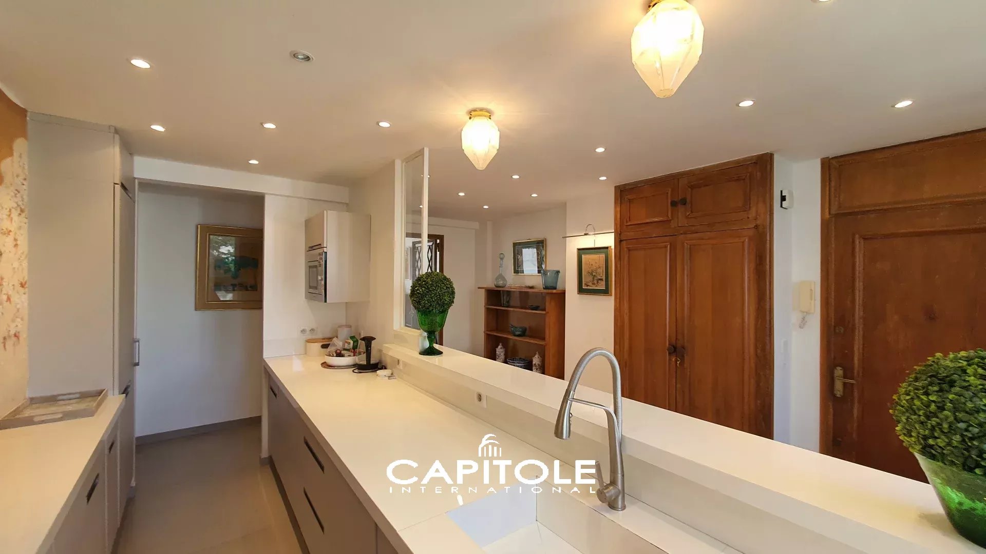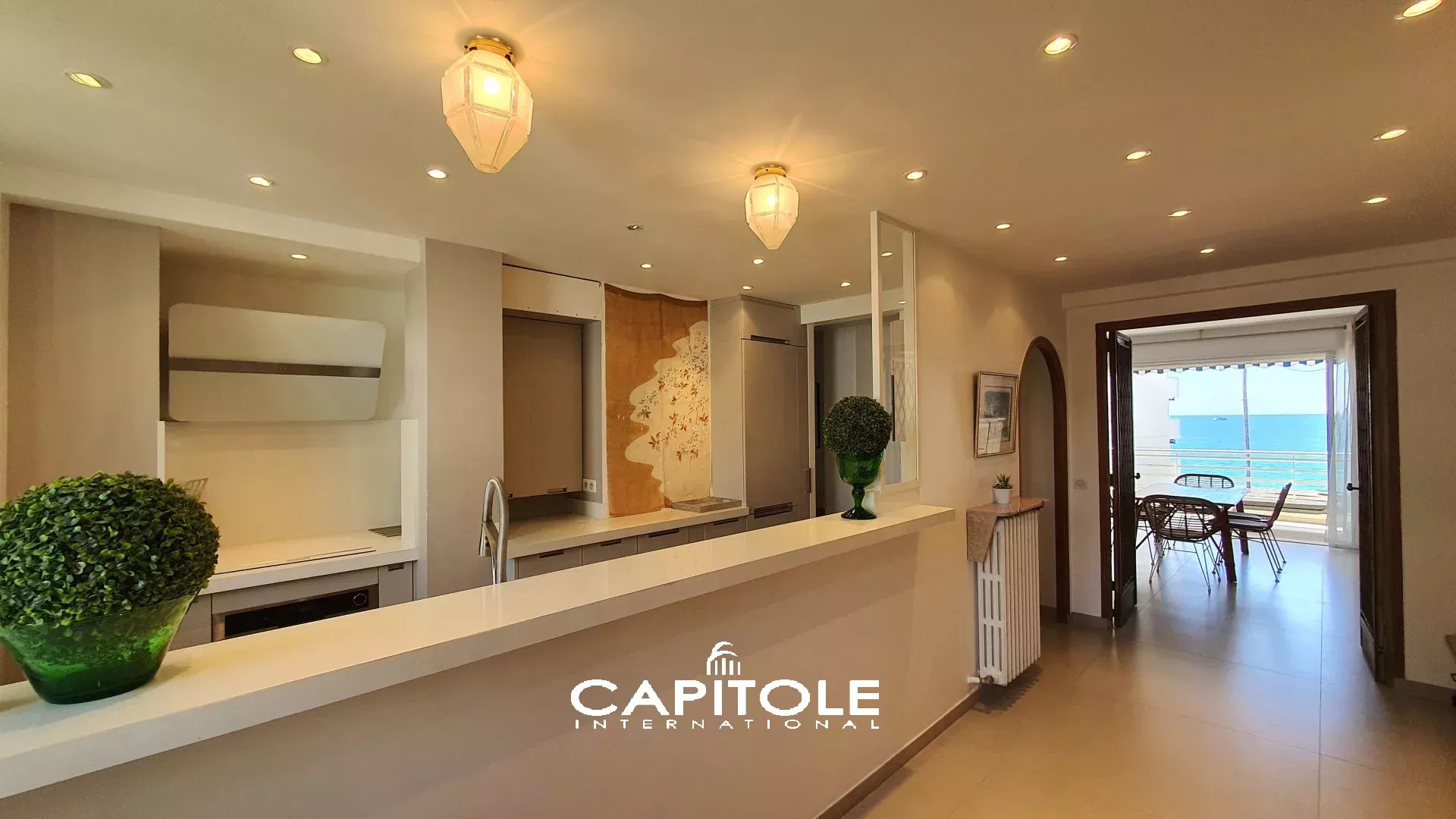 Juan les Pins centre ville: Superbe appartement 5 pièces de 148 m² entièrement rénové, offrant de beaux volumes et une vue mer. Il se compose d’un double séjour ouvrant sur une terrasse de 25 m² avec vue mer, d’une cuisine équipée, de quatre chambres dont une spacieuse suite parentale de 20 m² avec salle d’eau, toilettes et vue mer. Deux autres salles d’eau, trois WC, une buanderie et un dressing complètent ce bien. Parking dans la résidence. Plages et toutes commodités sur place. Réf : CB1928VA