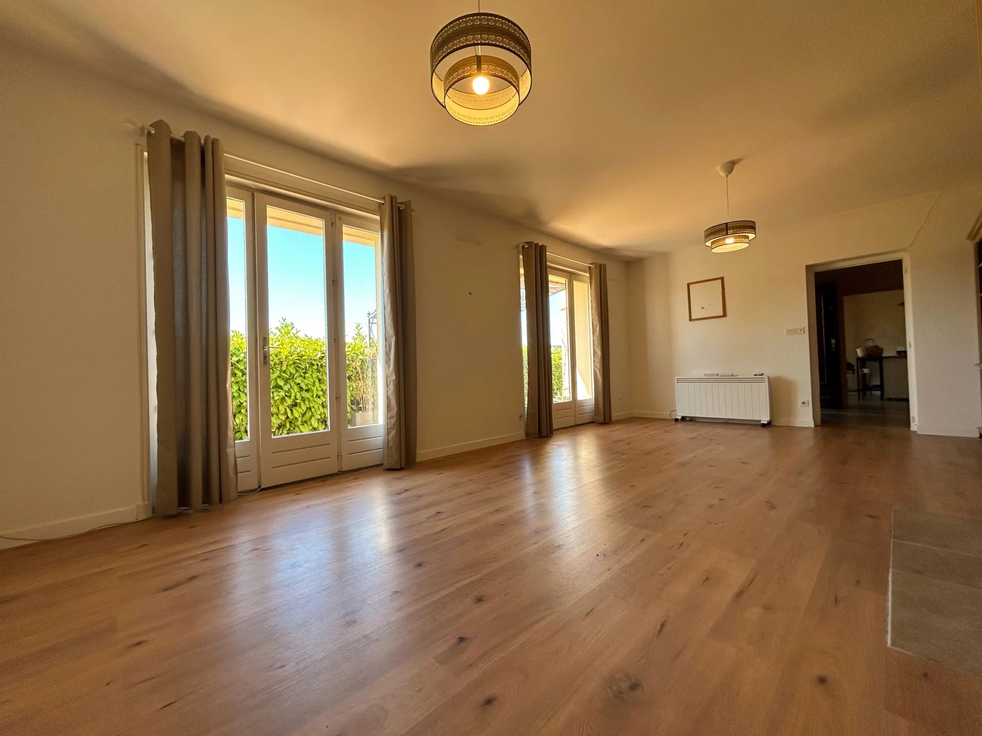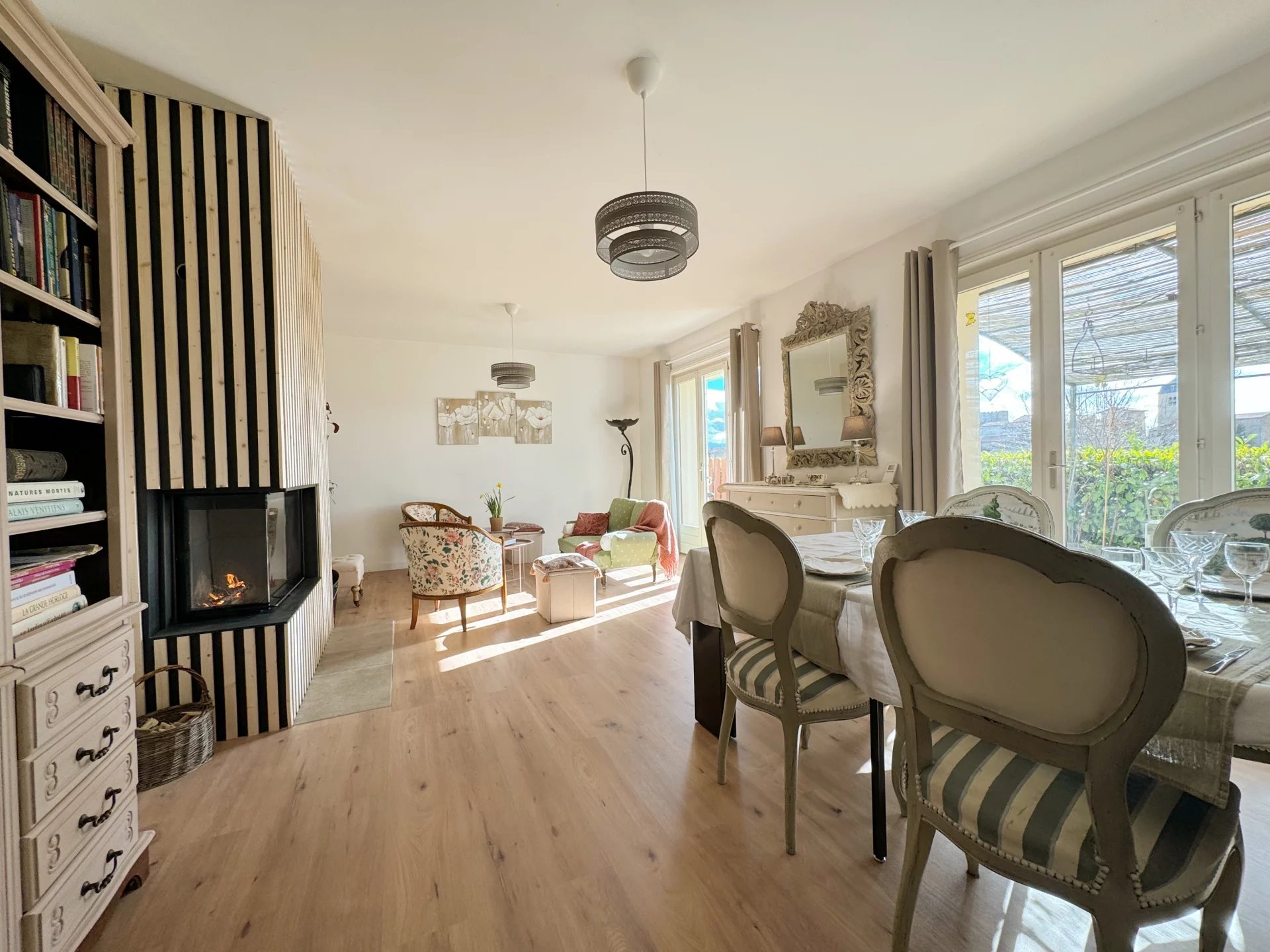 Dès l’entrée, une grande porte en chêne s’ouvre sur un hall spacieux desservant une cuisine séparée, ainsi qu’un vaste séjour lumineux équipé d’un insert bois (installé en 2019), parfait pour les moments en famille. Les grandes baies vitrées donnent accès à une terrasse plein sud, sans vis-à-vis, offrant une belle vue dégagée sur la campagne et le village.