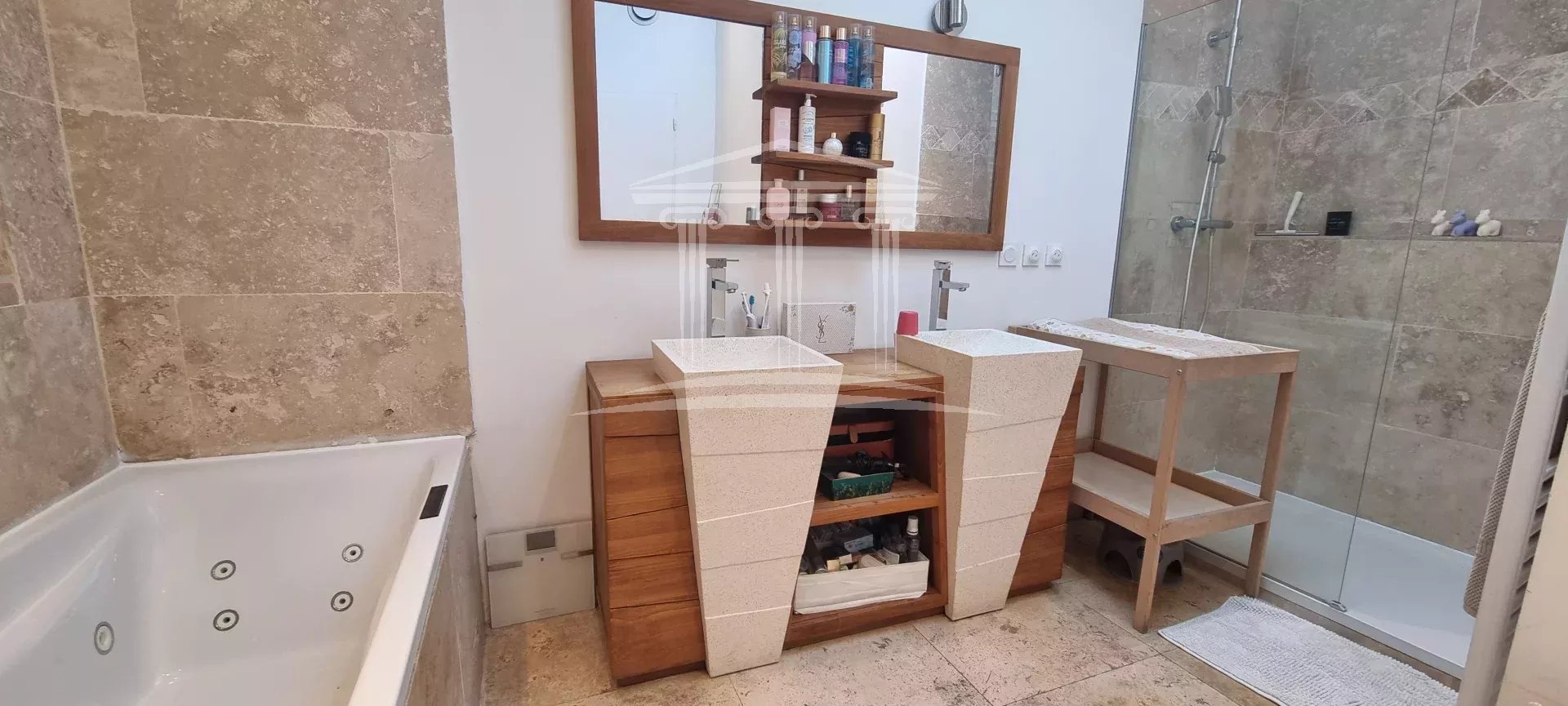 Charmante maison de ville en pierre rénovée avec goût. Agréable jardin sans vis à vis abrité par un platane centenaire. Son espace de vie est spacieux et lumineux, cuisine équipée moderne, à l'étage deux chambres et une salle de bain avec baignoire balnéo et douche. Climatisation gainable. Matériaux de qualité - prestations soignées. La cour offre la possibilité de stationner deux véhicules.
