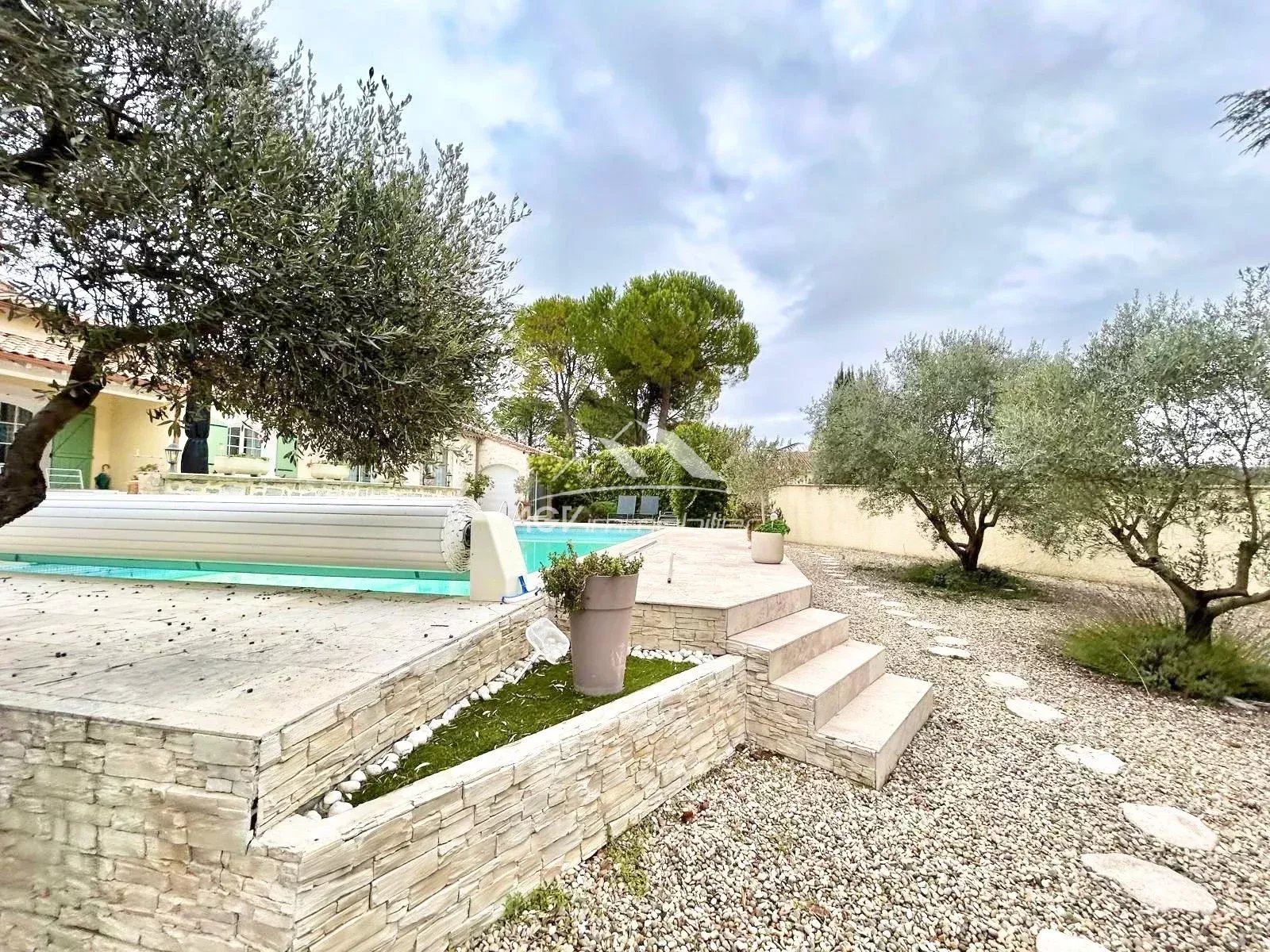 Maison située au calme, proche de toutes les commodités. Au rez-de-chaussée : entrée, séjour, grande cuisine équipée, une chambre, WC séparé, buanderie et réserve. À l’étage : palier desservant 4 chambres, dressing, salle d’eau, salle de bains et WC séparé. Garage attenant, carport, atelier et piscine 10 × 5 m avec volet roulant électrique. Le tout sur terrain clos et arboré d’environ 1900 m².