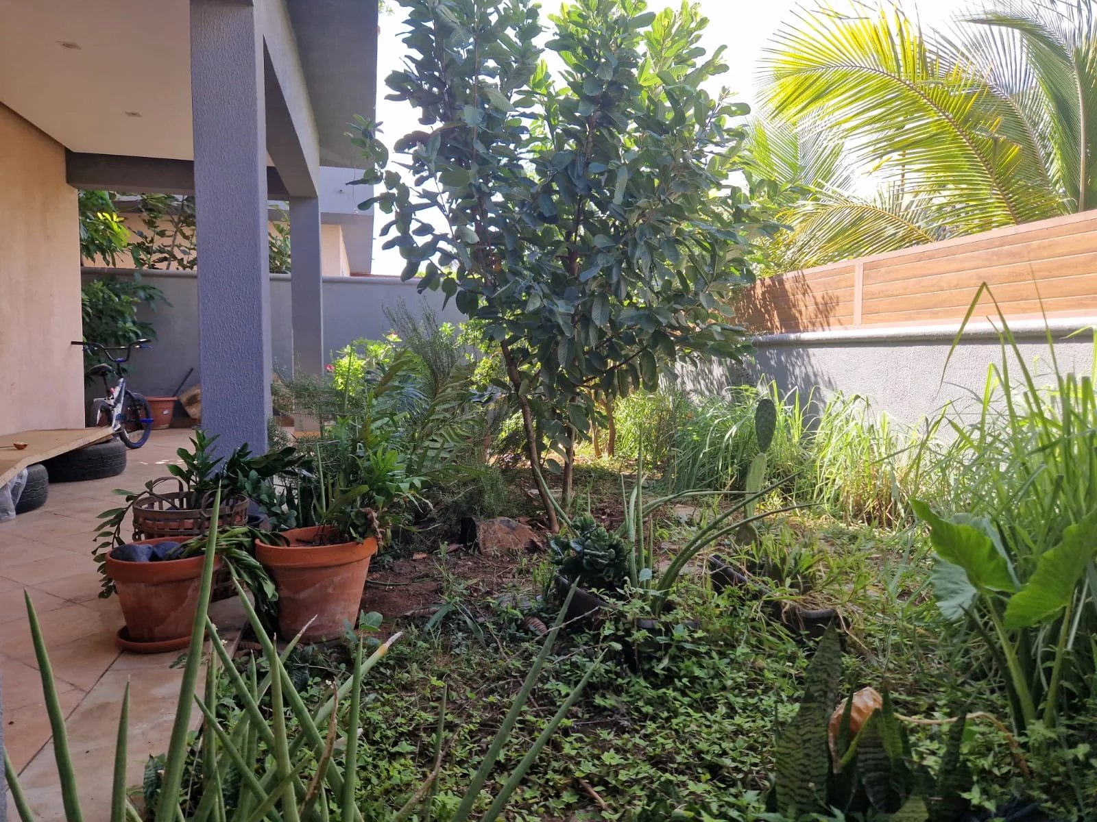 - 1 entrée spacieuse et accueillante, avec espace vert, plantes et arbres fruitiers