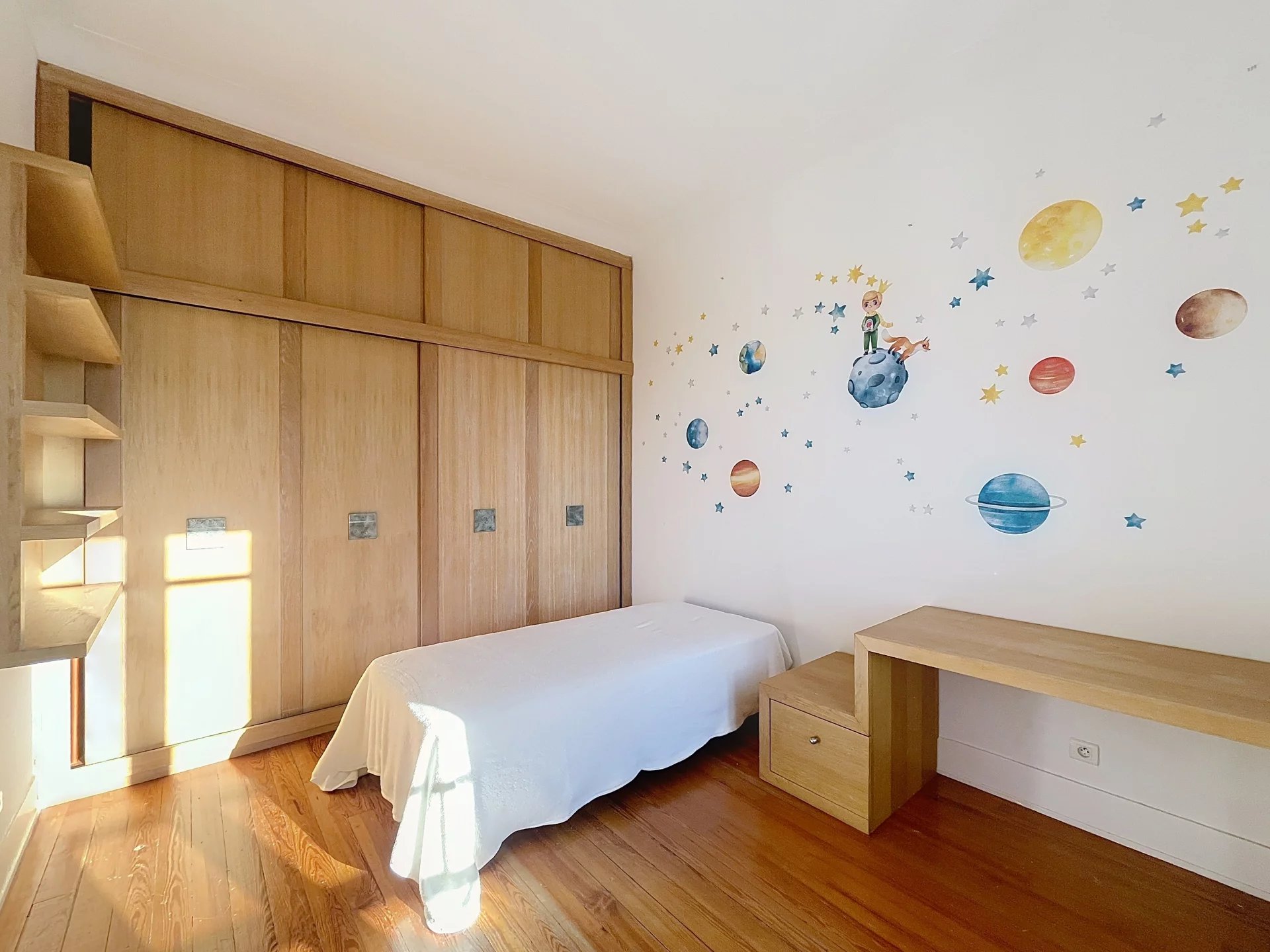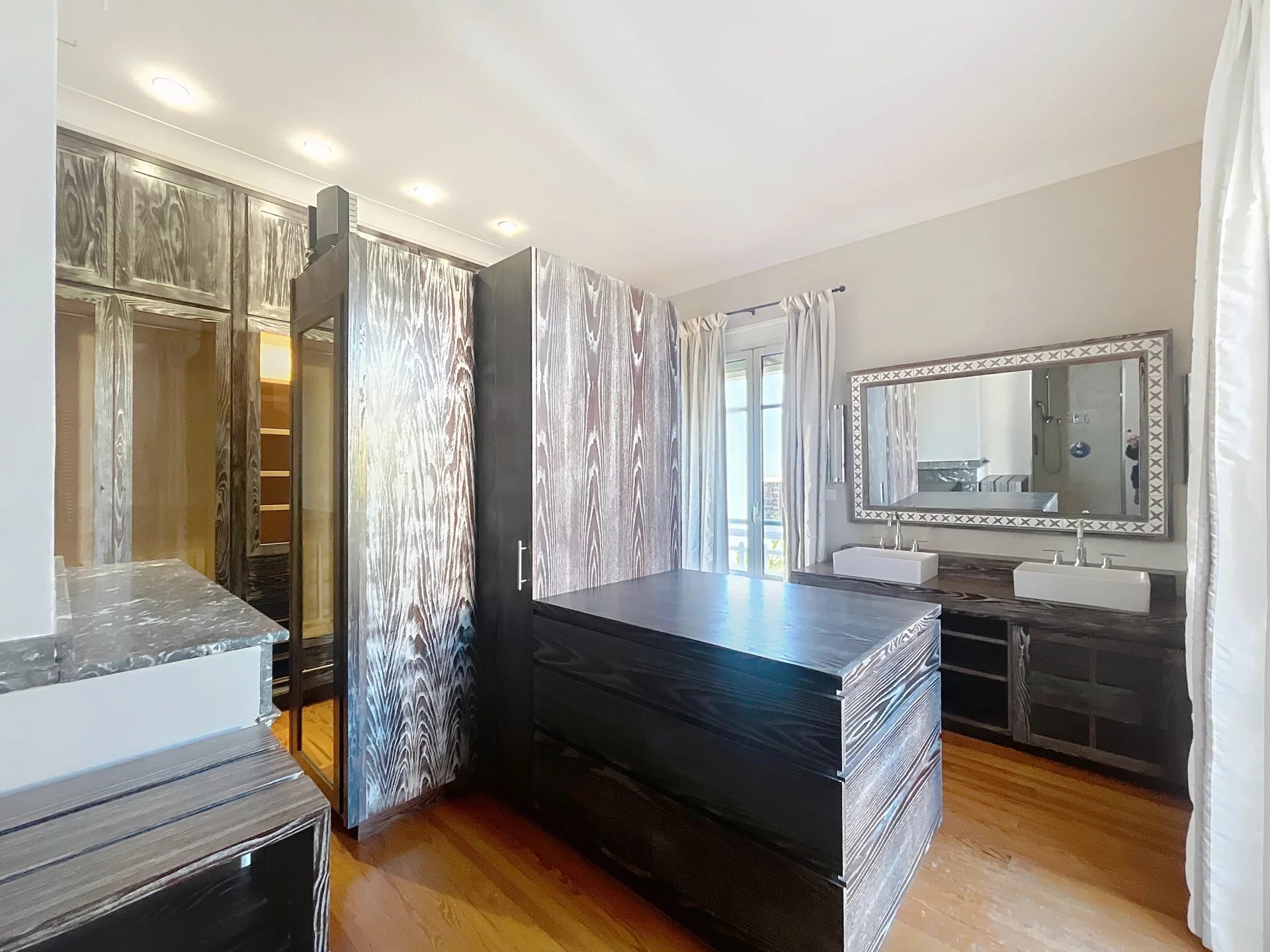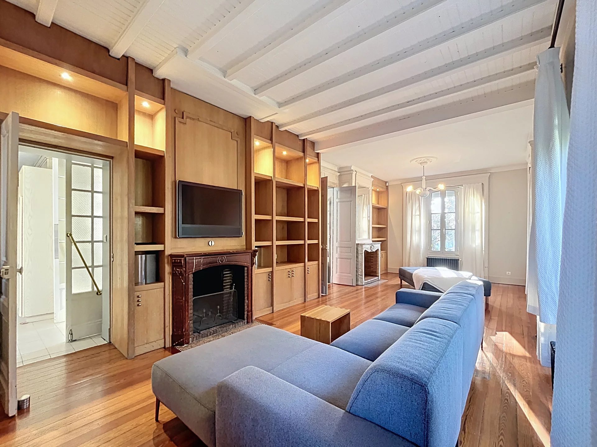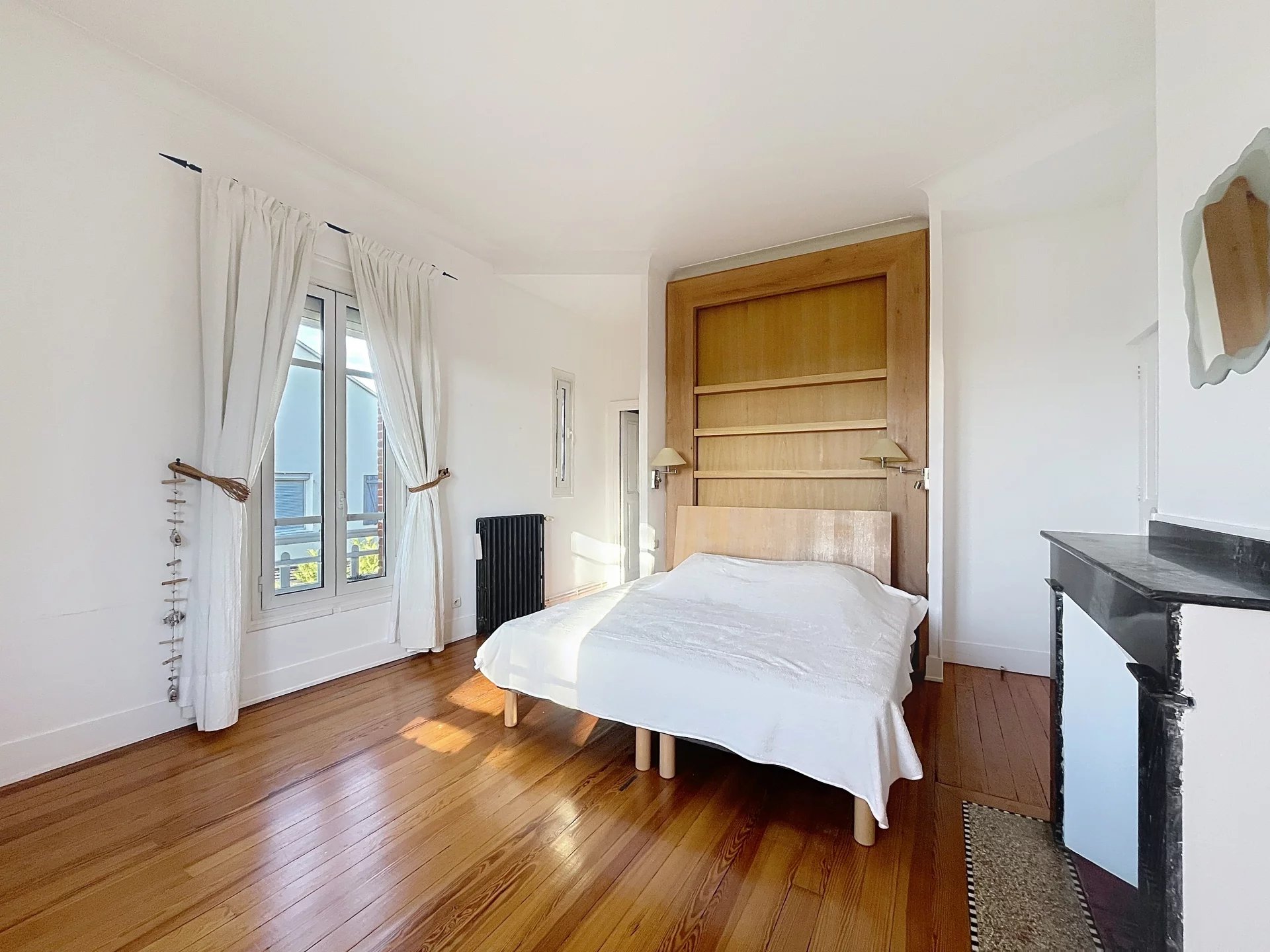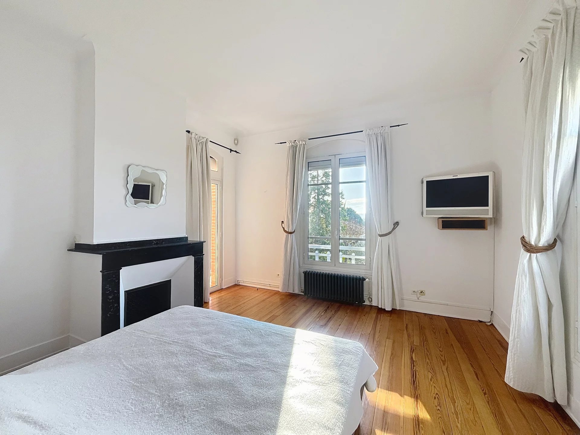 La maison, répartie sur deux niveaux avec un sous-sol semi-enterré, propose des espaces de vie lumineux et raffinés. Dès l’entrée, un salon traversant baigné de lumière, avec parquet et deux cheminées d’époque, invite à la détente. La cuisine, entièrement équipée avec des prestations haut de gamme (cuisson La Cornue, réfrigérateur, micro-ondes, machine à laver et nombreux rangements), s’ouvre sur une élégante salle à manger installée dans une verrière offrant une magnifique vue sur le jardin. Un bureau sur mesure complète ce niveau, accessible depuis le hall d’entrée.