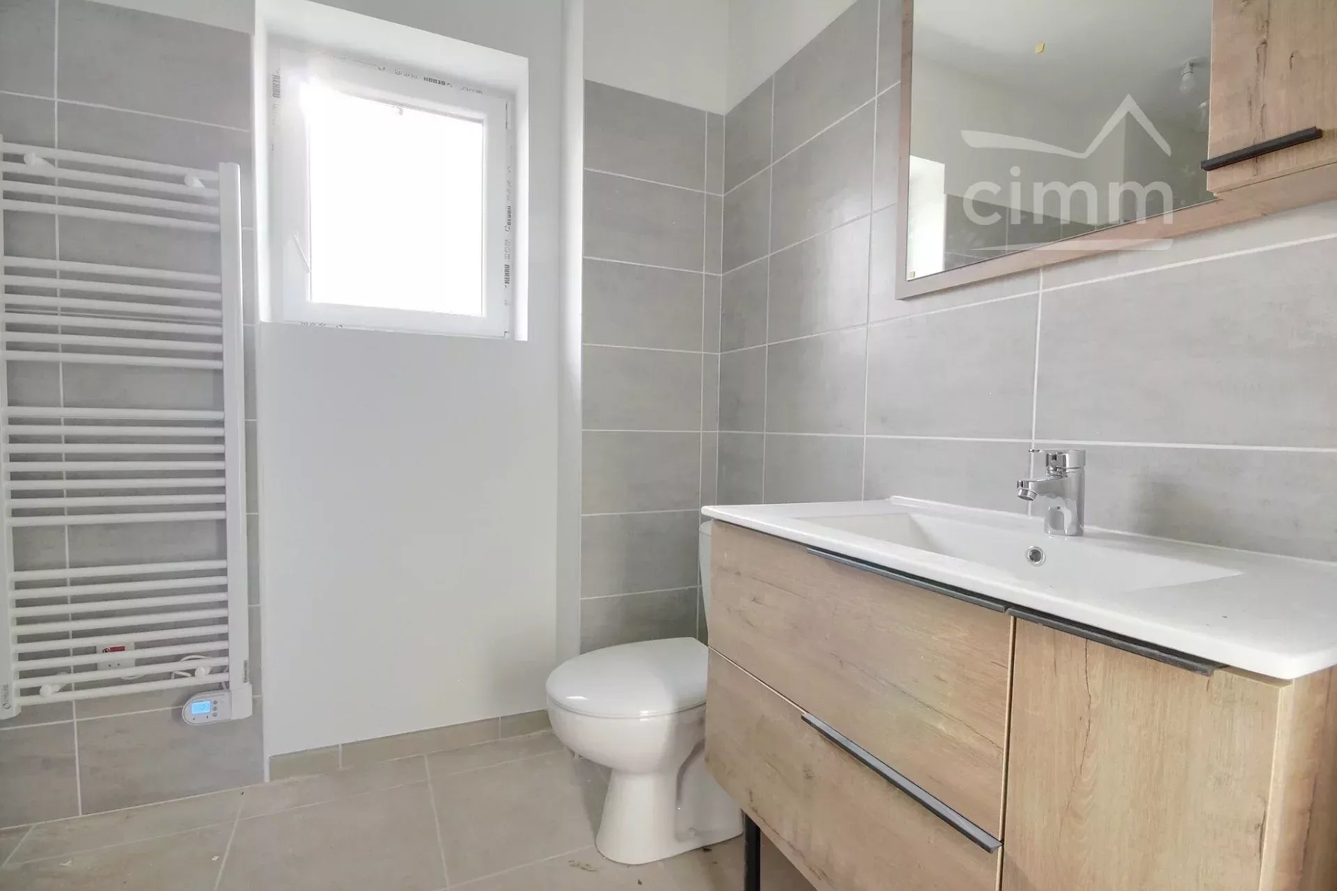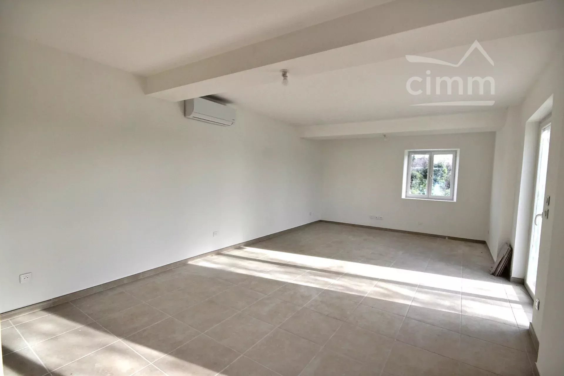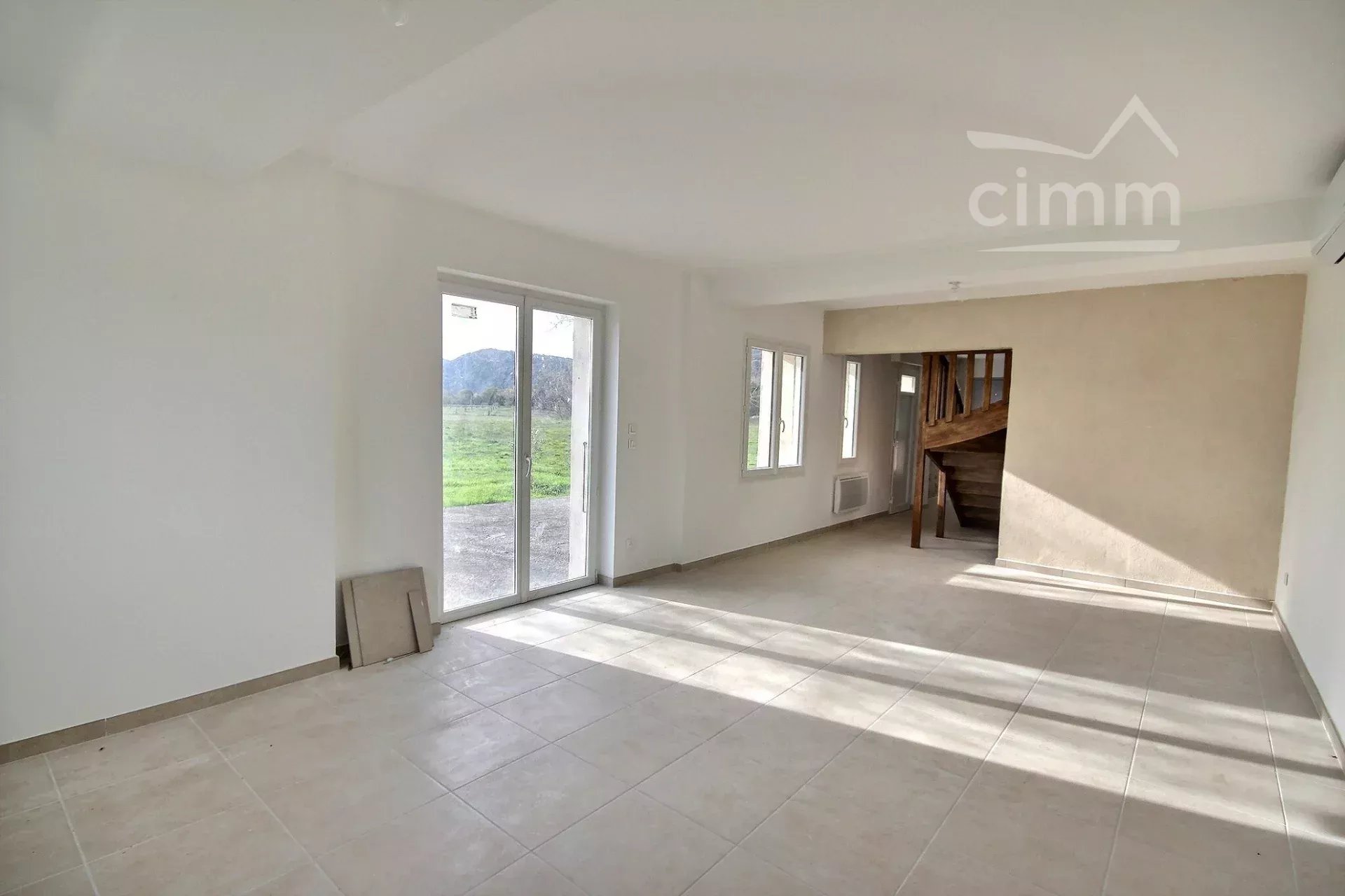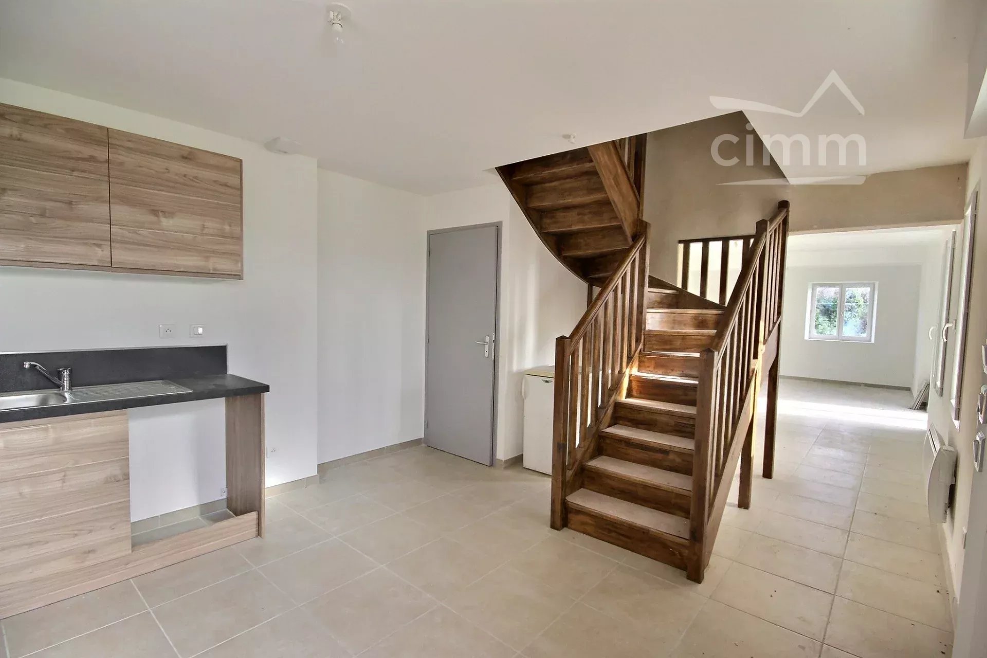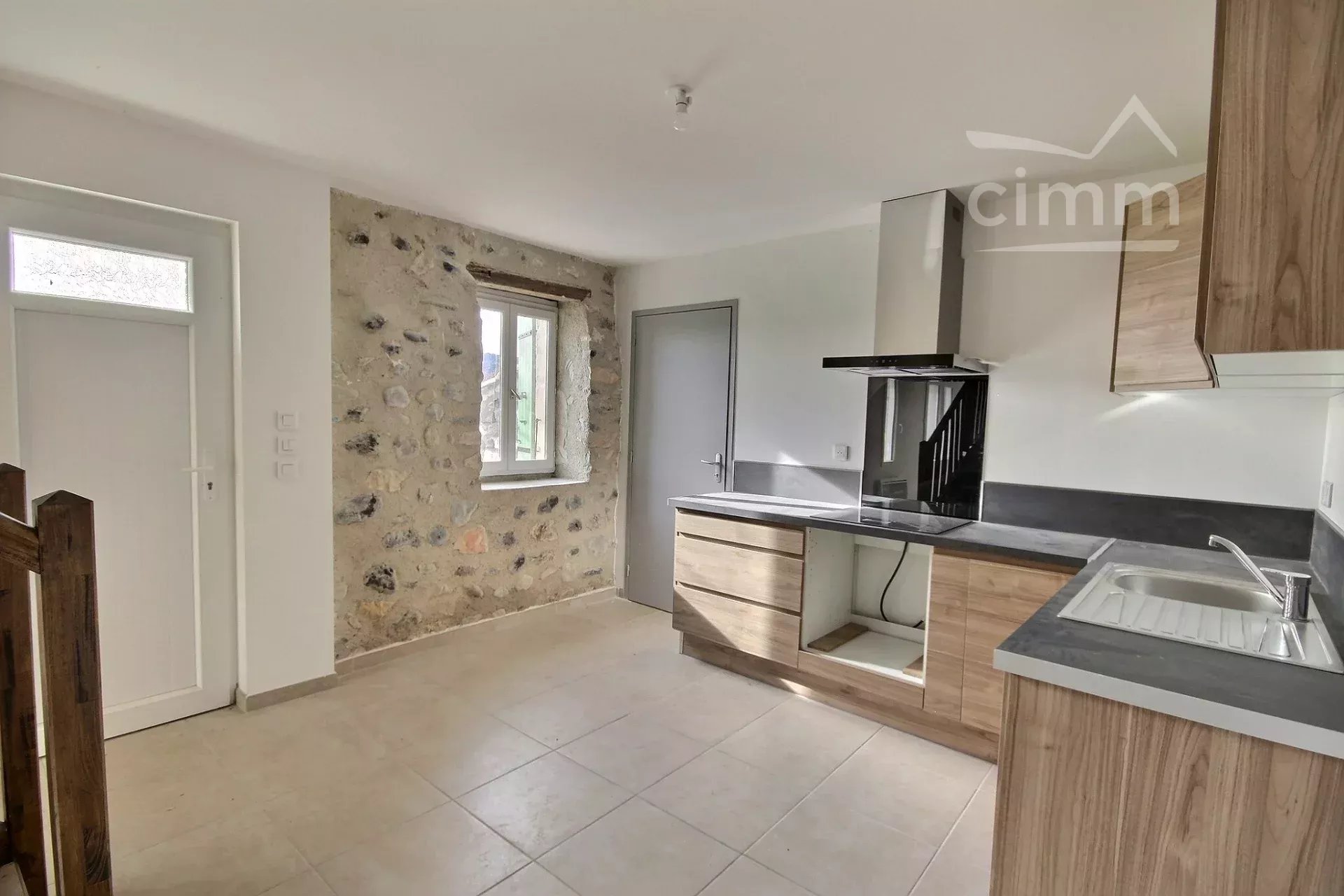Il offre une spacieuse pièce de vie baignée de soleil, ainsi qu’une cuisine partiellement aménagée (plaque de cuisson, hotte et rangements). Une buanderie et un WC complètent le rez-de-chaussée.