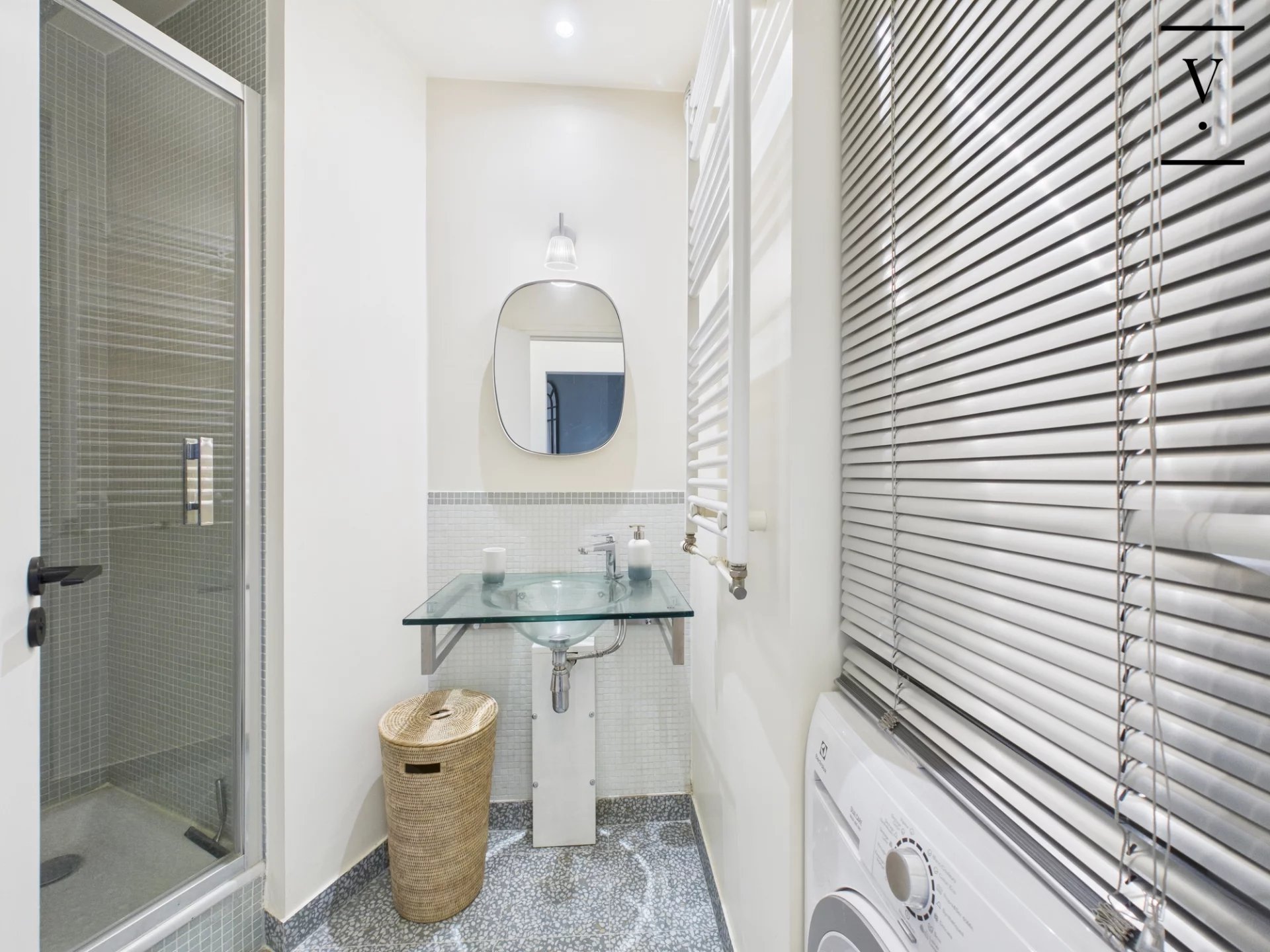 Une vaste entrée avec de nombreux rangements, une cuisine entièrement équipée, un séjour lumineux offrant une vue dégagée et deux balconnets avec aperçu sur la tour Eiffel, deux chambres confortables, une salle d’eau avec machine à laver, une salle de bain avec WC, un WC indépendant.