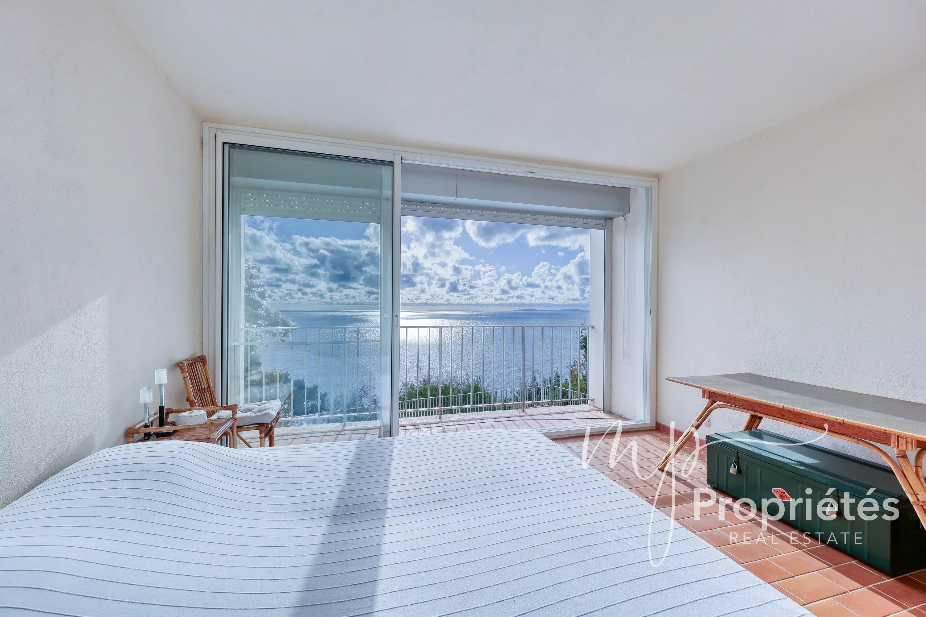 Une chambre avec point d’eau et terrasse privative offrant une superbe vue mer, une suite parentale composée d’une petite pièce attenante et d’une salle de bain, puis une chambre supplémentaire avec sa propre salle de bain.