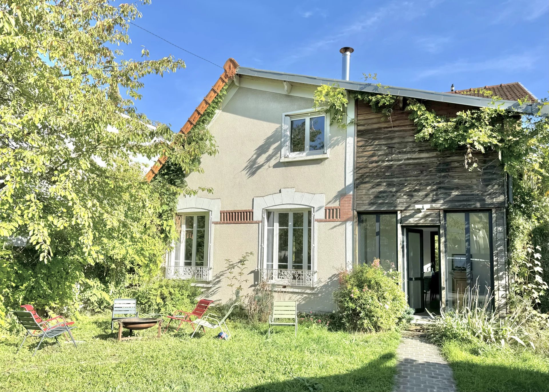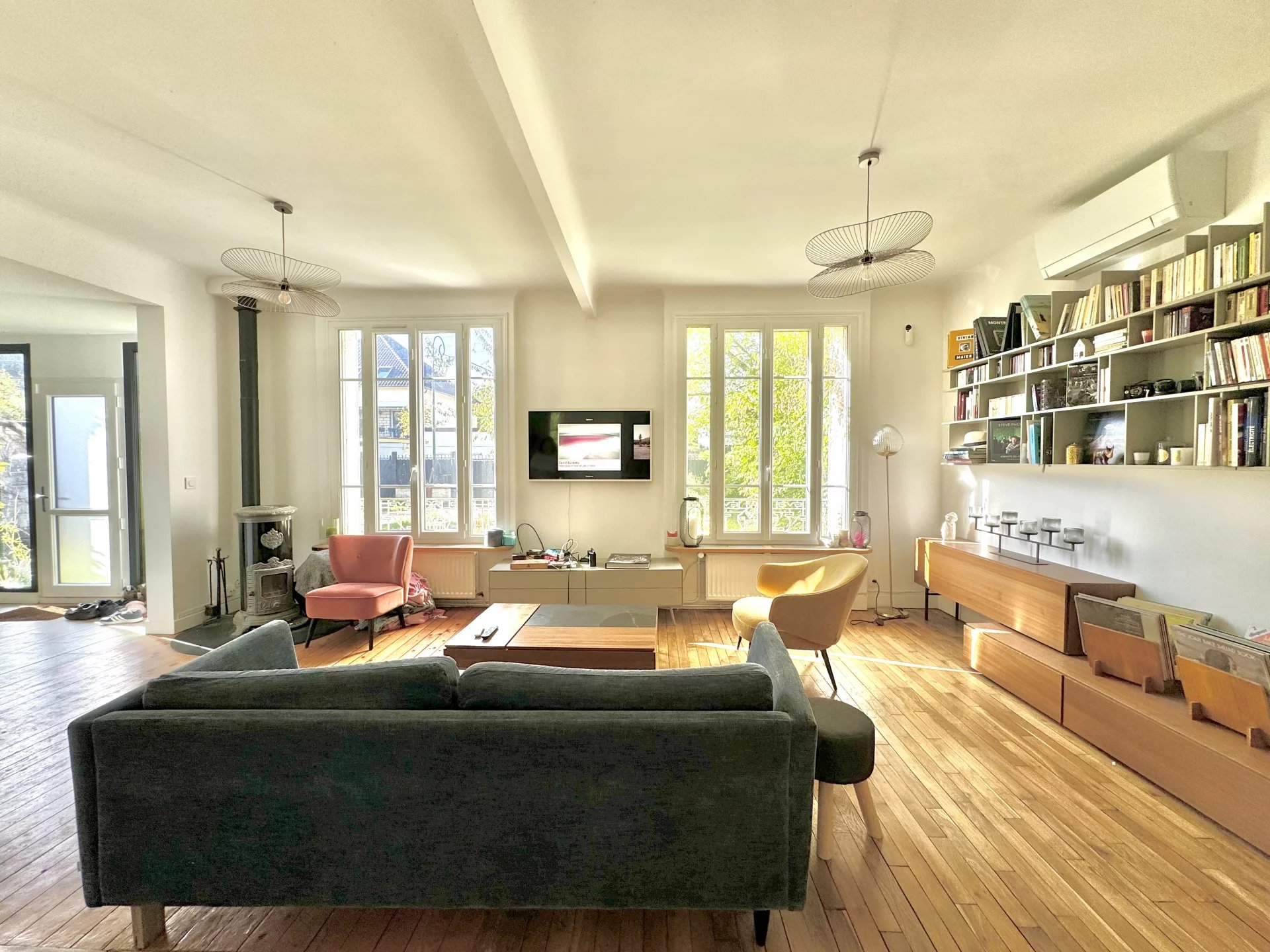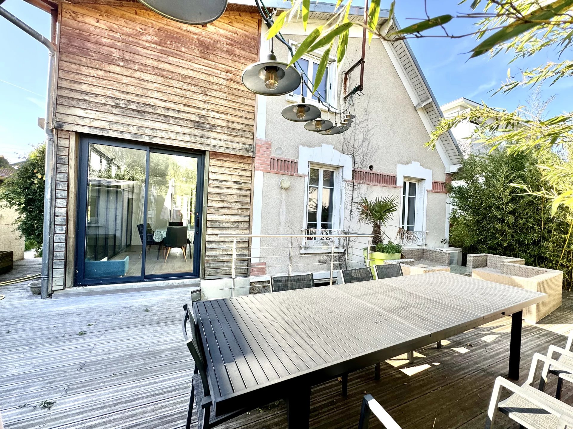 Charmante villa de 4/5 chambres, construite dans les années 1910, de 133,45 m² habitables environ, édifiée sur un terrain arboré de cerisiers : 416 m² au calme absolu, proche de l’école Anglaise, et des bords de Seine. La maison a bénéficié d’aménagements dans un esprit contemporain. Depuis l’entrée équipée d’un dressing (placards coulissants avec miroirs, WC d’invités), on découvre un beau séjour parqueté orienté ouest, de 26,59 m² env. HSP : 2,80m (poêle, parquet, murs blancs), un bureau / chambre d’amis + placards, une grande cuisine équipée au goût du jour donne sur la salle à manger agrémentée de larges baies vitrées de 14,68 m² env., en accès direct sur une grande terrasse orientée sud-est. Au premier étage : un palier dessert quatre belles chambres avec placards, deux salles de douches, WC séparés. Deux annexes dans le jardin (un garage cadastré, + un carport en bois avec prise pour véhicule électrique), une cave en accès extérieur (espace de rangement), complètent ce bien. Eléments de confort et travaux effectués en 2019 : double vitrage dans toute la maison, et baies vitrées coulissantes aluminium. Portail coulissant électrique. Pompe à chaleur réversible, chaudière au gaz Frisquet à condensation. Isolation de la toiture et de l’extension (créé en 2002), toute l’électricité, Fibre