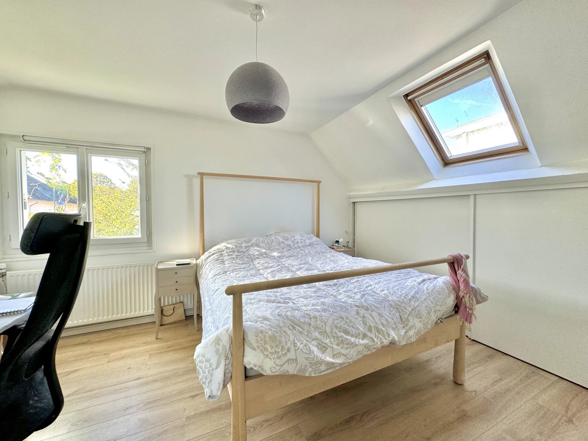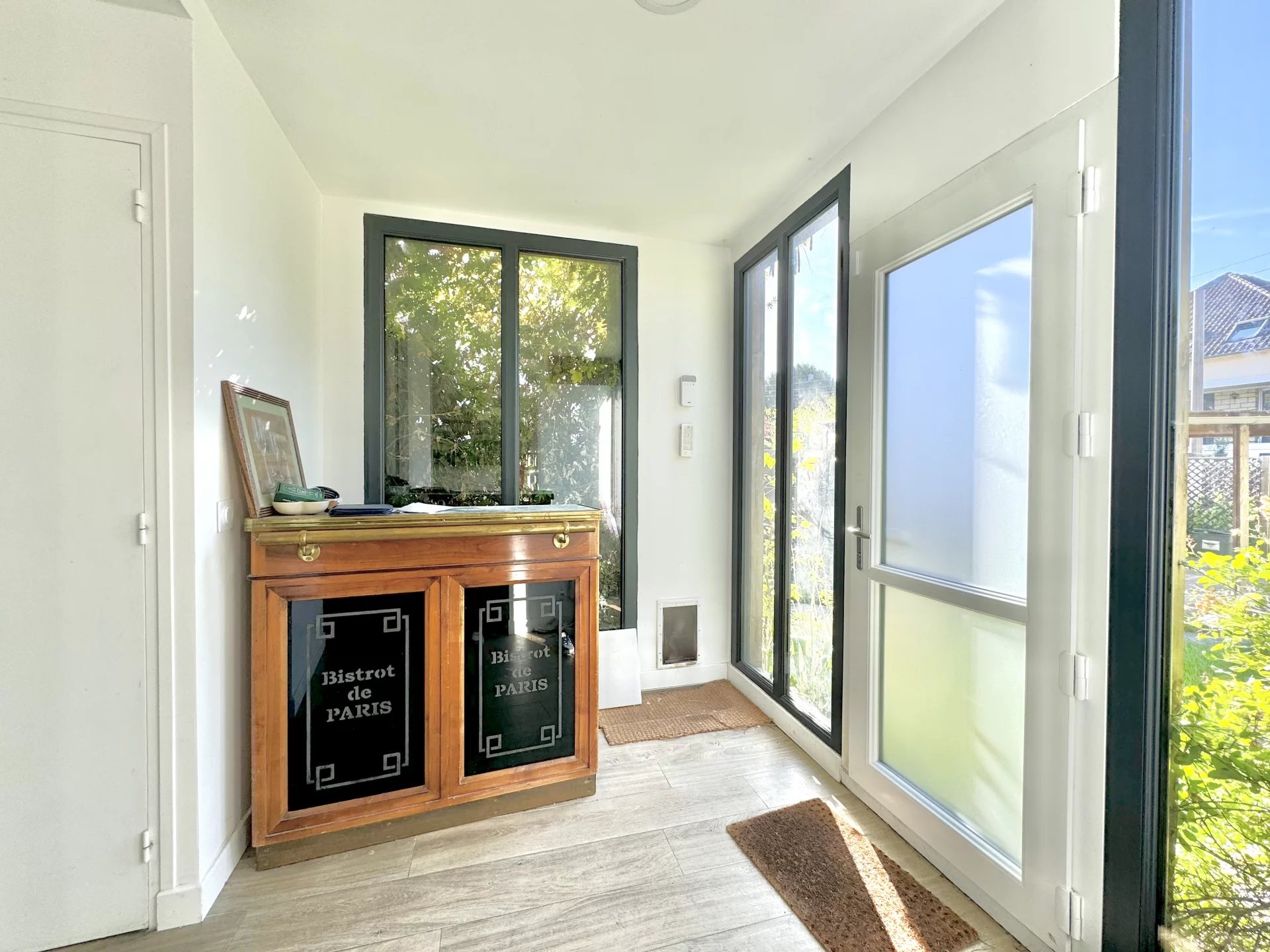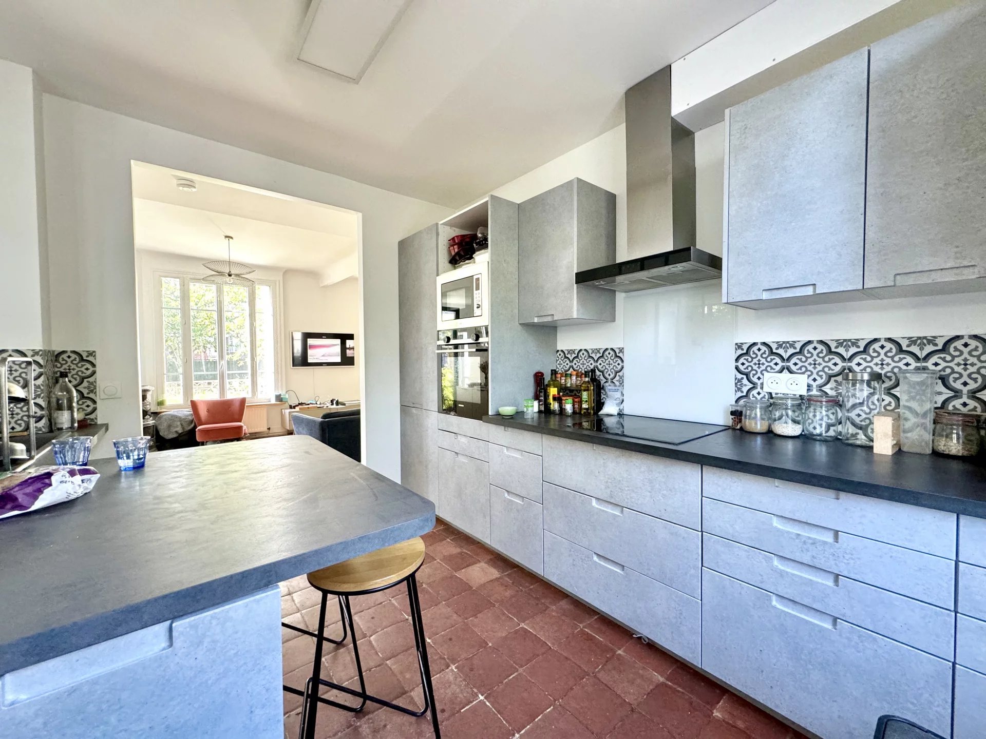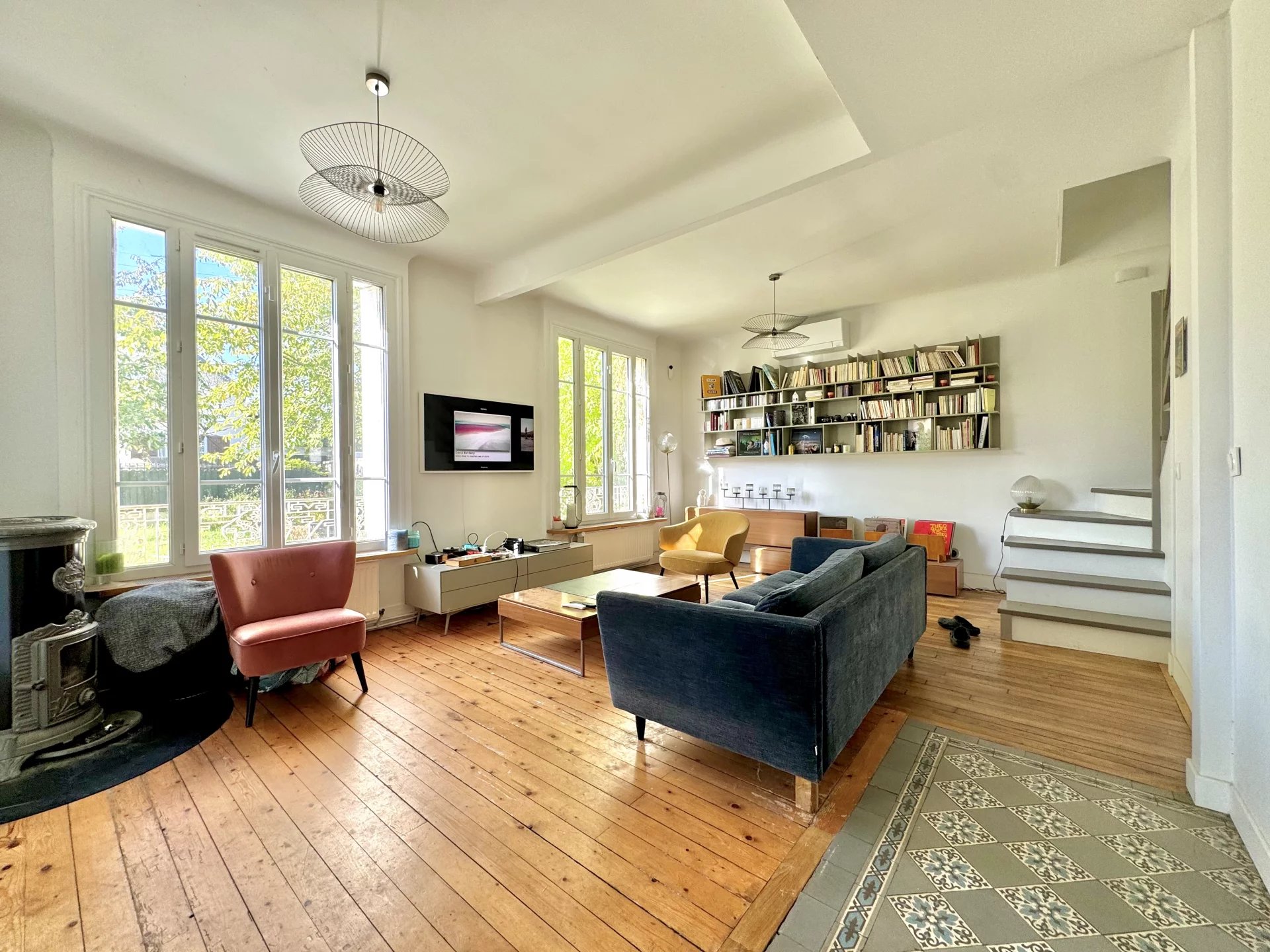 Charmante villa de 4/5 chambres, construite dans les années 1910, de 133,45 m² habitables environ, édifiée sur un terrain arboré de cerisiers : 416 m² au calme absolu, proche de l’école Anglaise, et des bords de Seine. La maison a bénéficié d’aménagements dans un esprit contemporain. Depuis l’entrée équipée d’un dressing (placards coulissants avec miroirs, WC d’invités), on découvre un beau séjour parqueté orienté ouest, de 26,59 m² env. HSP : 2,80m (poêle, parquet, murs blancs), un bureau / chambre d’amis + placards, une grande cuisine équipée au goût du jour donne sur la salle à manger agrémentée de larges baies vitrées de 14,68 m² env., en accès direct sur une grande terrasse orientée sud-est. Au premier étage : un palier dessert quatre belles chambres avec placards, deux salles de douches, WC séparés. Deux annexes dans le jardin (un garage cadastré, + un carport en bois avec prise pour véhicule électrique), une cave en accès extérieur (espace de rangement), complètent ce bien. Eléments de confort et travaux effectués en 2019 : double vitrage dans toute la maison, et baies vitrées coulissantes aluminium. Portail coulissant électrique. Pompe à chaleur réversible, chaudière au gaz Frisquet à condensation. Isolation de la toiture et de l’extension (créé en 2002), toute l’électricité, Fibre