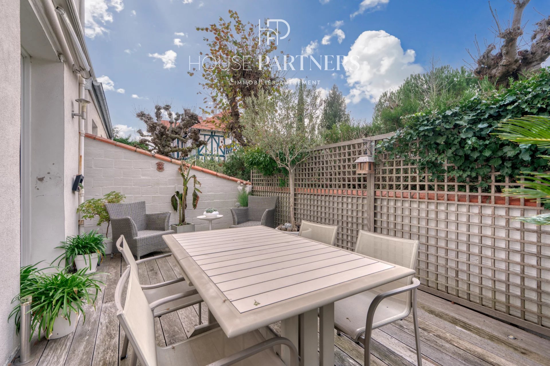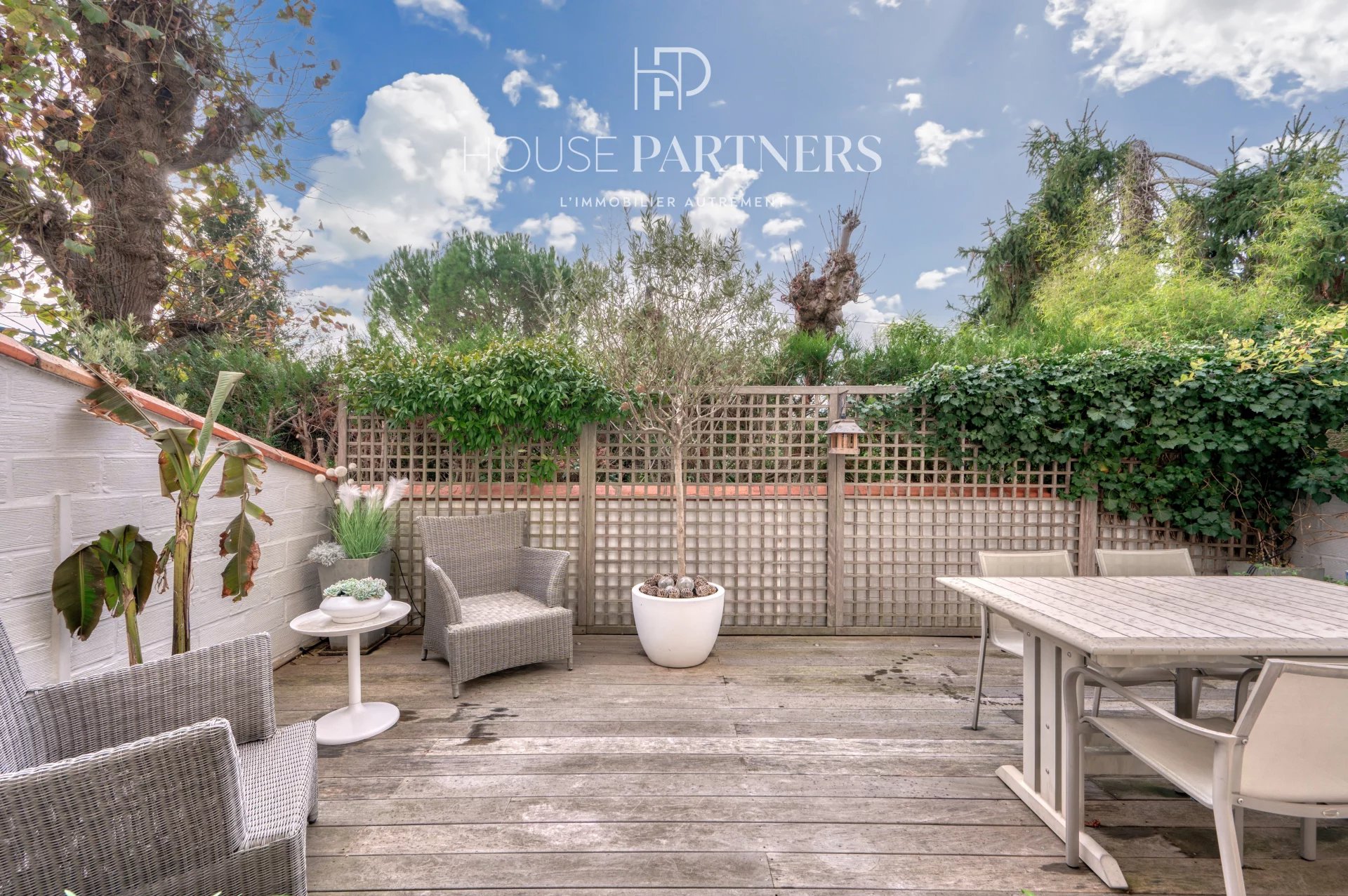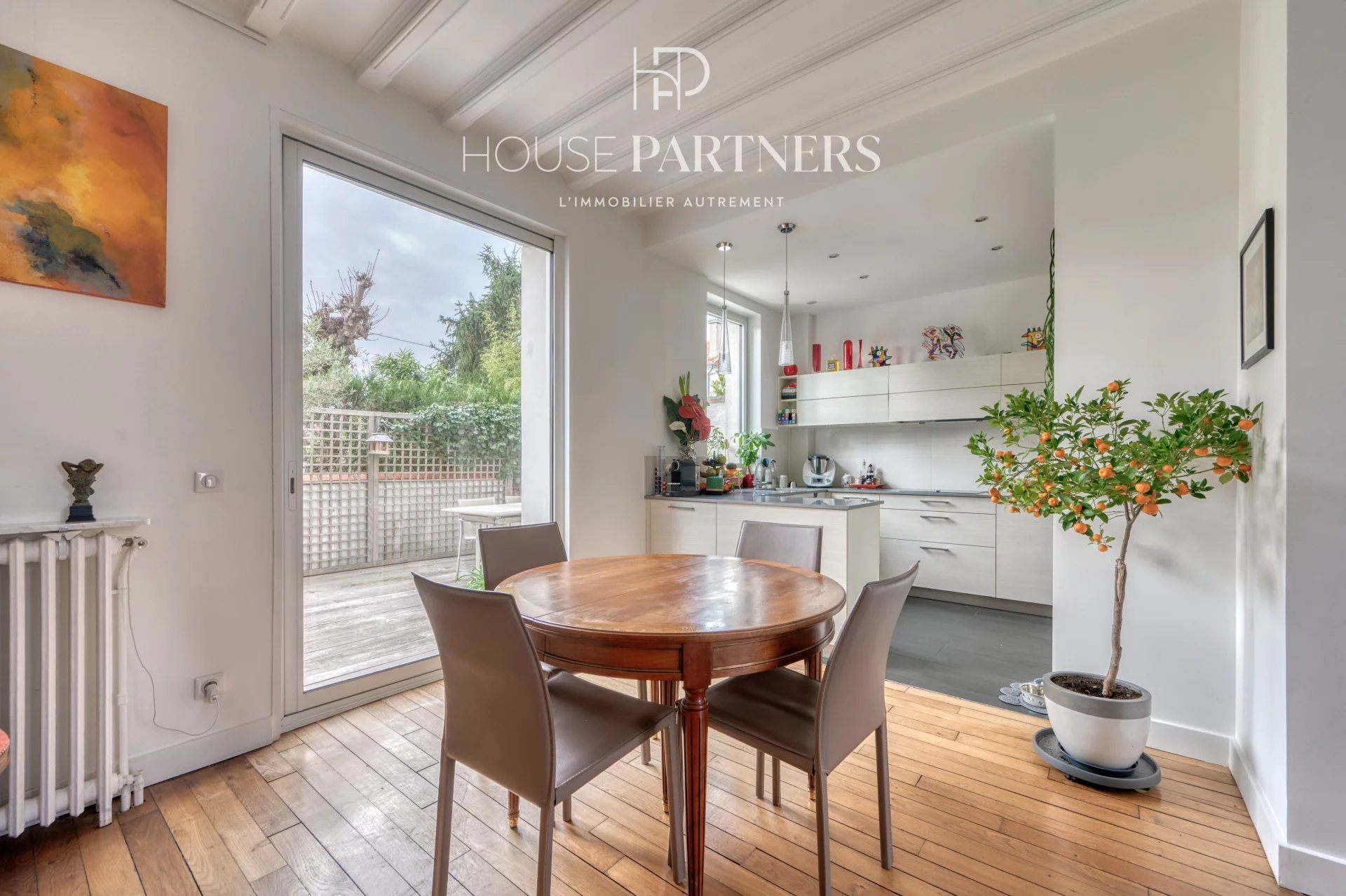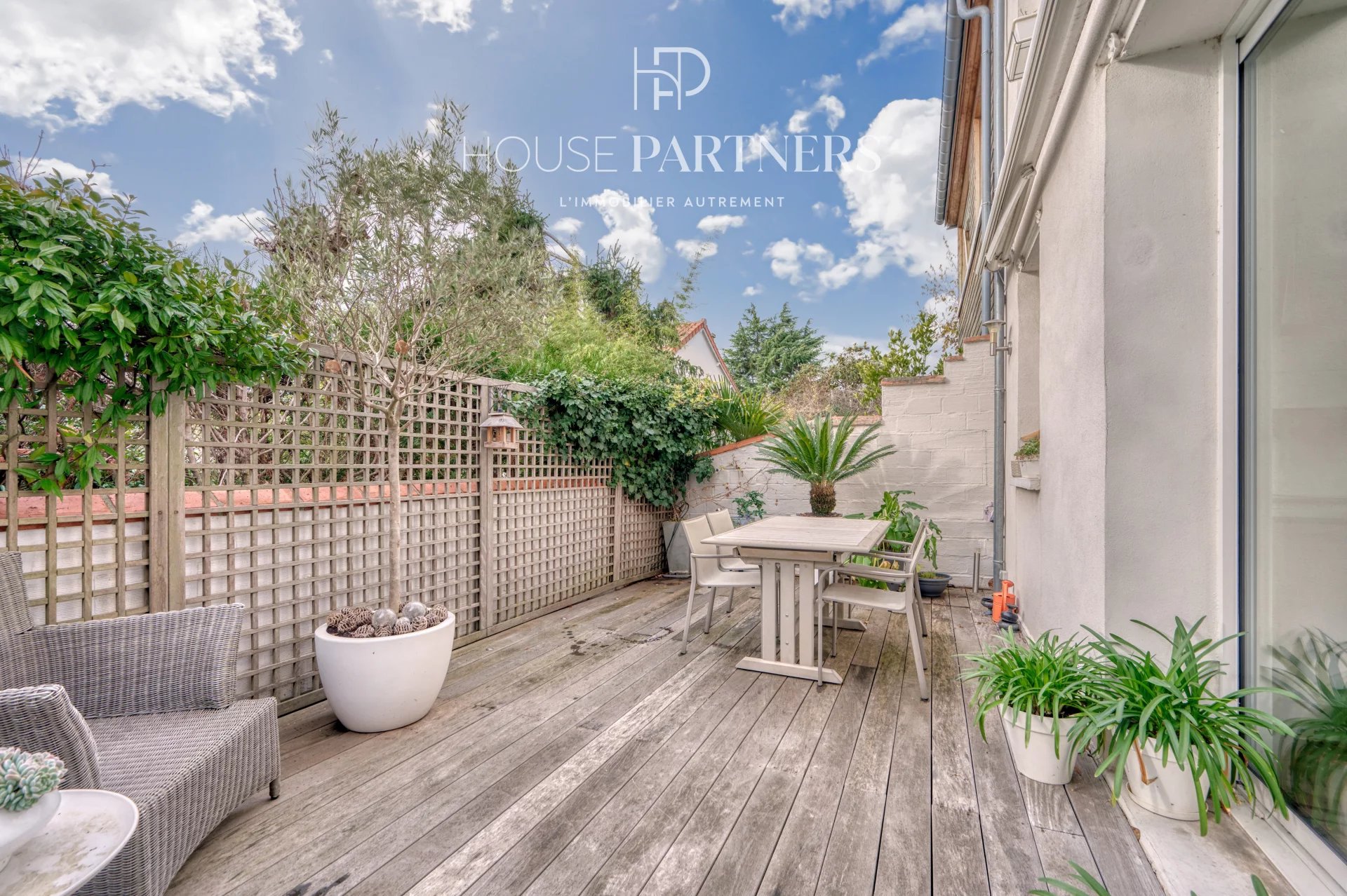 En retrait de la rue, la propriété s’ouvre sur un petit jardin d’accueil menant à une entrée dévoilant des espaces de vie lumineux, dotés d’une belle hauteur sous plafond, de moulures d’époque et d’un parquet massif, conférant un charme authentique. À l’arrière, une terrasse arborée, exposée sud-ouest et sans aucun vis-à-vis, assure un environnement particulièrement calme et agréable.