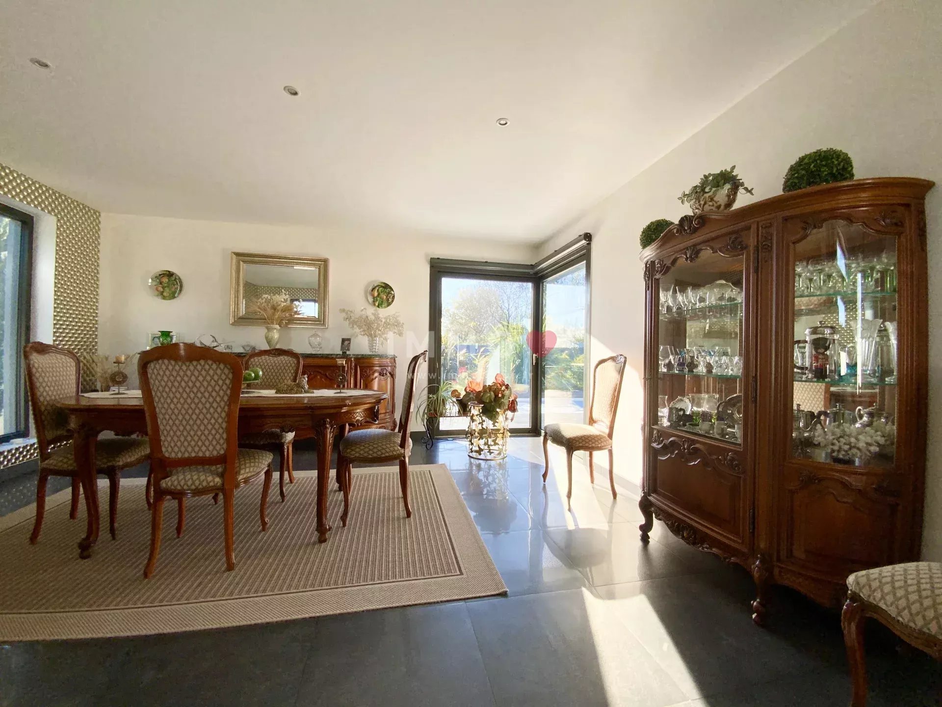 Au cœur de la maison, une vaste pièce de vie baignée de soleil grâce aux larges baies vitrées plein sud. La cuisine, moderne et parfaitement intégrée, se prolonge harmonieusement vers la salle à manger et le salon. Plus en retrait, un second salon crée un espace intime propice à la détente.