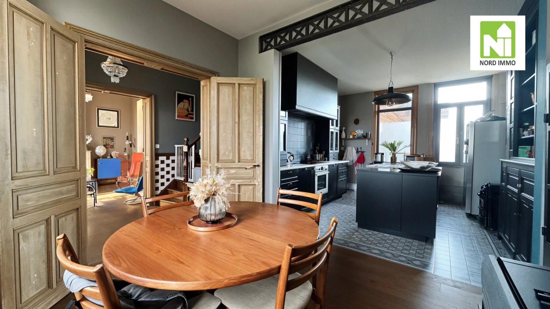 Nord Immo Pévèle vous présente à la vente cette maison de caractère de 1900, entièrement rénovée avec soin, ayant conservé tout le charme de l’ancien : parquet massif, cheminée marbre, boiseries et belles hauteurs sous plafond. Dès l’entrée, le ton est donné : authenticité et ambiance chaleureuse. Le rez-de-chaussée offre une pièce de vie traversante et baignée de lumière, avec salon équipé d’une cheminée feu de bois, un espace salle à manger avec poêle à pellets, et une cuisine entièrement équipée avec îlot central, ouverte sur l’ensemble. WC séparé. Au premier étage, accessible via un palier intermédiaire, vous trouverez trois belles chambres au parquet ancien parfaitement conservé, ainsi qu’une spacieuse salle de bain familiale avec baignoire, douche, double vasque et espace buanderie + WC intégré. Le dernier étage, niché sous les combles, accueille une véritable suite parentale de 50 m², composée d’une chambre, d’une salle de douche et d’un grand espace dressing. Extérieur : une terrasse de 80 m², idéale pour profiter des beaux jours en toute intimité.