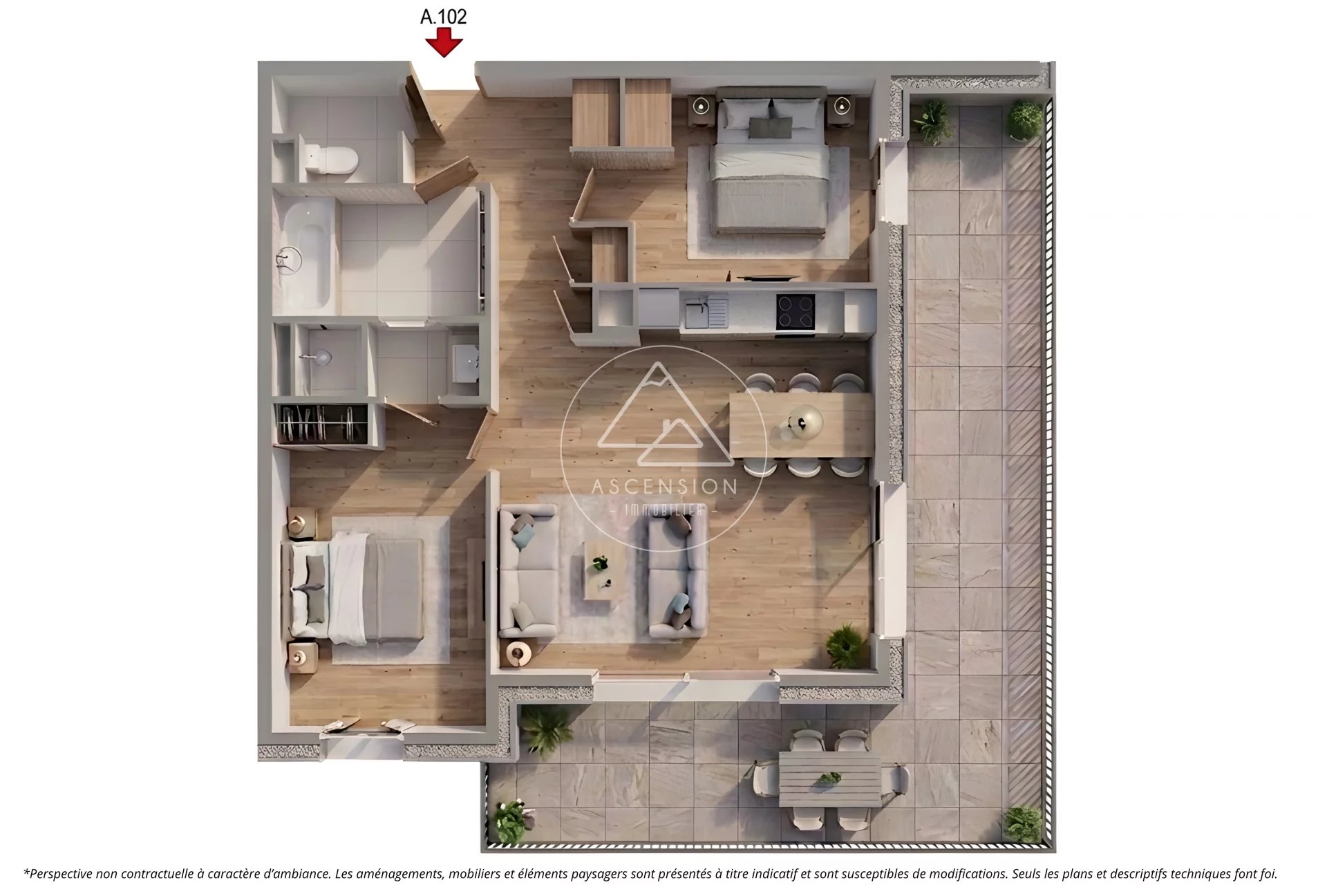 L’appartement A102 est situé au premier étage du bâtiment A et sera composé de deux chambres, un grand séjour/cuisine de 25.75 m² et de deux salles de bain et un WC séparé pour une superficie totale de 65.39 m². L’appartement dispose d’un grand balcon de plus de 30 m2.