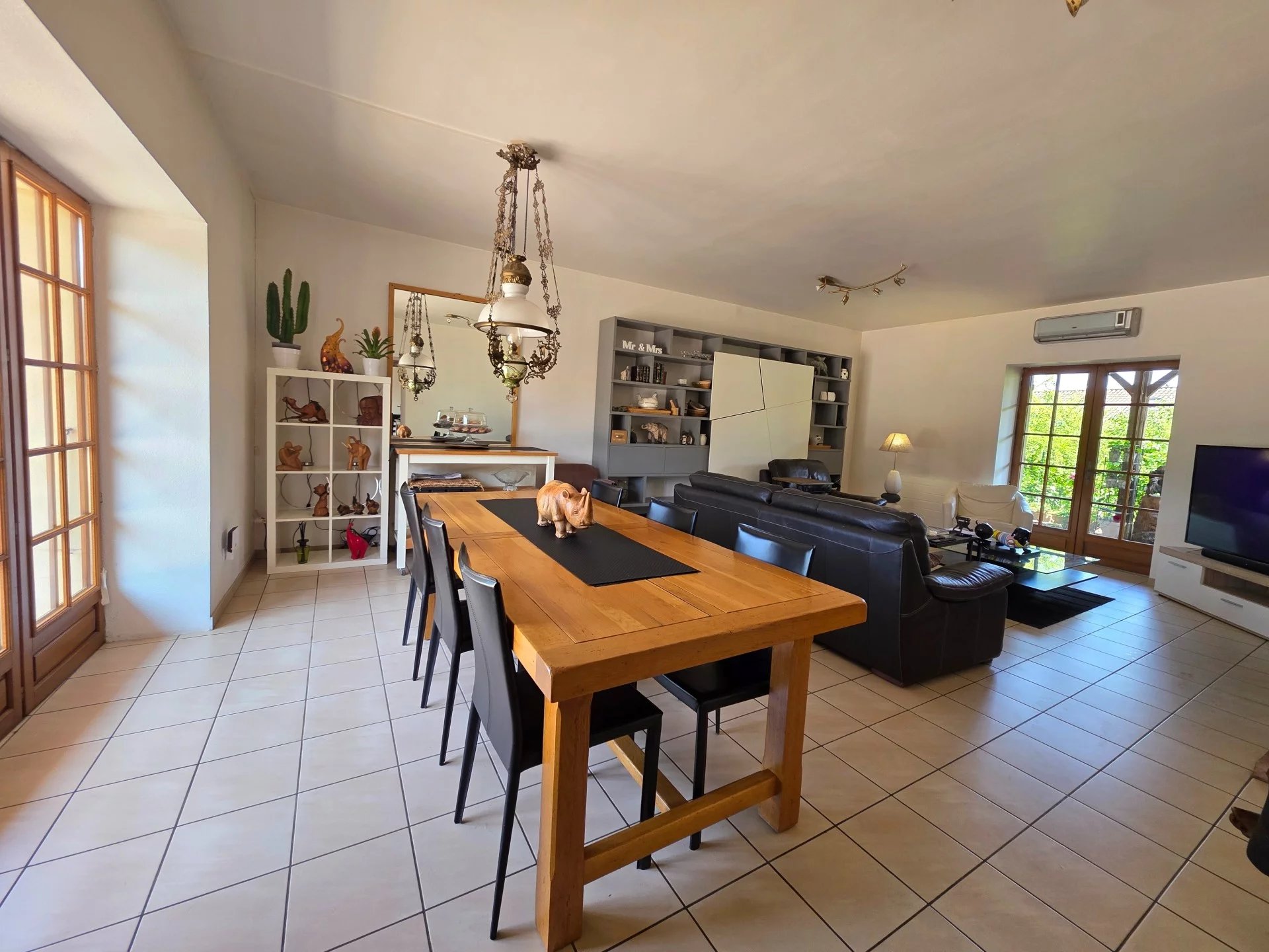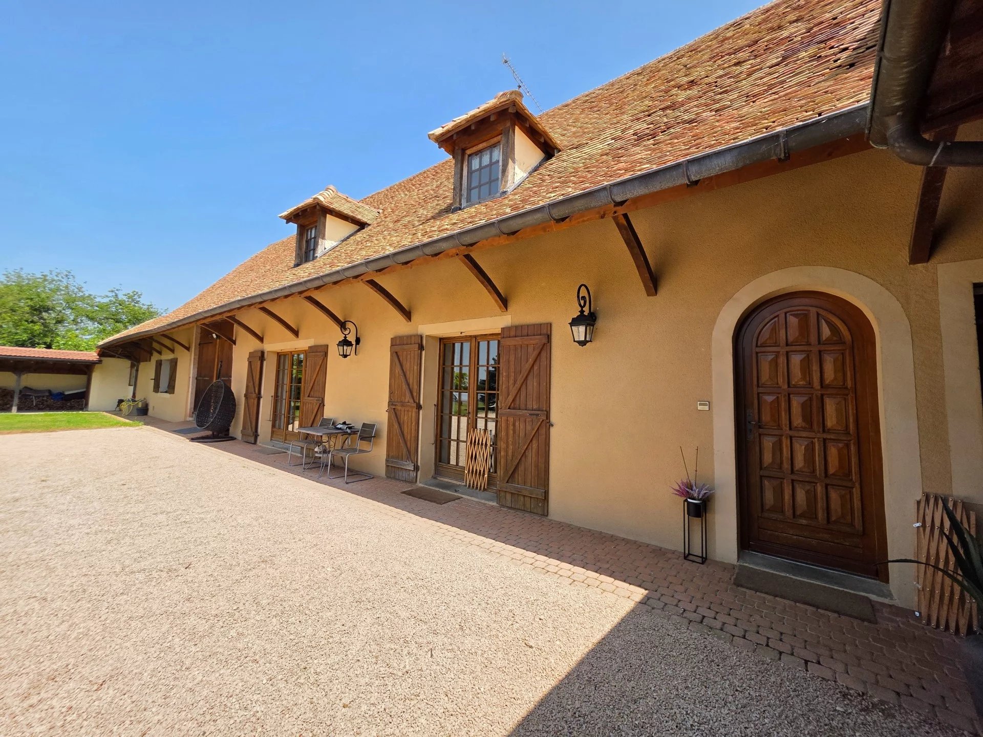 Située dans une impasse calme sur la commune dynamique de Cuisery, l'Agence des 3 Rivières vous propose en exclusivité cette propriété de caractère datant du XVIIe siècle séduit par son charme authentique et son environnement paisible. A seulement dix minutes de Tournus et de ses accès autoroutiers et ferroviaires, elle bénéficie d'un cadre de vie idéal à proximité des commodités, écoles et collège. D'une surface habitable d'environ 244 m², la maison est implantée sur un terrain clos et arboré de 3 700 m². Elle vous séduira par son caractère, ses volumes et son ambiance chaleureuse. Au rez-de-chaussée, le hall d'entrée avec plafond cathédrale et murs en pierre apparente donne immédiatement le ton. La cuisine, équipée et fonctionnelle de 20 m², présente des poutres apparentes et un accès direct vers l'extérieur, prolongée par un cellier pratique. Le salon-séjour de 40 m², traversant, profite d'une belle lumière naturelle et de deux ouvertures vers le jardin, parfait pour une vie dedans-dehors. Ce niveau comprend également une chambre, une salle d'eau avec WC et une buanderie de 6 m². A l'étage, la mezzanine de 20 m² avec poutres et plafond cathédrale dessert deux belles chambres. La première, de 17 m², équipée de placards muraux, offre confort et charme de l'ancien. La seconde, spacieuse avec ses 30 m², dispose d'un coin dressing aménagé. Depuis cette pièce, quelques marches mènent à un espace grenier surélevé, idéal comme coin jeux ou bureau. Une salle d'eau spacieuse et un WC complètent ce niveau. Côté potentiel, la maison bénéficie également de deux pièces attenantes d'environ 50 m² au total, accessibles par des entrées indépendantes. Ces espaces supplémentaires ouvrent de nombreuses possibilités selon vos besoins: logement indépendant, activité professionnelle, chambre d'hôtes, hébergement pour un parent ou un jeune. Les dépendances complètent harmonieusement l'ensemble avec deux granges de 51 m² et 73 m², un atelier, une cave ainsi que deux boxes à chevaux et de nombreux appentis, abris de jardin et piscine. La maison est équipée de menuiseries double vitrage en bois et est raccordée au tout-à-l'égout. Le chauffage est assuré par des radiateurs électriques caloporteurs et radiants, complétés par un insert bois. La toiture a été revue récemment et des aménagements ont été réalisés pour optimiser la consommation électrique. 24 panneaux solaires ont été installé ainsi qu'un vidéophone. Les extérieurs sont soignés et propices à la détente avec une piscine creusée au sel de 5 x 8 mètres et son dôme, un puits, une terrasse couverte avec pierres apparentes et espace barbecue, le tout dans un joli parc arboré offrant calme et intimité. Cette propriété pleine de charme, aux multiples possibilités, est un véritable coup de coeur pour les amoureux de l'ancien, les projets familiaux ou les envies de reconversion à la campagne. Pour plus d'informations ou pour organiser une visite, veuillez contacter L'Agence des 3 Rivières. Nous sommes à votre disposition pour répondre à toutes vos questions et vous accompagner dans votre projet immobilier. Ce bien est présenté par Adeline PERCHET de l'Agence des 3 Rivières - 03.85.42.00.52 - Saint Germain du Plain. Les informations sur les risques auxquels ce bien est exposé sont disponibles sur le site Géorisques : http://www.georisques.gouv.fr