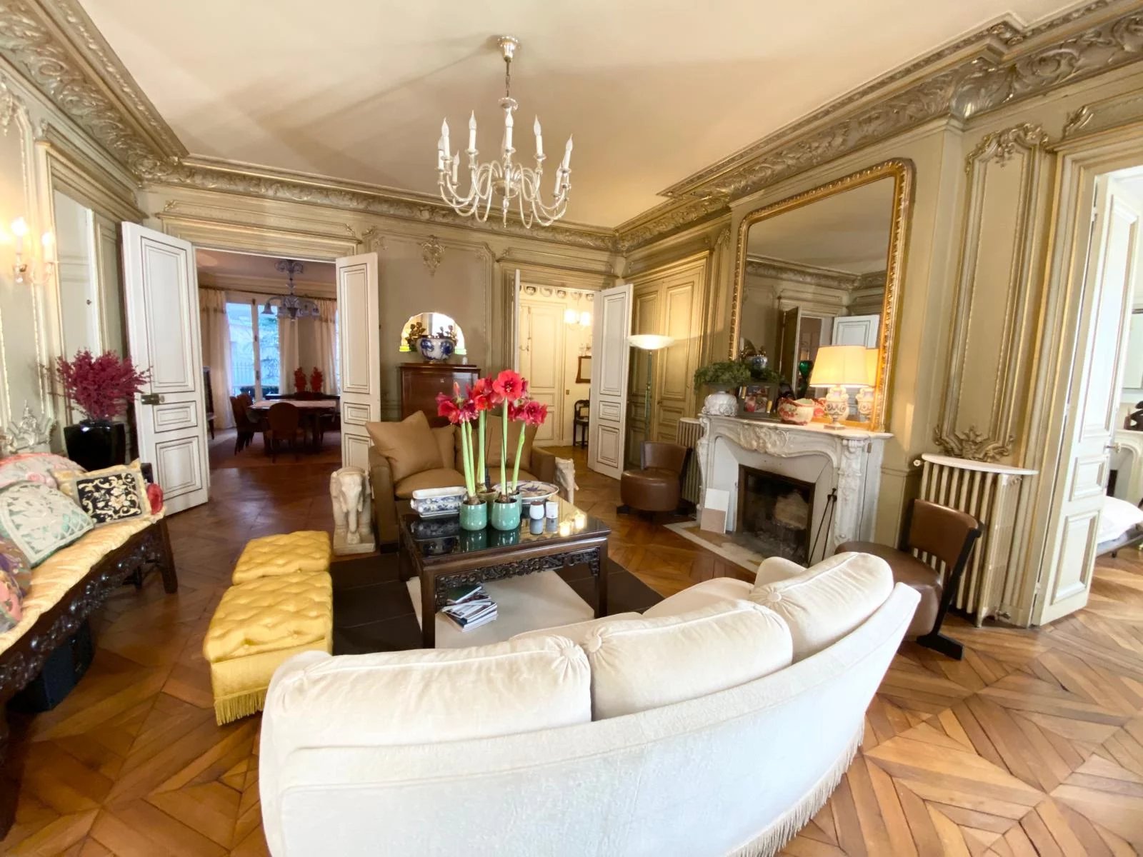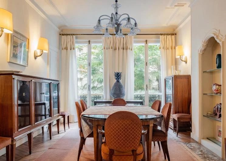 TRIANGLE d'OR - CHAILLOT L'Agence a le plaisir de vous presenter un magnifique appartement en parfait etat de 161m2 situe a l'etage noble d'un tres bel immeuble ancien. Dote de 5 pieces spacieuses, il allie confort et charme classique. Il se compose d'une galerie d'entree, un vaste salon dote d'une cheminee,une salle a manger donnant sur un joli jardin paysage, une cuisine dinatoire separee et equipee. Trois chambres dont une chambre de Maitre avec salle de douche, une deuxieme salle de bains, un bureau. L'appartement beneficie d'un plan en etoile et d'une hauteur sous plafond de 3,25m. Une cave