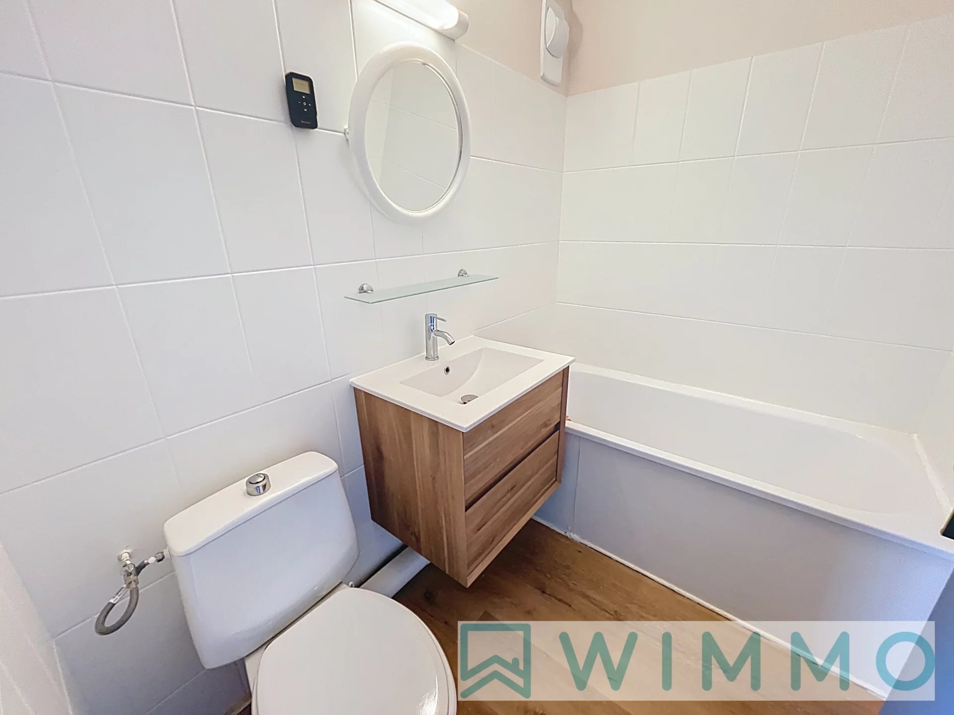 Il se compose d'une entrée avec rangements, d'une jolie pièce de vie aménagée, d'une cuisine aménagée et équipée (placards, plaque, hotte et frigo top) ainsi que d'une salle de bains avec WC.