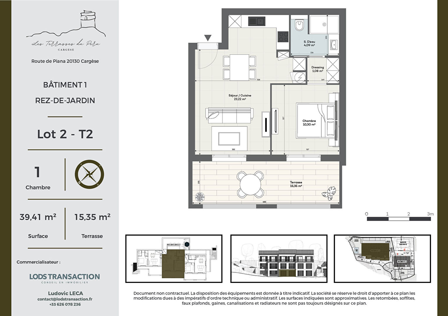 Derniers lots L'agence Lods Transaction vous présente en exclusivité à la vente une nouvelle résidence à taille humaine située au coeur du village de Cargèse. Comme son nom l'indique, les Terrasses du Peru offrent un panorama exceptionnel en surplomb de la mer tout en restant à proximité immédiate des commerces. Un projet de qualité de seulement 12 logements respectant l'architecture traditionnelle corse. Prestations soignées: grandes terrasses, double vitrage aluminium, climatisation, parking, entrée sécurisée. Lot n°1 - Bâtiment 1- Rez-de-jardin - Appartement 2 pièces 39,41m2 + Terrasse 15,35m2 Copropriété de 12 lots - dont 12 lots habitation.(Pas de procédure en cours).