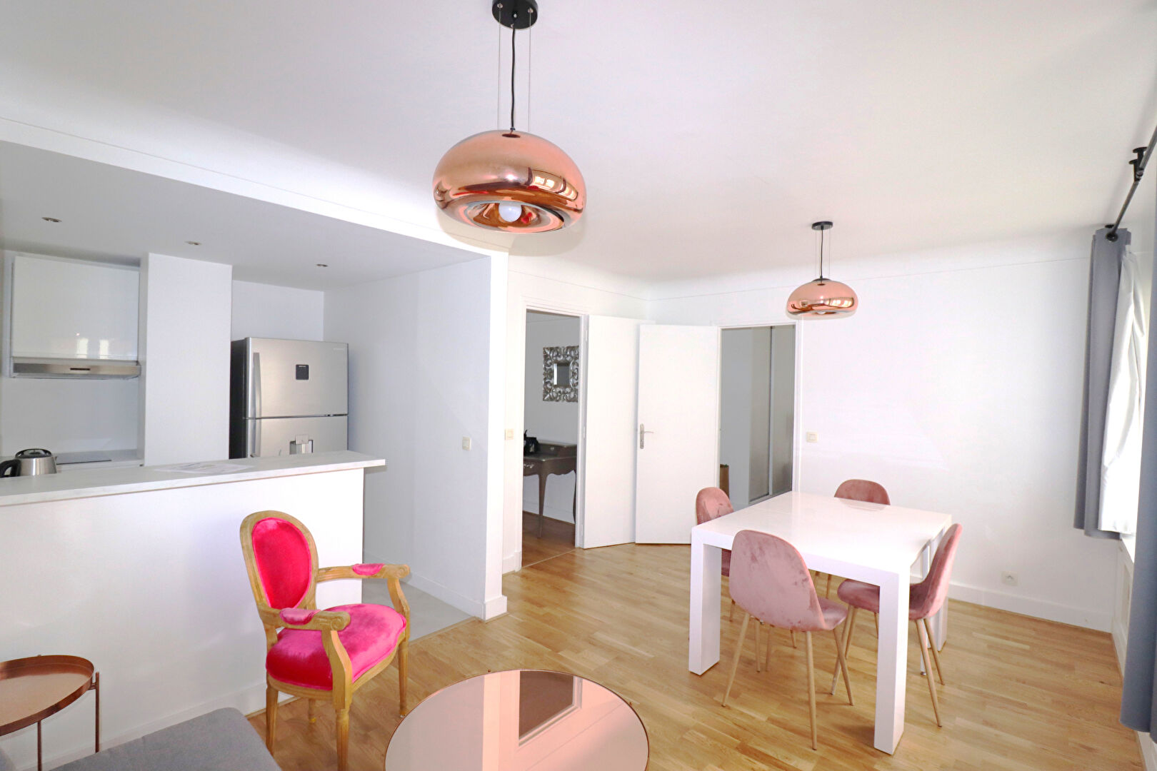 75016 - METRO PASSY à 3 minutes à pied - A LOUER MEUBLé et tout EQUIPE, ce grand 2 PIECES de 59 m2 CARREZ situé au 2ème étage par ascenseur d'un Immeuble ancien daté de 1953 avec gardien, bien entretenu et sécurisé. Il se compose de: Entrée/Séjour bénéficiant d'une cuisine américaine complètement aménagée et équipée/Chambre/Salle de bain/Buanderie proposant lave-linge et sèche-linge/Wc. Rénové . Calme et lumineux. WIFI INCLUS. Location Meublée en moyenne durée de 3 à 8