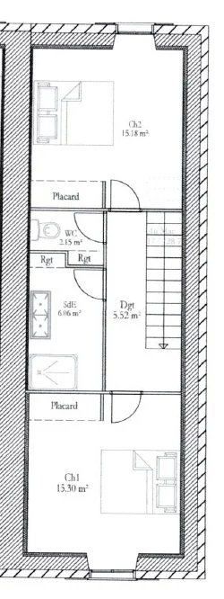 L'étage est prévu pour accueillir deux chambres, une salle d'eau, un WC séparé.