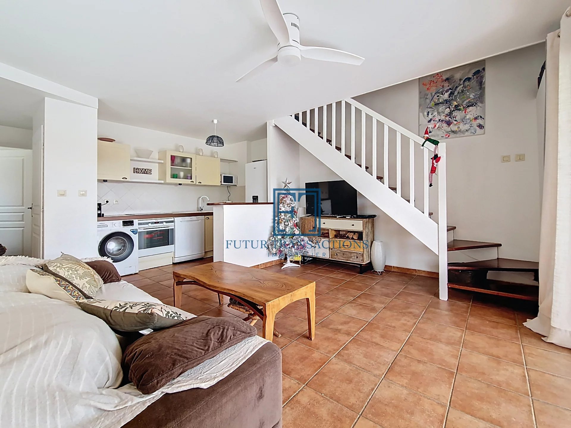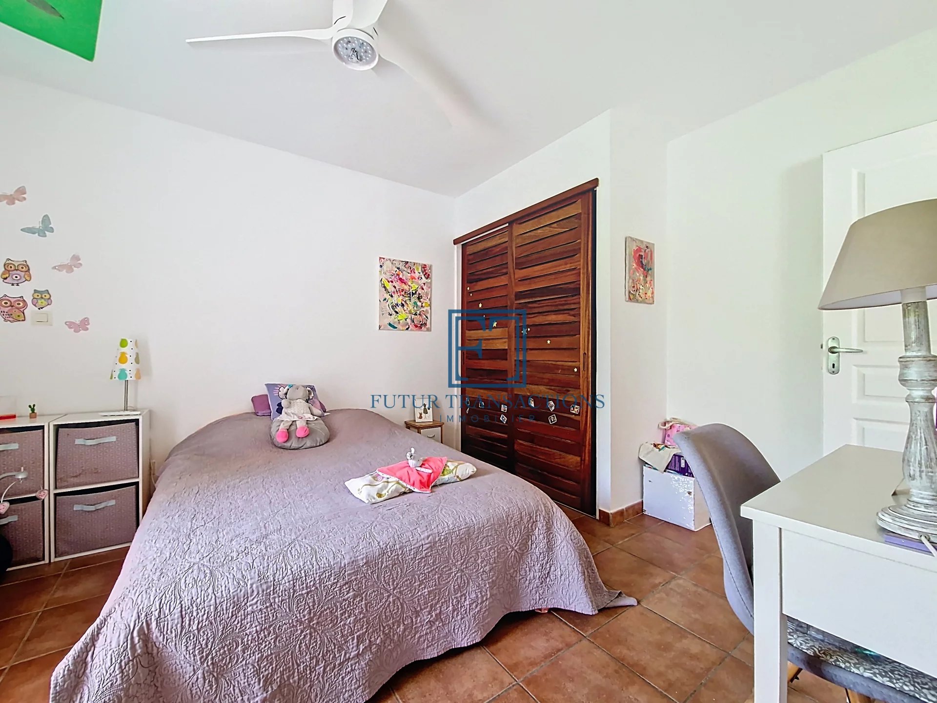 Nous vous proposons à la vente un magnifique appartement de trois pièces, situé au sein d'une résidence très prisée, sécurisée et calme, au Gosier. L'environnement est exceptionnel, niché au cœur d'un parc verdoyant et très bien entretenu, offrant une piscine et un accès direct à la plage. D'une superficie de 98 m², cet appartement en excellent état comprend : une entrée, un séjour lumineux avec une cuisine ouverte, l'ensemble donnant sur une belle varangue de 14 m² équipée d'un store champagne. On y trouve également une grande chambre avec placards, une salle de bain et un WC séparé. Au niveau supérieur : une grande suite parentale, une salle de douche avec un wc, un dressing, ainsi que de nombreux rangements. L'appartement vient d'être complètement repeint, il bénéficie de 3 climatiseurs récents et d'une citerne neuve de 300L. N'attendez plus pour venir découvrir ce cadre de vie exceptionnel et ses prestations haut de gamme. Contactez nous rapidement pour organiser une visite ! Le prix de vente comprend les honoraires charge Acquéreur : 3,5 % TTC du prix du bien hors honoraires. Prix de vente hors honoraires : 383 000 €. Le bien comprend 2 lots, et il est situé dans une copropriété de 162 lots, le montant moyen annuel de la quote-part de charge (budget prévisionnel) : 1520€ soit 152€/mois et le syndicat des copropriétaires ne fait pas l'objet d'une procédure citée à l'article L. 721-1 du code de la construction et de l'habitation). Etiquette énergétique: classe D Les informations sur les risques auxquels ce bien est exposé sont disponibles sur le site Géorisques : https://georisques.gouv.fr