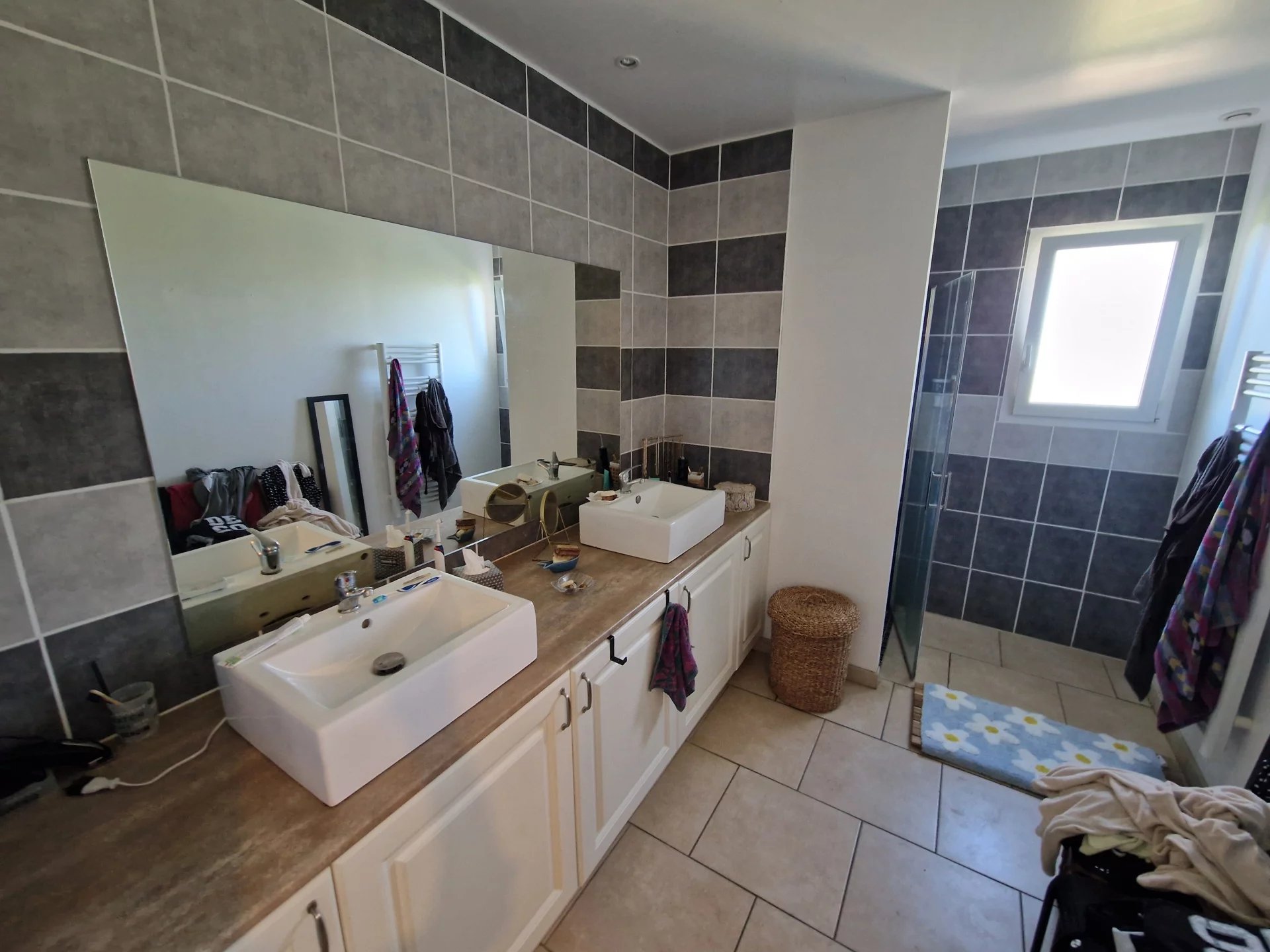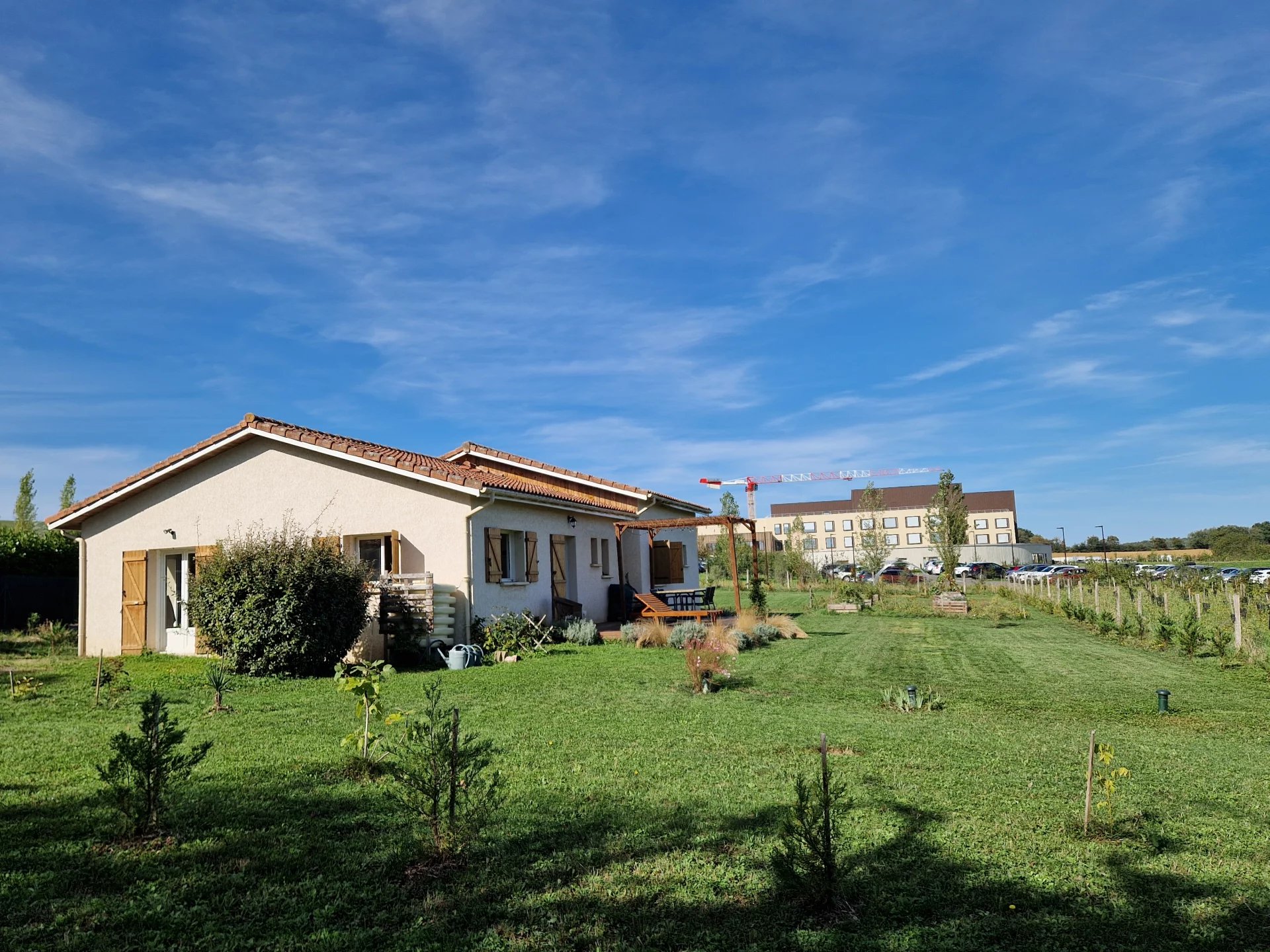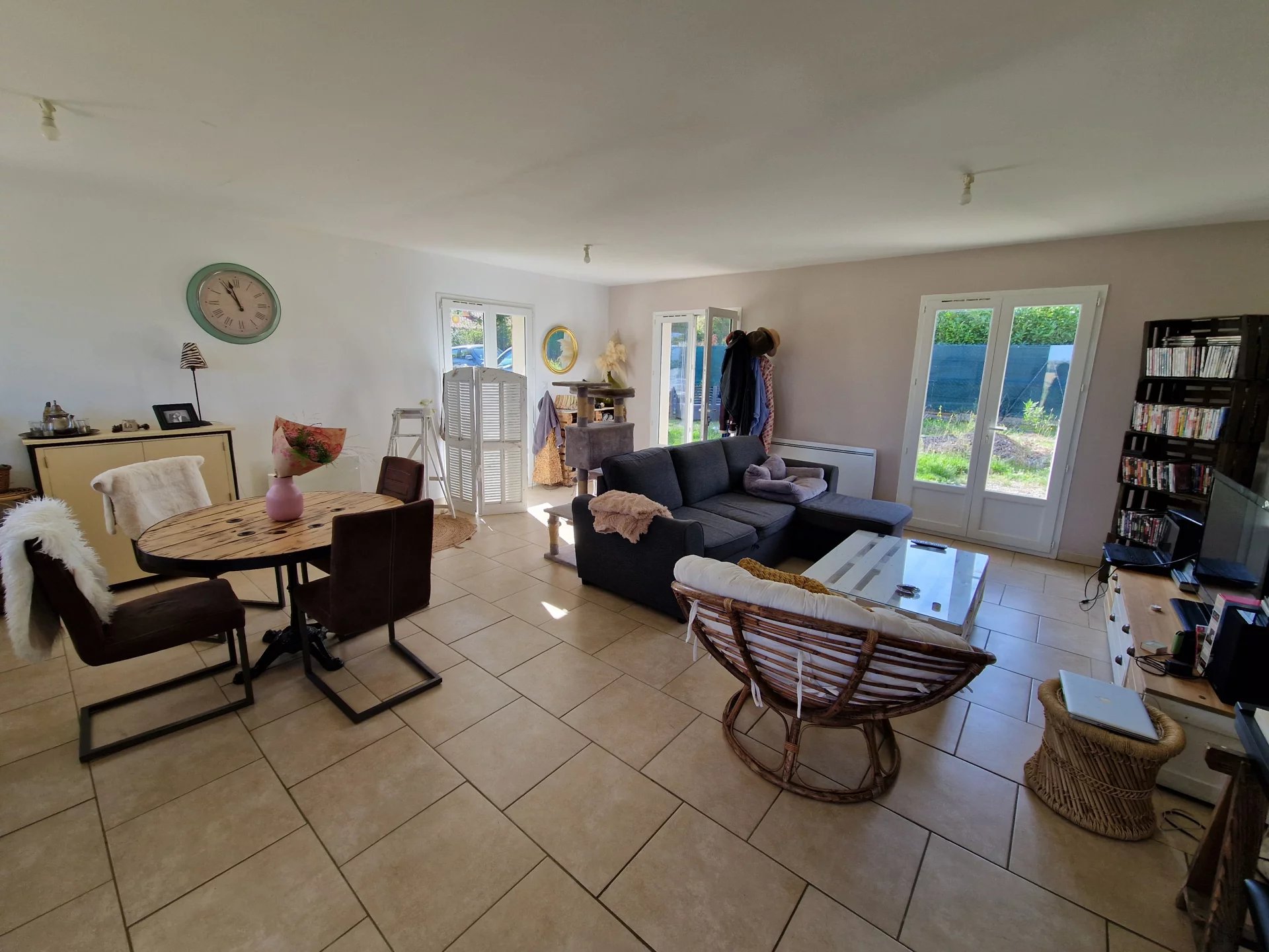 Agréable maison de plain pied Type 4 Normes RT 2012 Environ 103m² comprenant grande pièce à vivre avec cuisine ouverte équipée, accès sur agréable terrasse en bois, couloir desservant 3 chambres avec placarads, grande salle d'eau avec double vasque et sèche serviette, wc suspendu indépendant. Système de chauffage électrique et cumulus thermodynamique. Garage attenant avec buanderie et wc supplémentaire. Agréable jardin d'environ 1700m² plat.