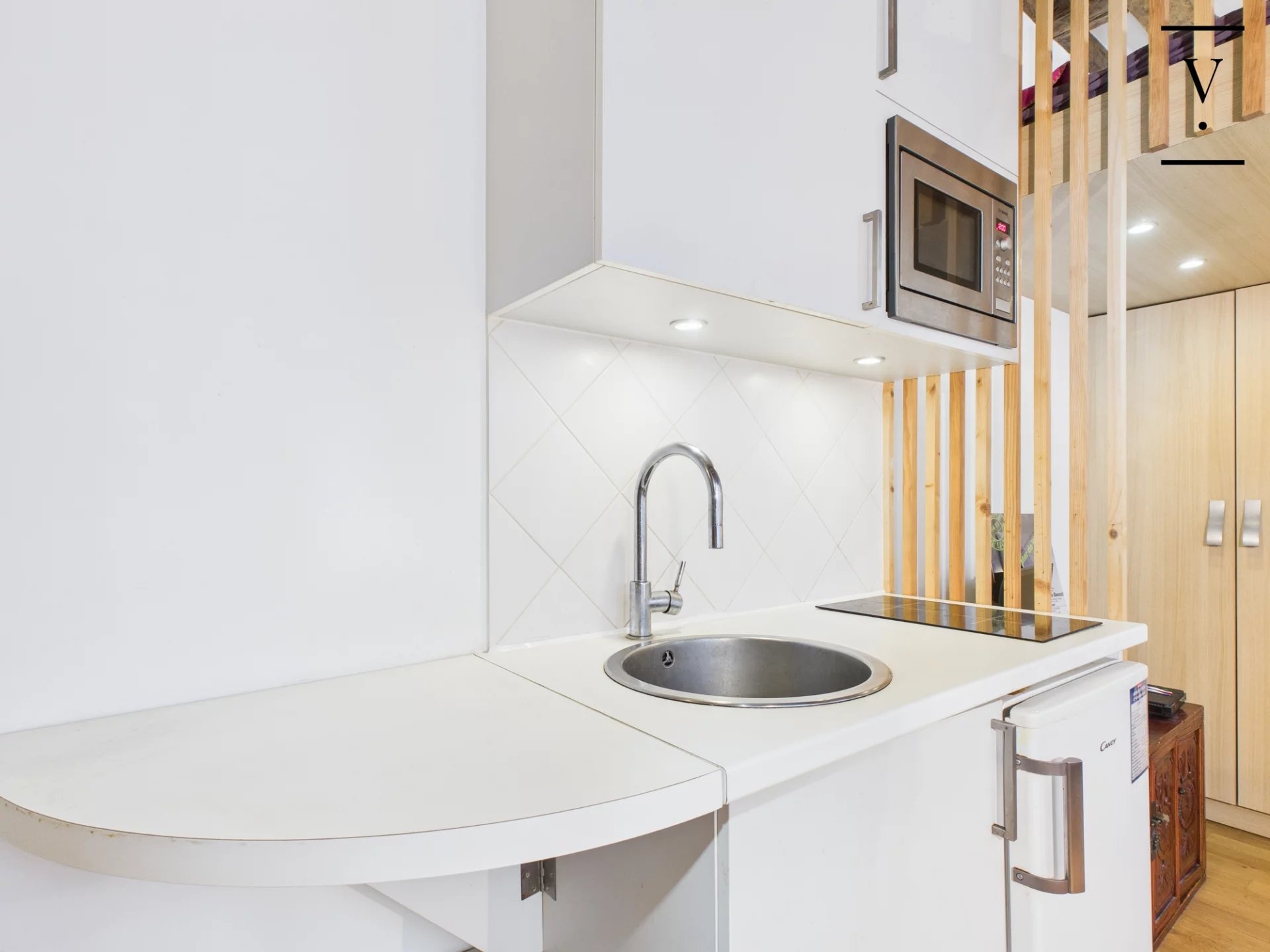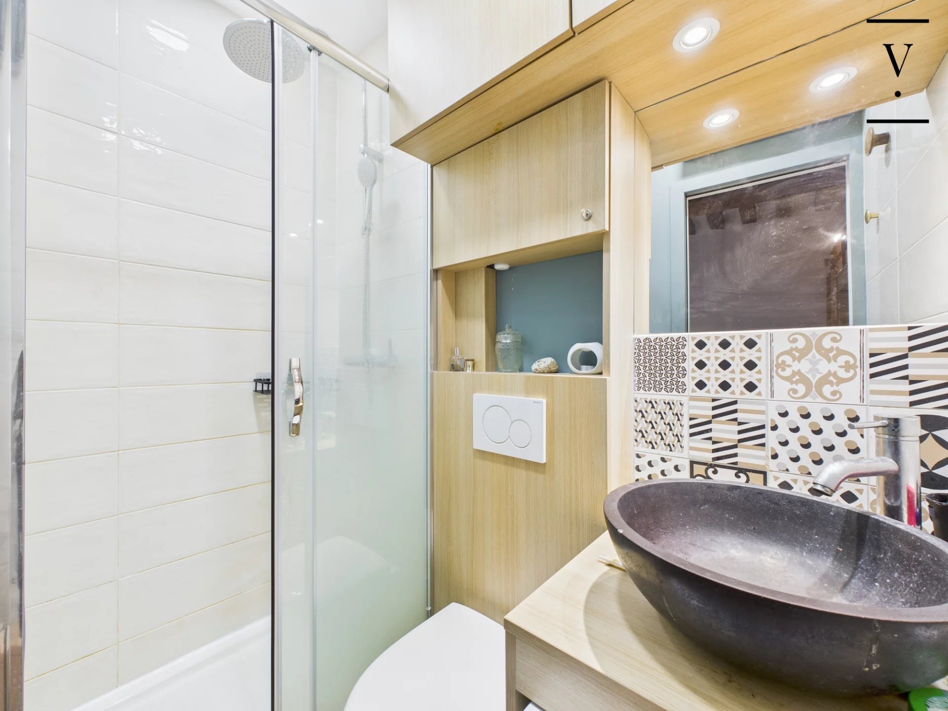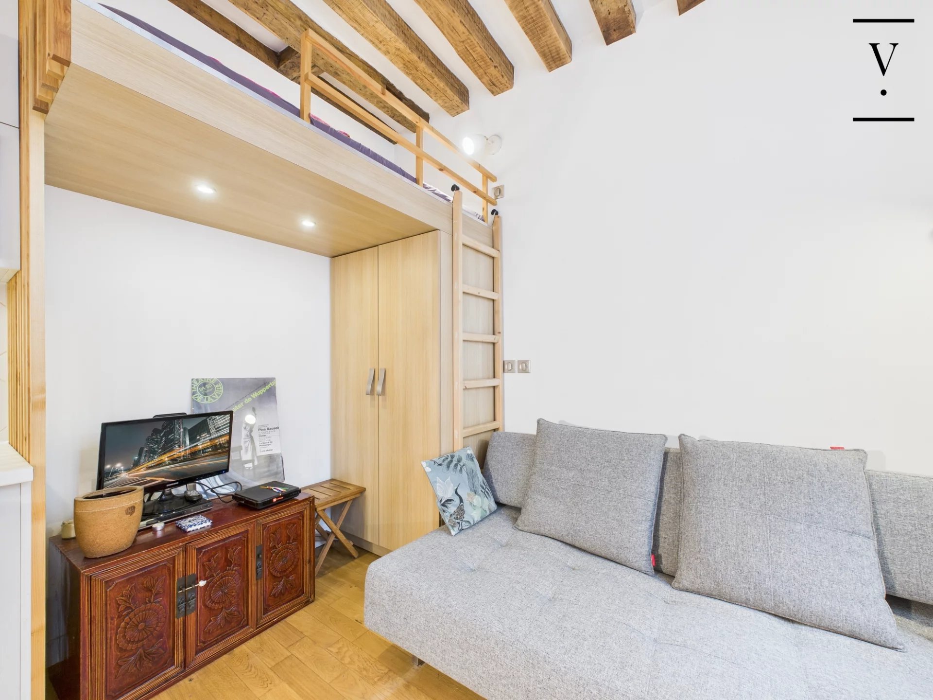 Face à l'église Saint-Paul et au métro Saint-Paul, dans un bel immeuble récemment rénové avec une toiture refaite, joli studio de 15,6 m² loi Carrez, 17 m² au sol, à vendre meublé, situé au 1er étage sur cour, accessible par escalier. Charmante pièce de vie avec cuisine ouverte, deux fenêtres donnant sur la cour, grande hauteur sous plafond de 3 mètres, poutres apparentes, salle d'eau, toilettes et machine à laver le linge. Charges : 157 € par trimestre, taxe foncière : 499 €.