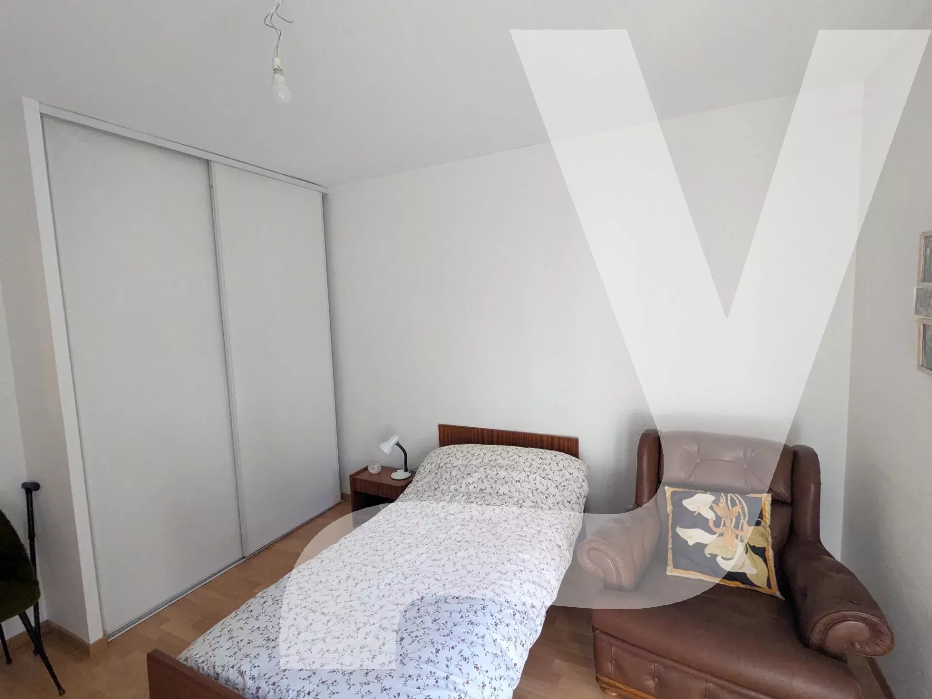 La partie nuit est accessible par un dégagement qui dessert des WC séparés, une salle d’eau entièrement rénovée avec matériaux actuels, ainsi qu’une chambre de 11 m². Cette dernière dispose d’un placard intégré et bénéficie elle aussi d’un accès direct au balcon, offrant une véritable continuité entre intérieur et extérieur.