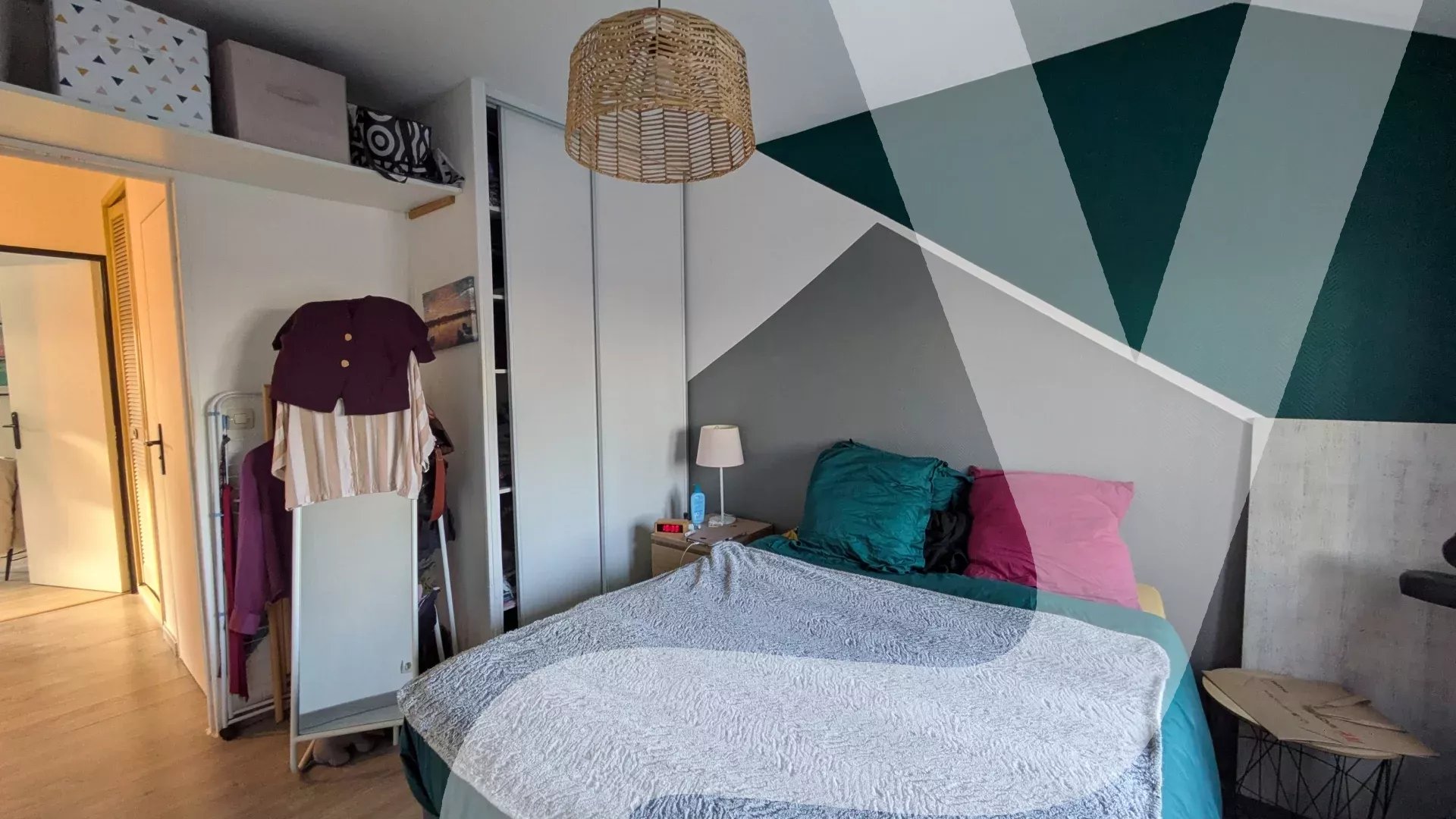 Une chambre spacieuse avec placard intégré