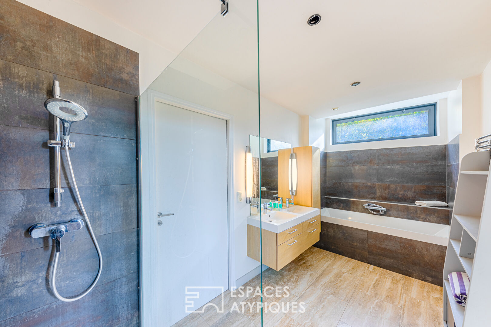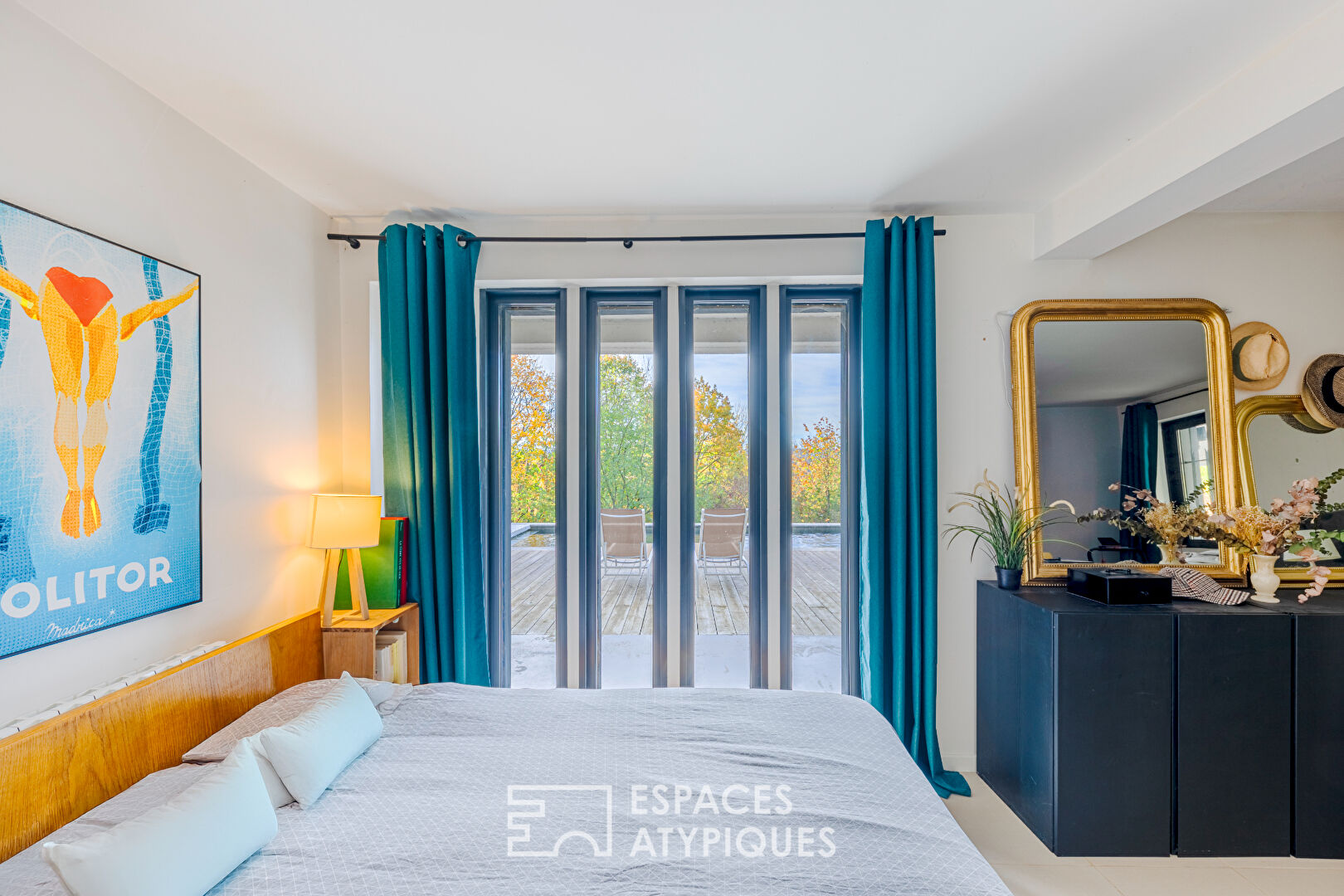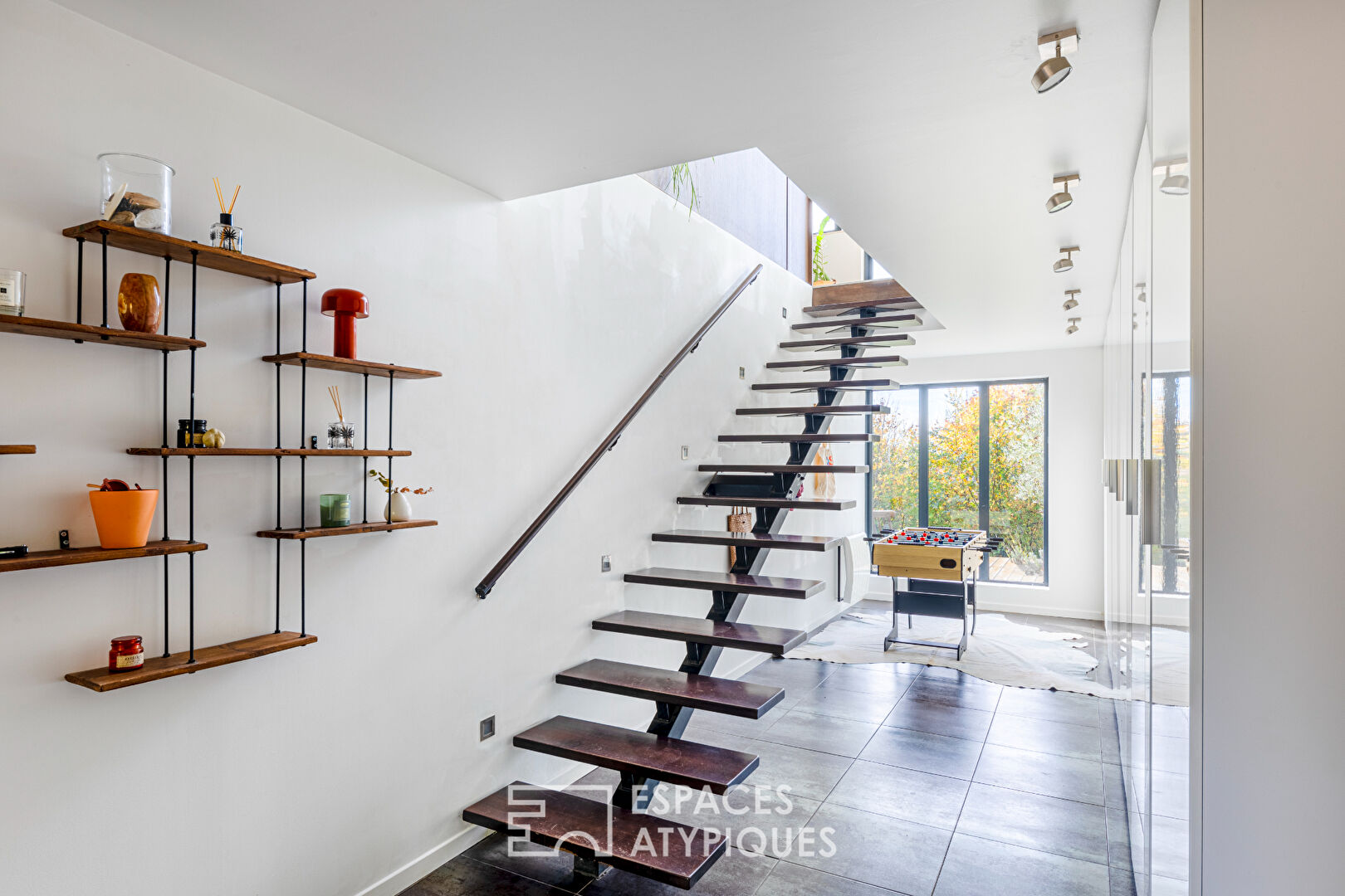 C'est sur les hauteurs de Vaux-sur-Seine, en lisière d'une forêt, que se dresse cette réalisation architecturale de 265 m². Telle une sentinelle moderniste dominant la vallée, cette villa édifiée en 2009 par l'architecte Stéphane Simonin et magnifiée en 2022 par un cabinet d'architecture d'intérieure, s'impose comme un hommage vibrant aux préceptes de la Villa Savoye. La structure, aérienne, semble flotter au-dessus de son terrain grâce à un jeu de pilotis qui désolidarise le bâti du sol, libérant ainsi les perspectives. L'accès à l'espace de vie se fait par un escalier mêlant acier et bois. A l'étage, le plan libre dévoile un volume traversant de 112 m², rythmé par une luminosité constante. Les fenêtres en bandeau cadrent le paysage et le fleuve : les murs s'effacent abolissant définitivement la frontière entre le ciel et l'habitat. Cet espace rassemble deux salons avec poêle à bois et une cuisine dînatoire conviviale, complétée par une arrière-cuisine fonctionnelle. L'aile opposée dessert deux chambres d'enfants (13 et 17 m²) partageant une salle d'eau contemporaine. L'étage supérieur, accessible par un escalier hélicoïdal - clin d'oeil au design industriel de Roger Tallon - est dédié à la suite parentale. Ce plateau de 52 m² comprend un espace bureau, un dressing et une salle de bains. Sanctuaire de bien-être, habillée de terrazzo, la baignoire y semble littéralement suspendue face à l'horizon et à la canopée automnale. En rez-de-jardin, la maison propose un espace indépendant (atelier, bureau ou chambre d'amis) ainsi que les zones techniques. La vie extérieure prend tout son sens. Abrité par les pilotis, un salon d'été et sa cuisine extérieure prolongent les soirées estivales, faisant face à une superbe piscine chauffée entourée d'une terrasse en bois exotique. Cette propriété réussit le pari rare de concilier la sérénité d'une vie en lisière de forêt et une logistique familiale d'une fluidité absolue. Pour les actifs parisiens, le luxe réside ici dans l'accessibilité : la Gare de Vaux-sur-Seine se rejoint en seulement 9 minutes à pied (700m). Oubliez le stress du stationnement matinal : une courte marche suffit pour rejoindre la ligne J (Paris Saint-Lazare en 40 min). L'arrivée prochaine du RER E (Eole) à la gare voisine de Verneuil viendra encore renforcer cette connexion stratégique vers La Défense. Maternelle, primaire, cantine et accueil de loisirs dans le village fluidifiera le quotidien. Les familles en quête d'excellence scolaire y trouveront également leur équilibre grâce à Notre-Dame des Oiseaux à Verneuil. Des liaisons directes (bus scolaire dédié) feront gagner vos enfants en autonomie. Côté nature : dès la sortie de la maison, le Massif de l'Hautil offre ses sentiers forestiers à perte de vue. La Seine, que l'on admire depuis le salon, devient votre terrain de jeu en contrebas. Les bords de Seine aménagés invitent aux promenades bucoliques le long du chemin de halage, aux footings au fil de l'eau ou aux sorties à vélo loin de l'agitation urbaine. Et pour le quotidien, le coeur de village avec ses commerces essentiels (boulangeries, épicerie, pharmacie, tabac et centre médical) facilite la vie de tous les jours, complété par le dynamisme commercial de Meulan, Verneuil et Orgeval à quelques minutes. Julie - 07 77 84 74 57 Julie VALODE RAUBER (EI) Agent Commercial - Numéro RSAC : 894 542 950 - Versailles.