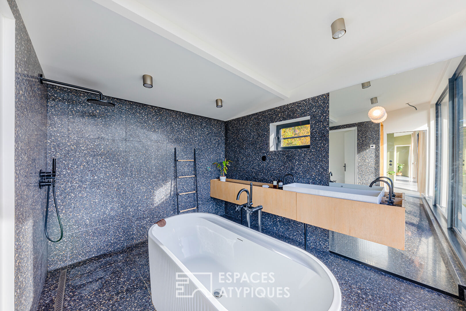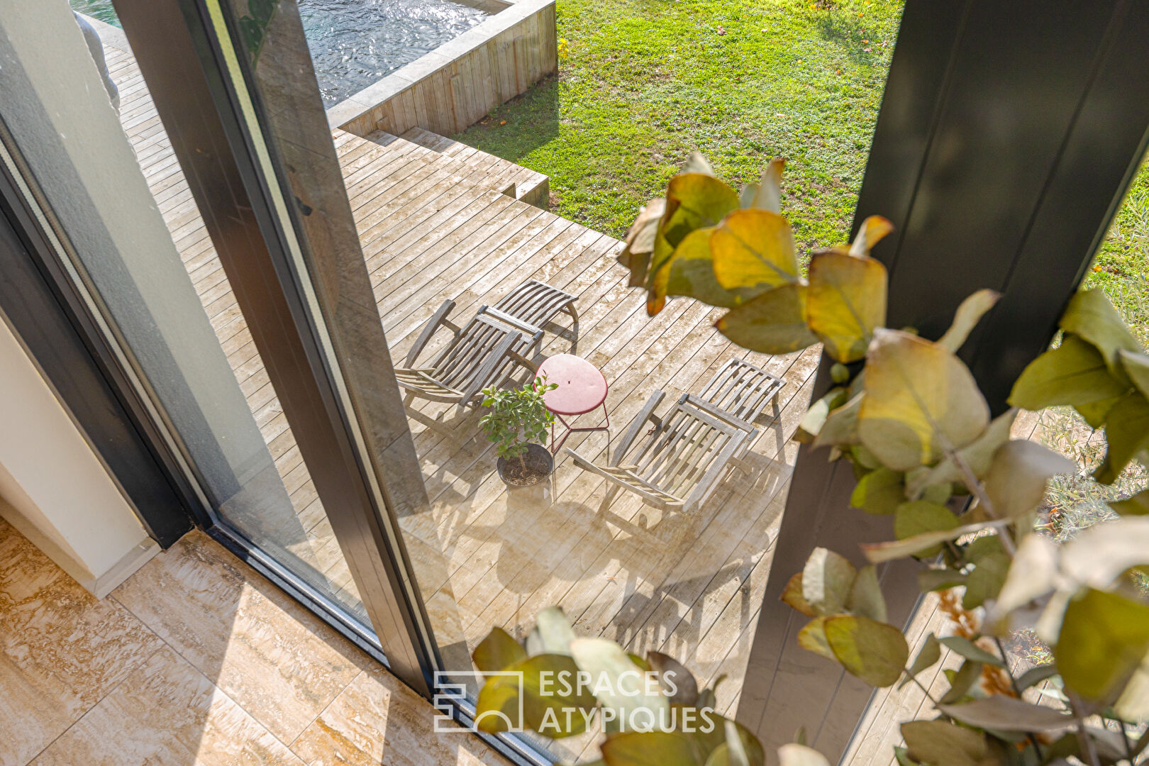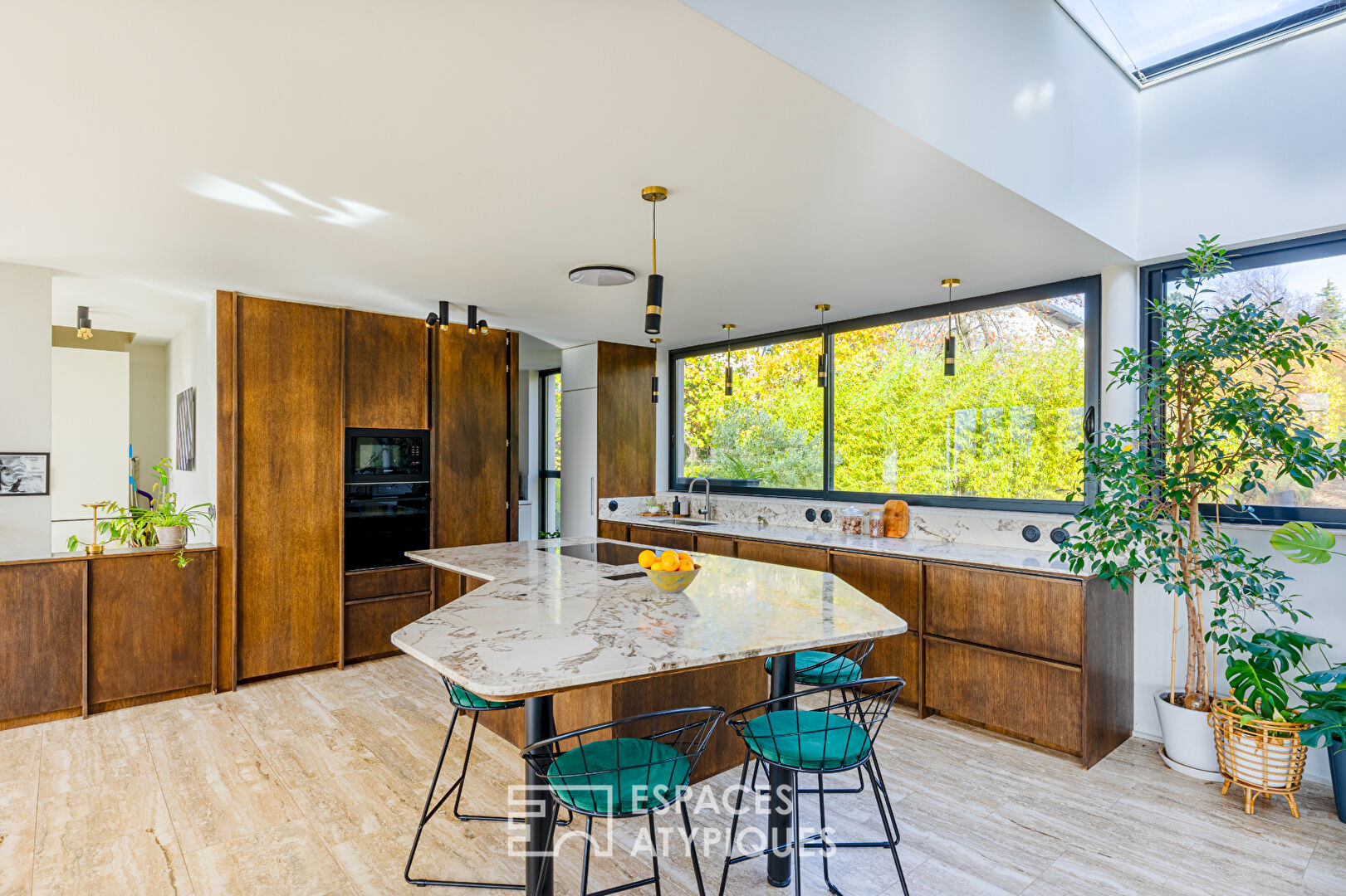 C'est sur les hauteurs de Vaux-sur-Seine, en lisière d'une forêt, que se dresse cette réalisation architecturale de 265 m². Telle une sentinelle moderniste dominant la vallée, cette villa édifiée en 2009 par l'architecte Stéphane Simonin et magnifiée en 2022 par un cabinet d'architecture d'intérieure, s'impose comme un hommage vibrant aux préceptes de la Villa Savoye. La structure, aérienne, semble flotter au-dessus de son terrain grâce à un jeu de pilotis qui désolidarise le bâti du sol, libérant ainsi les perspectives. L'accès à l'espace de vie se fait par un escalier mêlant acier et bois. A l'étage, le plan libre dévoile un volume traversant de 112 m², rythmé par une luminosité constante. Les fenêtres en bandeau cadrent le paysage et le fleuve : les murs s'effacent abolissant définitivement la frontière entre le ciel et l'habitat. Cet espace rassemble deux salons avec poêle à bois et une cuisine dînatoire conviviale, complétée par une arrière-cuisine fonctionnelle. L'aile opposée dessert deux chambres d'enfants (13 et 17 m²) partageant une salle d'eau contemporaine. L'étage supérieur, accessible par un escalier hélicoïdal - clin d'oeil au design industriel de Roger Tallon - est dédié à la suite parentale. Ce plateau de 52 m² comprend un espace bureau, un dressing et une salle de bains. Sanctuaire de bien-être, habillée de terrazzo, la baignoire y semble littéralement suspendue face à l'horizon et à la canopée automnale. En rez-de-jardin, la maison propose un espace indépendant (atelier, bureau ou chambre d'amis) ainsi que les zones techniques. La vie extérieure prend tout son sens. Abrité par les pilotis, un salon d'été et sa cuisine extérieure prolongent les soirées estivales, faisant face à une superbe piscine chauffée entourée d'une terrasse en bois exotique. Cette propriété réussit le pari rare de concilier la sérénité d'une vie en lisière de forêt et une logistique familiale d'une fluidité absolue. Pour les actifs parisiens, le luxe réside ici dans l'accessibilité : la Gare de Vaux-sur-Seine se rejoint en seulement 9 minutes à pied (700m). Oubliez le stress du stationnement matinal : une courte marche suffit pour rejoindre la ligne J (Paris Saint-Lazare en 40 min). L'arrivée prochaine du RER E (Eole) à la gare voisine de Verneuil viendra encore renforcer cette connexion stratégique vers La Défense. Maternelle, primaire, cantine et accueil de loisirs dans le village fluidifiera le quotidien. Les familles en quête d'excellence scolaire y trouveront également leur équilibre grâce à Notre-Dame des Oiseaux à Verneuil. Des liaisons directes (bus scolaire dédié) feront gagner vos enfants en autonomie. Côté nature : dès la sortie de la maison, le Massif de l'Hautil offre ses sentiers forestiers à perte de vue. La Seine, que l'on admire depuis le salon, devient votre terrain de jeu en contrebas. Les bords de Seine aménagés invitent aux promenades bucoliques le long du chemin de halage, aux footings au fil de l'eau ou aux sorties à vélo loin de l'agitation urbaine. Et pour le quotidien, le coeur de village avec ses commerces essentiels (boulangeries, épicerie, pharmacie, tabac et centre médical) facilite la vie de tous les jours, complété par le dynamisme commercial de Meulan, Verneuil et Orgeval à quelques minutes. Julie - 07 77 84 74 57 Julie VALODE RAUBER (EI) Agent Commercial - Numéro RSAC : 894 542 950 - Versailles.