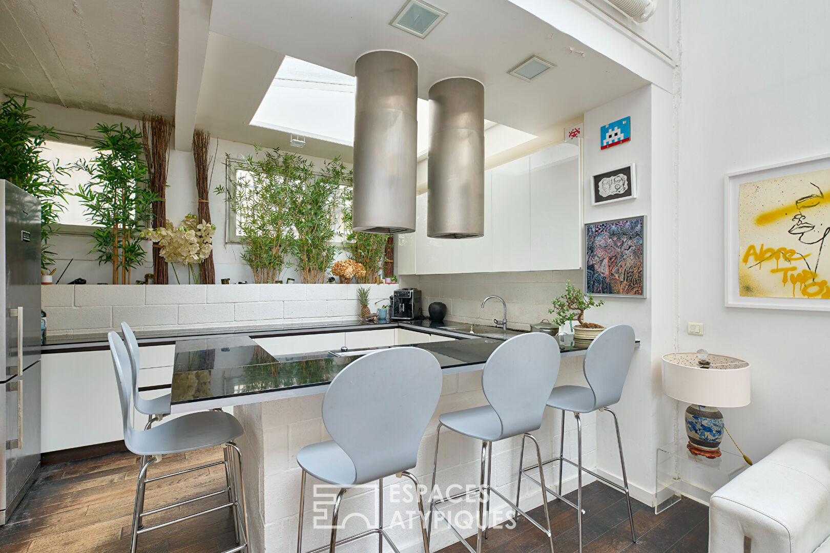 A proximité du cimetière de Montmartre, cet ancien laboratoire pharmaceutique a été transformé en un loft familial de 194,4 m² (181,30 m² Carrez). Seul à l'étage desservi par un ascenseur, l'appartement s'ouvre sur une galerie d'entrée qui mène à une vaste pièce de vie de 55 m², baignée de lumière, notamment grâce à la grande verrière zénithale culminant à 5,50 mètres de hauteur. La cuisine ouverte est entièrement aménagée et équipée. Ce niveau accueille également une suite parentale de près de 40 m² comprenant une vaste et lumineuse chambre dotée d'un mur entier de placards-dressing sur mesure sur 3m90 de hauteur, et d'une salle de bains avec toilettes (possibilité de créer deux chambres pour avoir un total de 5 chambres selon le besoin). Deux grandes chambres avec mezzanine d'environ 20 m2 chacune se partagent une seconde salle de bains avec toilettes. Depuis le séjour, un escalier descend au niveau inférieur de 33 m2 comprenant une grande chambre accompagnée d'un coin bureau, suivie d'une salle de douche avec toilettes. Ce bien climatisé soumis au régime de copropriété se situe dans le quartier des Grandes Carrières, entre la place de Clichy et le secteur des Épinettes, à moins de dix minutes à pied des Abbesses et des Batignolles. Chauffage compris dans les charges. Métro La Fourche (Ligne 13) Contact : Fabrice +33 7 86 75 71 32 Copropriété de 11 lots - dont 11 lots habitation. (Pas de procédure en cours). Charges annuelles : 9500 euros. FABRICE DERRIEN (EI) Agent Commercial - Numéro RSAC : 951 254 671 - PARIS.