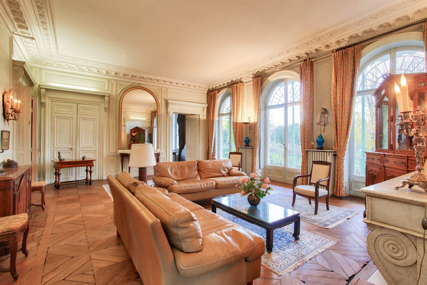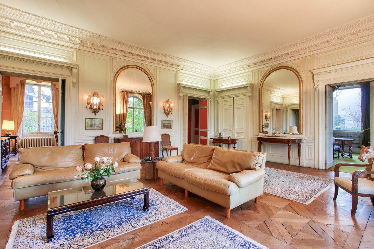 Cet appartement occupe le rez-de-chaussée de la Maison des Colonnes, érigée en 1826 par l'architecte Auguste Jean-Marie Guénepin sur le domaine de l'ancien Château de Bellevue. Il se caractérise par son agencement de plain pied, ses plafonds remarquablement élevés ornés de moulures et ses parquets en chêne d'époque. L'entrée donne accès à une somptueuse pièce de vie/salon avec cheminée en marbre, de grandes portes-fenêtres ouvrent sur une terrasse pour descendre dans le parc et le jardin privatif. Un bureau/chambre avec une double exposition est situé en enfilade du salon qui ouvre également sur une grande salle à manger. L'espace nuit avec d'un côté une spacieuse suite parentale avec salle de bains, dressing et wc séparés et de l'autre côté deux chambres. Depuis l'entrée on accède à la cuisine et son arrière cuisine qui mène à une terrasse exposée sud-est, une chambre de service, des wc, une salle d'eau avec accès indépendant . Au sous-sol une vaste cave avec fenêtres et une cave à vins. Jardin privatif de 380 m² en plus du grand parc commun aux 3 appartements de la copropriété. Possibilité de se garer sur le terrain. (4.00 % honoraires TTC à la charge de l'acquéreur.) Copropriété de 3 lots. Charges annuelles : 8250 euros.