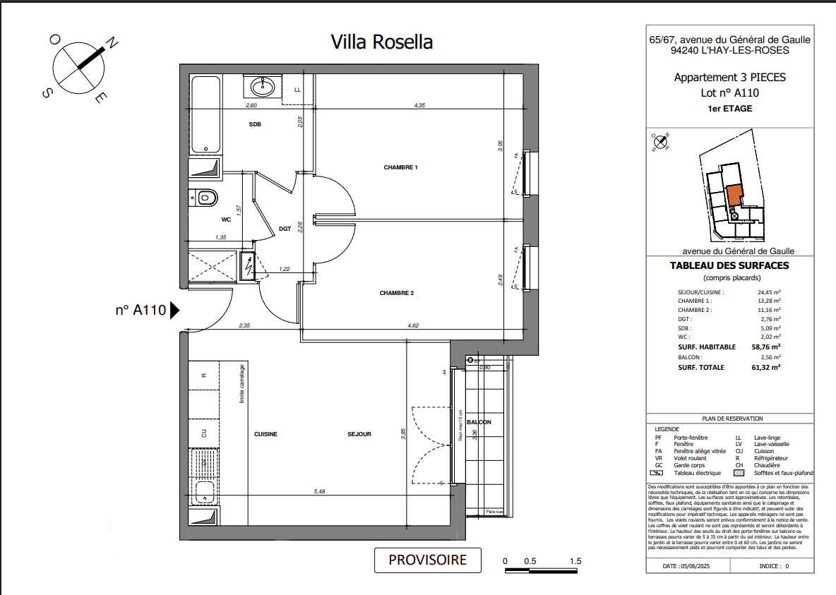 Situé au coeur de la résidence "Villa Rosella" à L'Haÿ-les-Roses, cet appartement 3 pièces, situé au 1er étage, offre une surface habitable de 58,76 m² et un agencement étudié pour allier confort et fonctionnalité. Il se compose d'un Séjour/Cuisine de 24,45 m², offrant une belle profondeur et une excellente luminosité grâce à sa large ouverture sur l'extérieur. L'espace cuisine, intelligemment intégré, permet une organisation fluide et conviviale. La Chambre 1, d'une surface de 13,28 m², constitue un espace nuit agréable et facilement aménageable. La Chambre 2, de 11,16 m², offre un second espace nuit idéal pour accueillir enfants, invités ou bureau. La Salle de bains, de 5,09 m², et le WC séparé de 2,02 m² sont conçus pour répondre parfaitement aux besoins du quotidien. Un dégagement de 2,76 m² complète l'aménagement, facilitant la circulation entre les espaces. Le véritable atout de cet appartement est son balcon privatif de 2,56 m², offrant un espace extérieur idéal pour profiter des beaux jours en toute tranquillité. Avec une surface totale (SURF. TOTALE) de 61,32 m², ce 3 pièces combine clarté, confort et praticité, au sein d'une résidence moderne et idéalement située à proximité des commodités de L'Haÿ-les-Roses. Nos conseillers sont à votre disposition pour toute information complémentaire