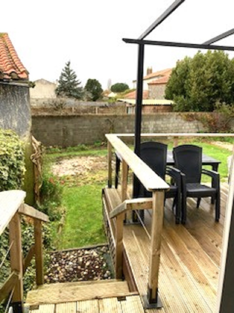 Centre bourg Nieul Le Dolent, maison sur sous-sol total de 100m² environ comprenant 3 chambres rénovées, un salon/séjour avec cheminée insert, une grande cuisine équipée et aménagée , salle d'eau, wc. Une terrasse extérieure bois sur terrain clos de 426m². Menuiseries PVC avec volets roulants manuels, une belle porte d'entrée, chauffage fioul par radiateurs fonte. Tous commerces et écoles à pieds. (4.35 % honoraires TTC à la charge de l'acquéreur.)