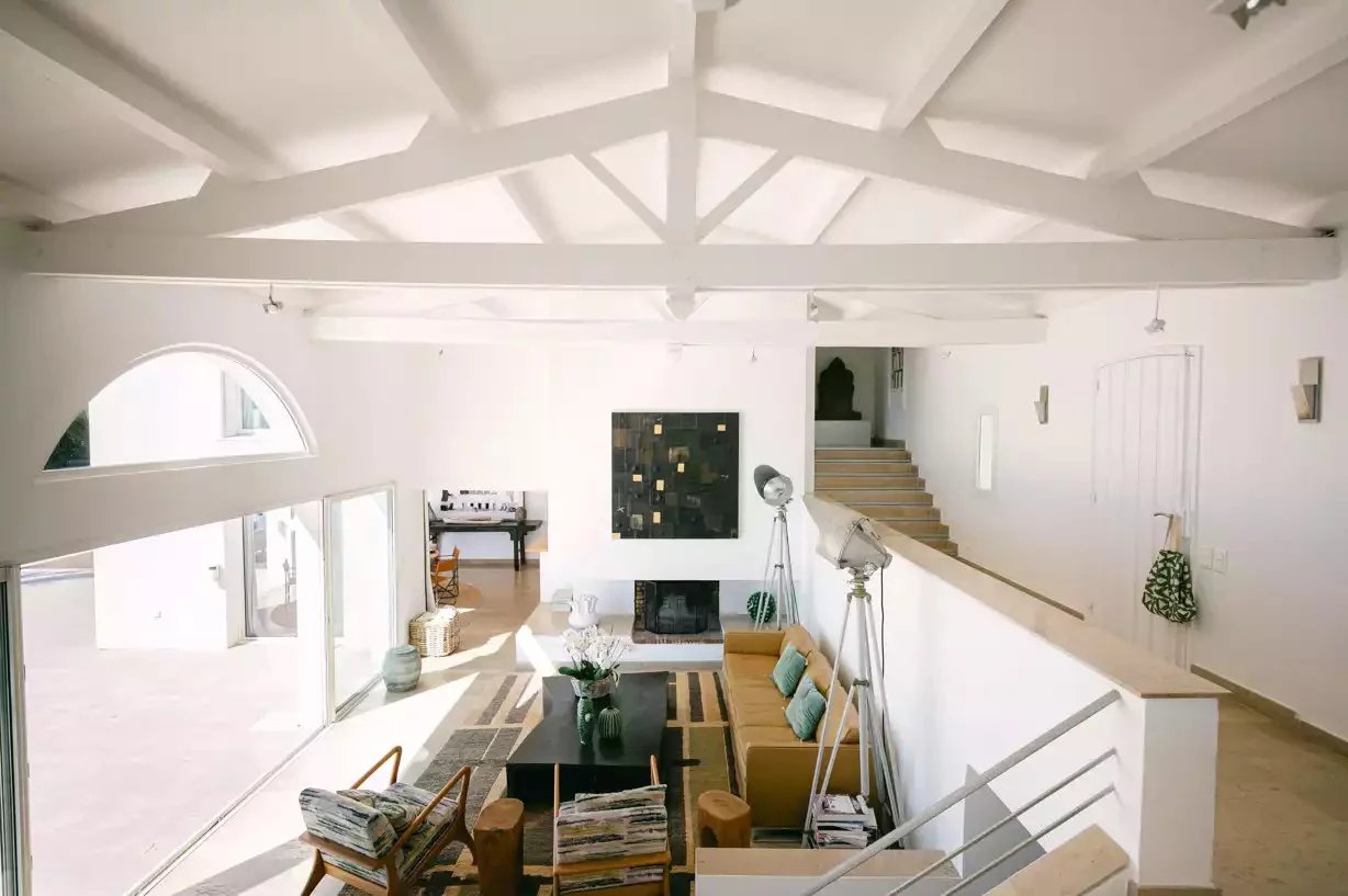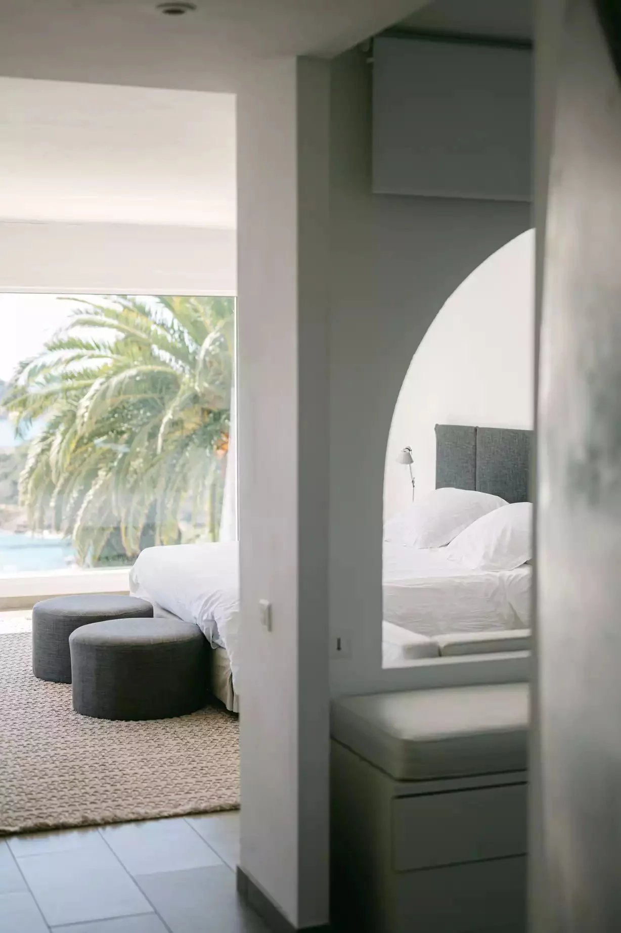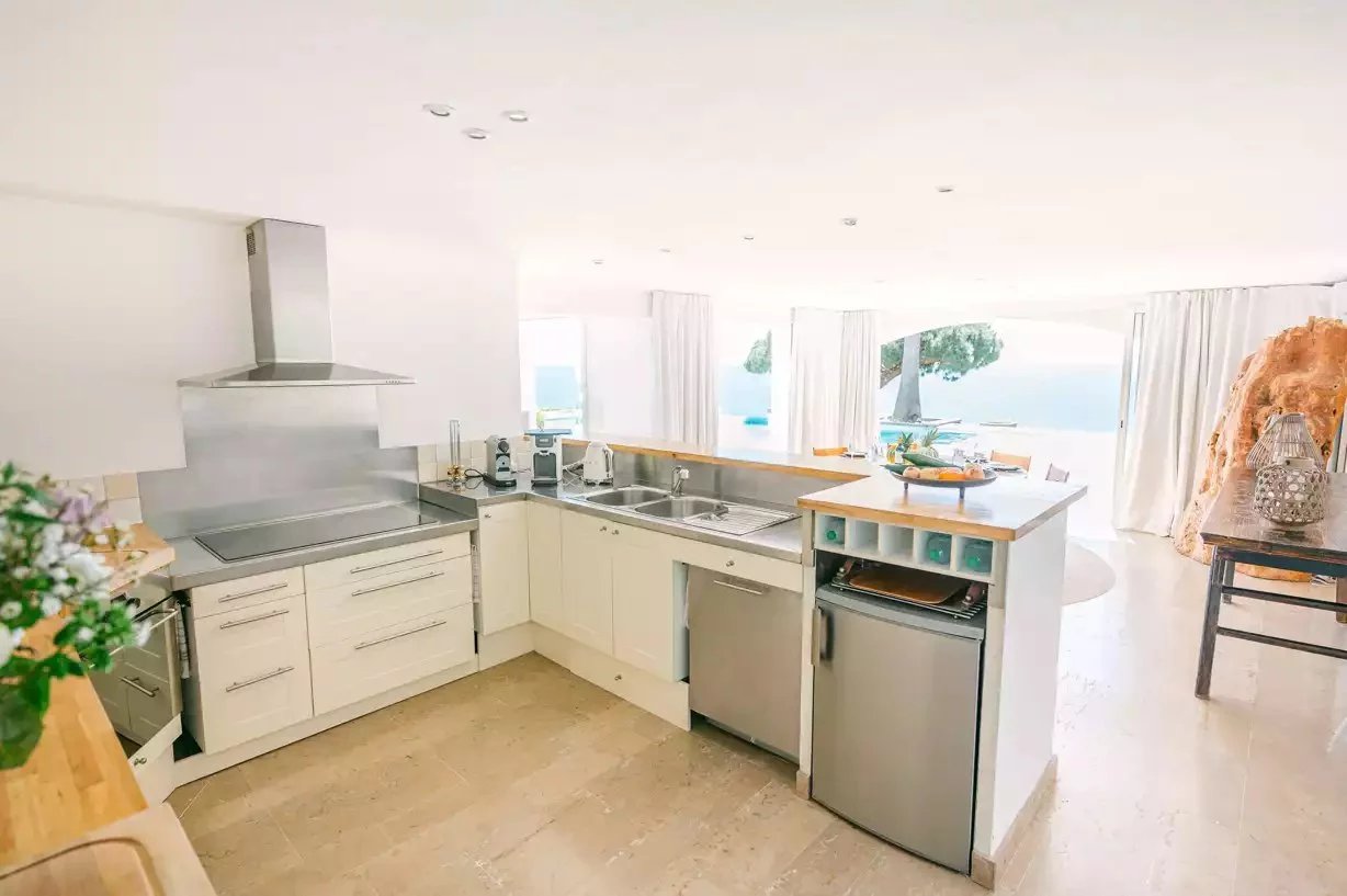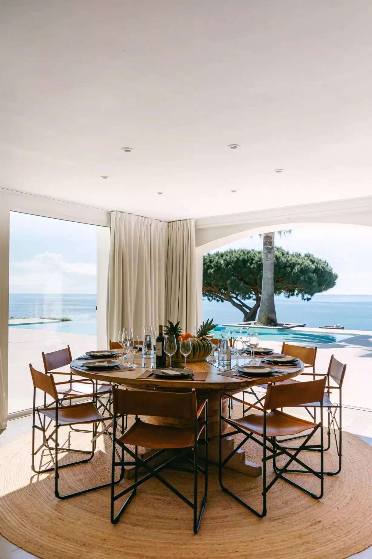The villa is centred around common loft-style, open concept spaces featuring enormous windows overlooking the enchanting bay. The interior showcases contemporary designer furniture, modern art pieces, and retro elements like a 1950s-style projector and tarmac lamps.