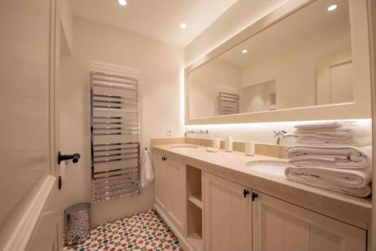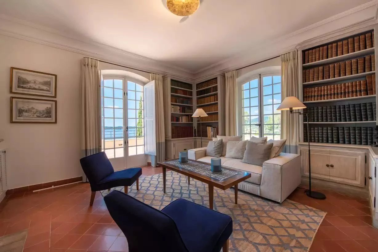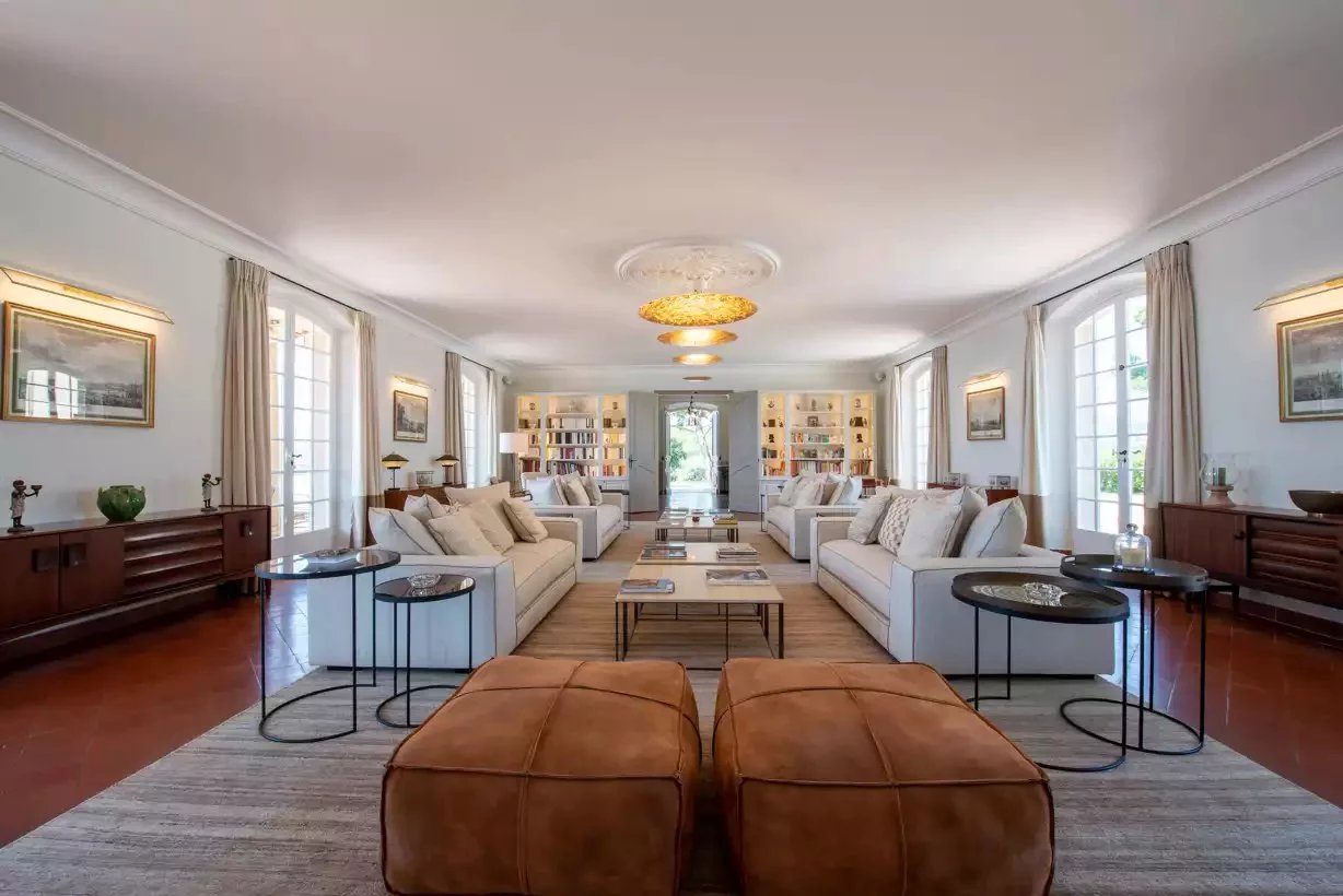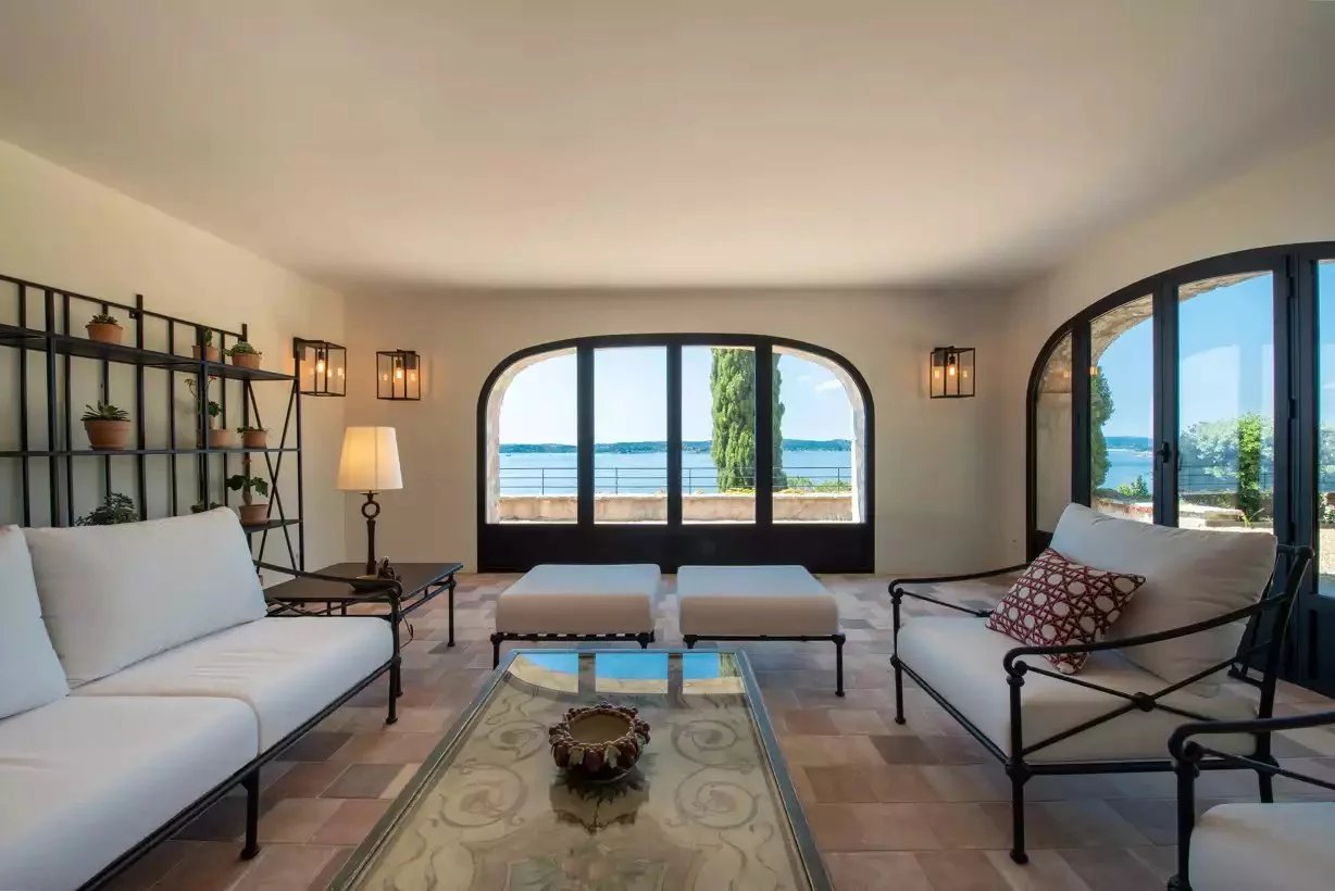 Arroccata sopra Sainte-Maxime, Villa Bella Storia vanta un'architettura elegante e di ispirazione contemporanea che si fonde perfettamente con il paesaggio mediterraneo circostante. All'interno, regna l'armonia grazie all'arredamento sobrio e raffinato, che combina legno chiaro, toni neutri e tocchi di verde.