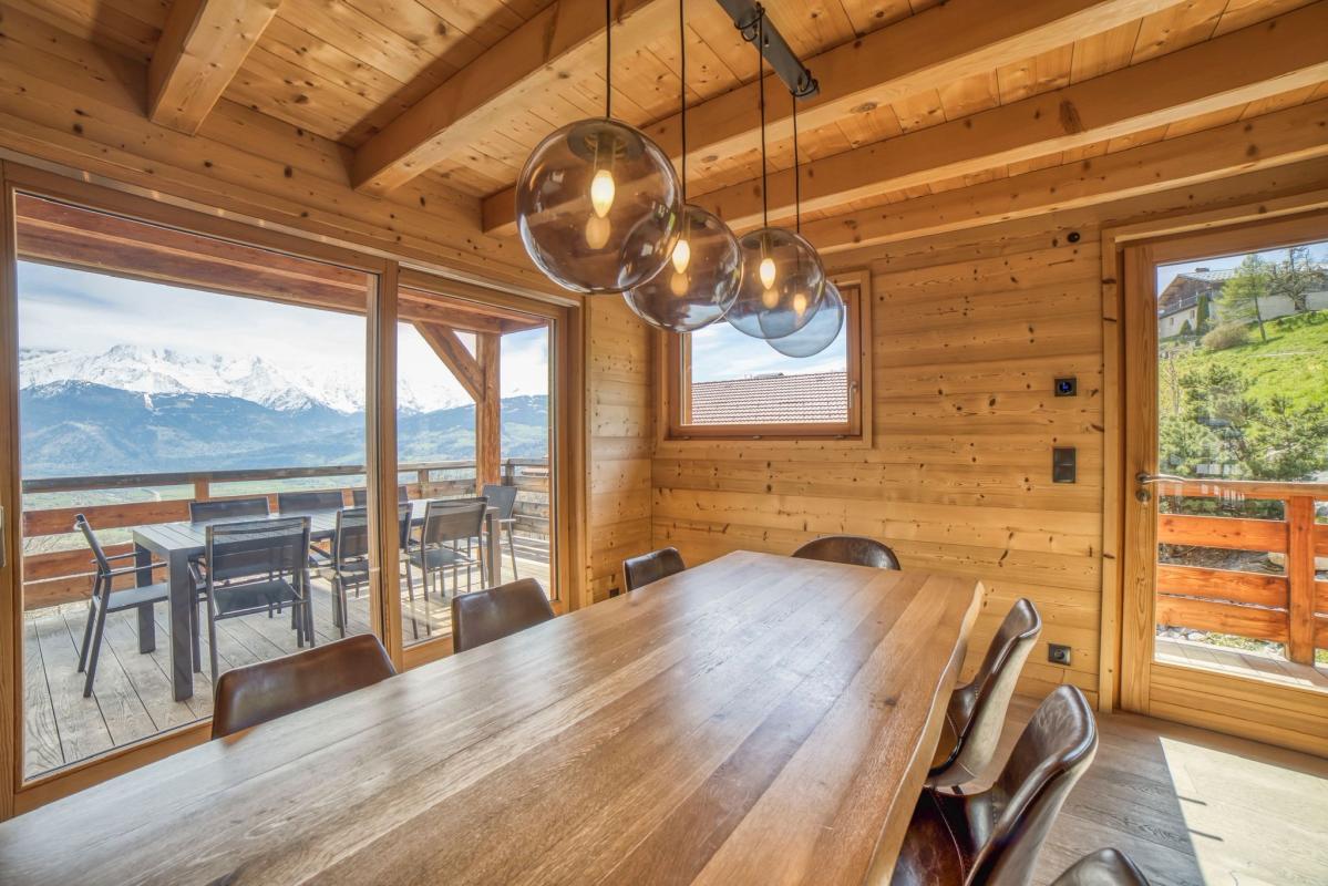 Ce chalet luxueux de 270 m², situé sur les hauteurs de Sallanches, bénéficie d'un emplacement exceptionnel face au Mont-Blanc et sur la chaine des Alpes, que l'on peut apprécier depuis le balcon, le jardin, ou encore la grande terrasse.
