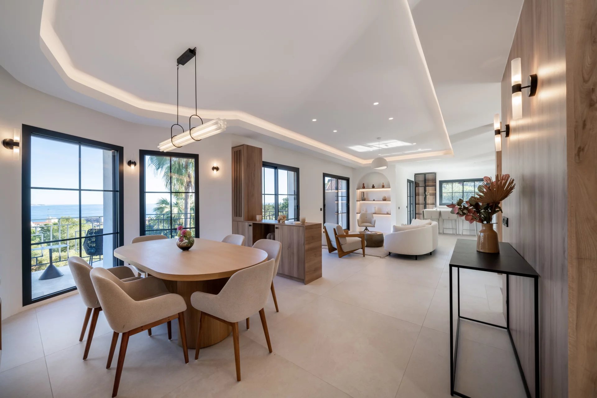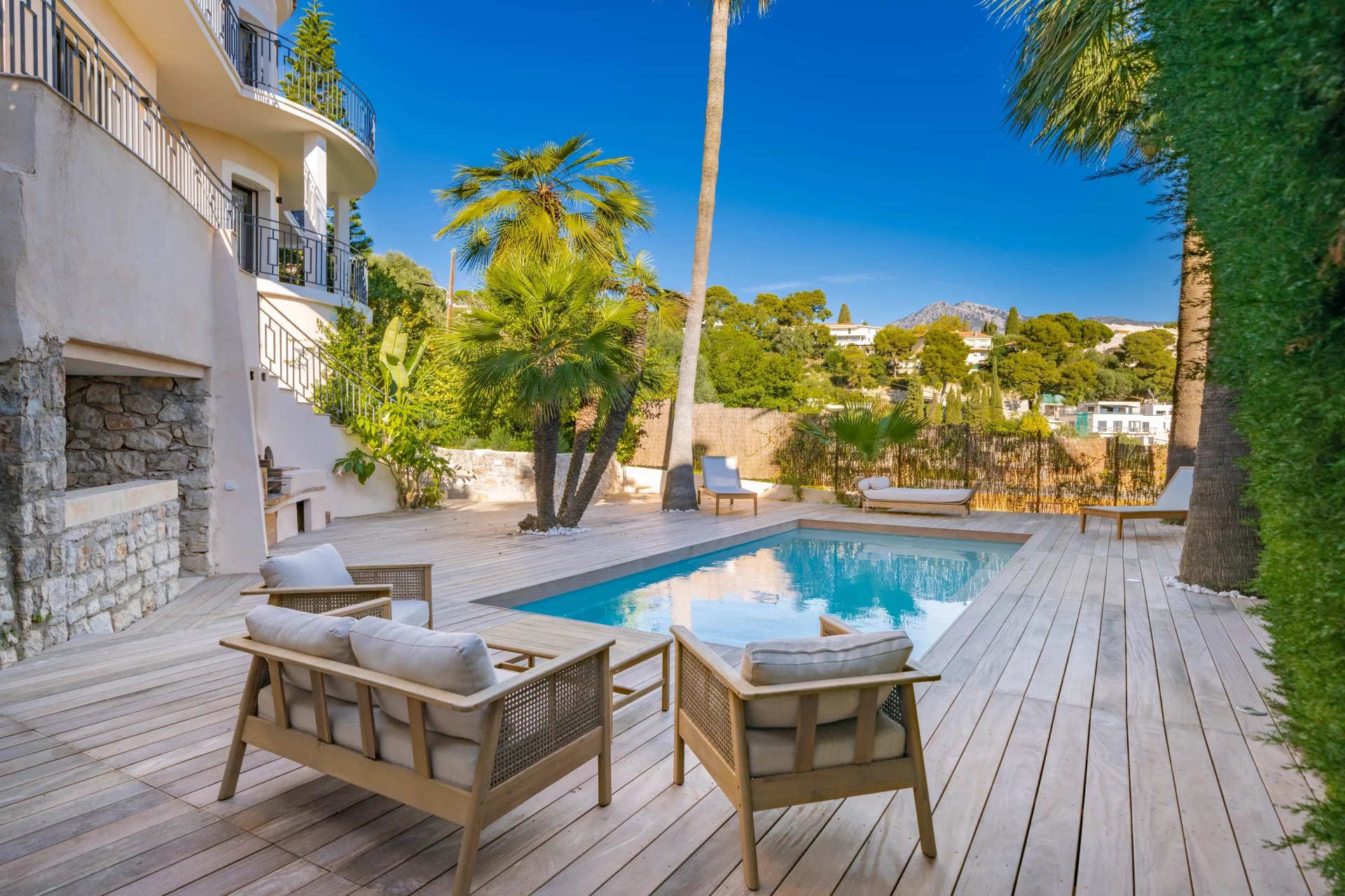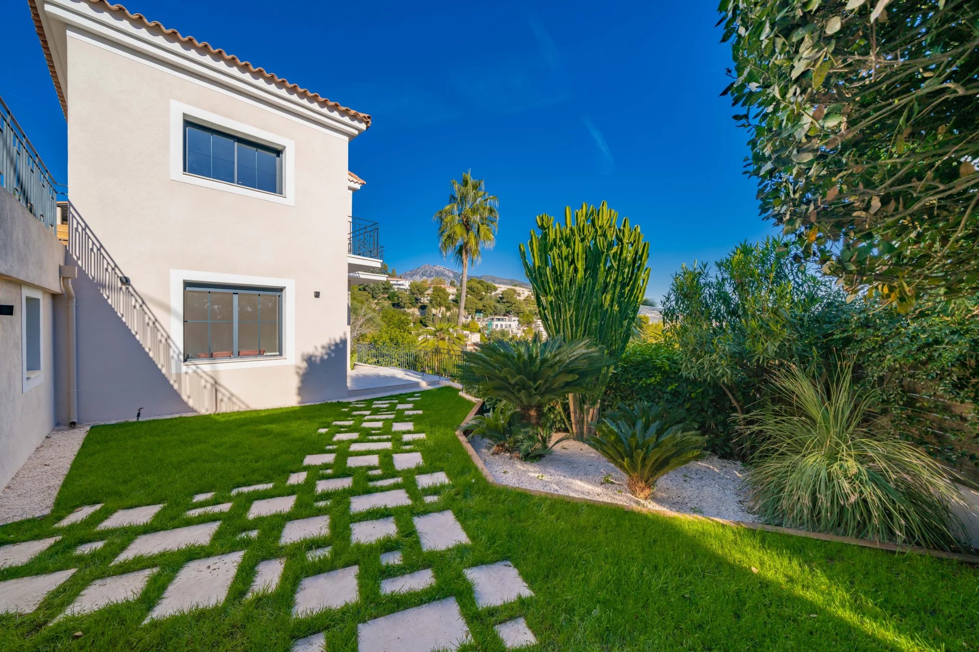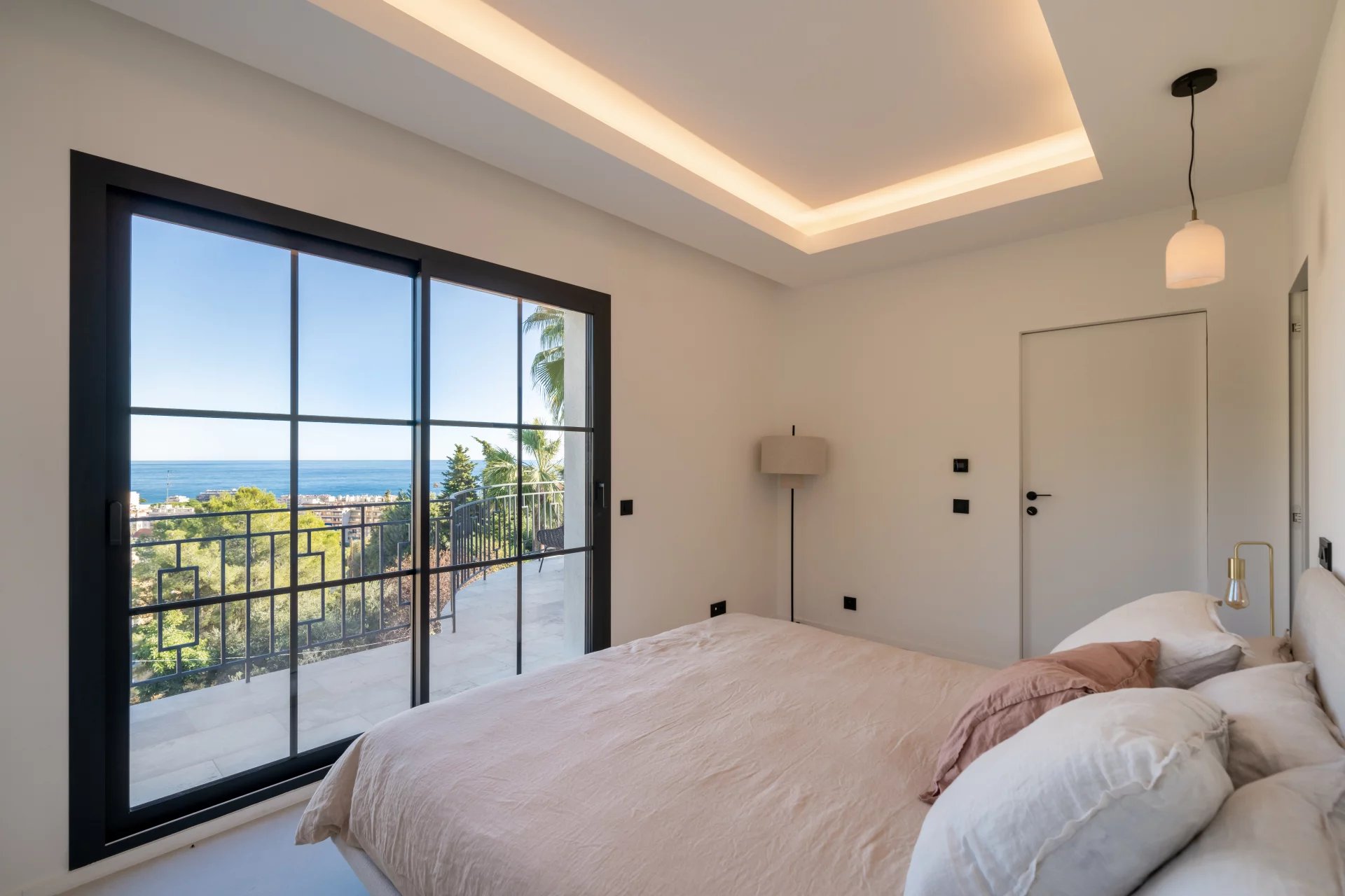 Dans un secteur résidentiel recherché, cette villa de 240 m² entièrement rénovée allie design contemporain, prestations haut de gamme et vue mer à couper le souffle. La villa s’ouvre sur une grande pièce de vie baignée de lumière, comprenant un séjour et une cuisine américaine, prolongés par de baies vitrées donnant sur la terrasse et le panorama sur la mer. Elle dispose de quatre chambres en suite, dont une au rez-de-chaussée pour un confort optimal. La suite principale, située à l’étage inférieur, offre un grand dressing et une salle de bains privative avec baignoire et double douche. Chaque chambre bénéficie également d’un dressing et d’une salle de bains privative. Un appartement indépendant offre flexibilité et intimité, idéal pour les invités, ou pour aménager une salle de sport privée, ou encore une cinquième suite. La villa est équipée de domotique avancée, climatisation réversible et système de surveillance, assurant un confort et une sécurité optimaux. Le jardin paysager abrite une piscine avec pool house, une cuisine d’été et un espace barbecue. Un garage fermé et la possibilité de créer des places de parking supplémentaires complètent ce bien rare. Cette propriété unique conjugue calme absolu, proximité immédiate de Monaco et accès direct aux plages, offrant un style de vie raffiné sur la Côte d’Azur.