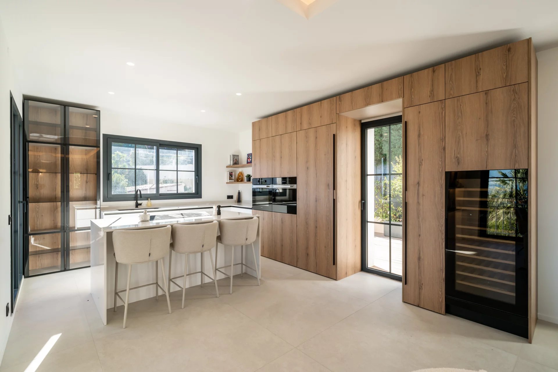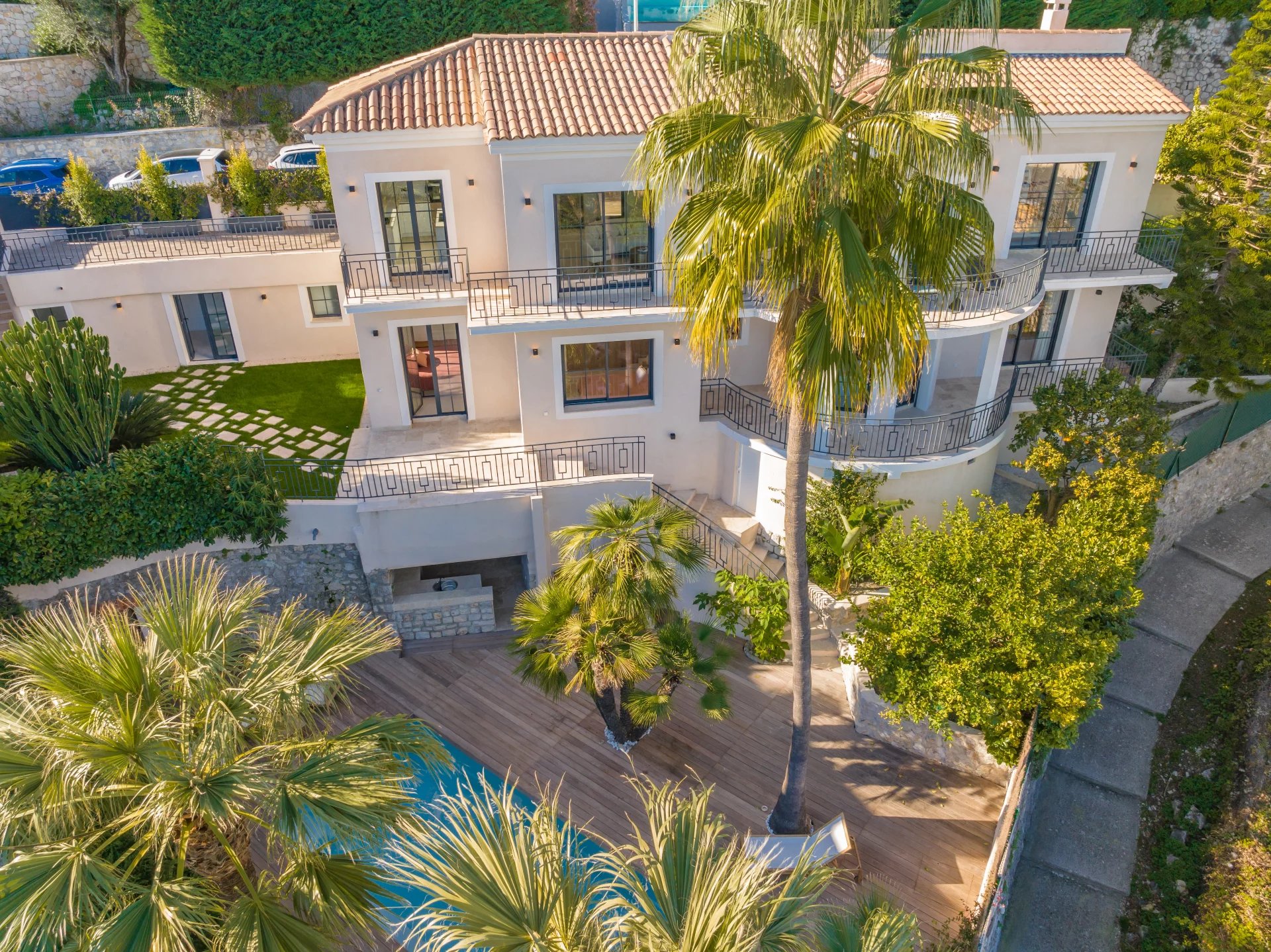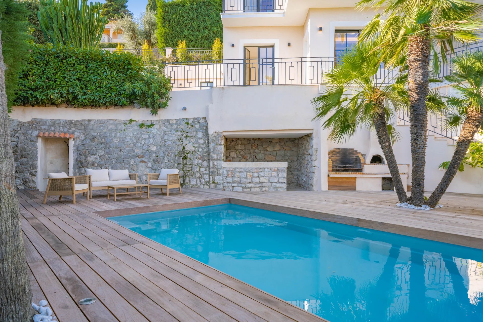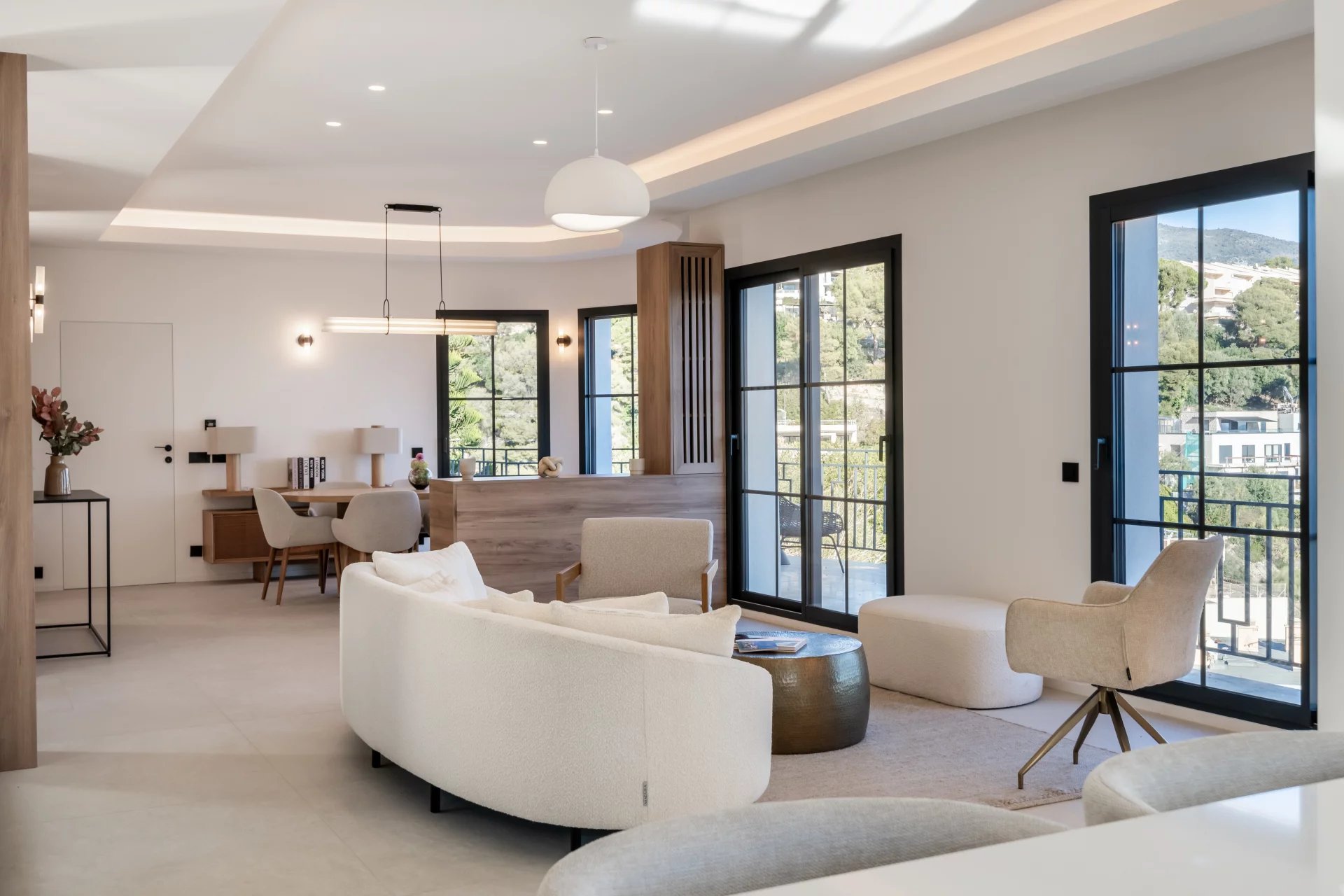Dans un secteur résidentiel recherché, cette villa de 240 m² entièrement rénovée allie design contemporain, prestations haut de gamme et vue mer à couper le souffle. La villa s’ouvre sur une grande pièce de vie baignée de lumière, comprenant un séjour et une cuisine américaine, prolongés par de baies vitrées donnant sur la terrasse et le panorama sur la mer. Elle dispose de quatre chambres en suite, dont une au rez-de-chaussée pour un confort optimal. La suite principale, située à l’étage inférieur, offre un grand dressing et une salle de bains privative avec baignoire et double douche. Chaque chambre bénéficie également d’un dressing et d’une salle de bains privative. Un appartement indépendant offre flexibilité et intimité, idéal pour les invités, ou pour aménager une salle de sport privée, ou encore une cinquième suite. La villa est équipée de domotique avancée, climatisation réversible et système de surveillance, assurant un confort et une sécurité optimaux. Le jardin paysager abrite une piscine avec pool house, une cuisine d’été et un espace barbecue. Un garage fermé et la possibilité de créer des places de parking supplémentaires complètent ce bien rare. Cette propriété unique conjugue calme absolu, proximité immédiate de Monaco et accès direct aux plages, offrant un style de vie raffiné sur la Côte d’Azur.