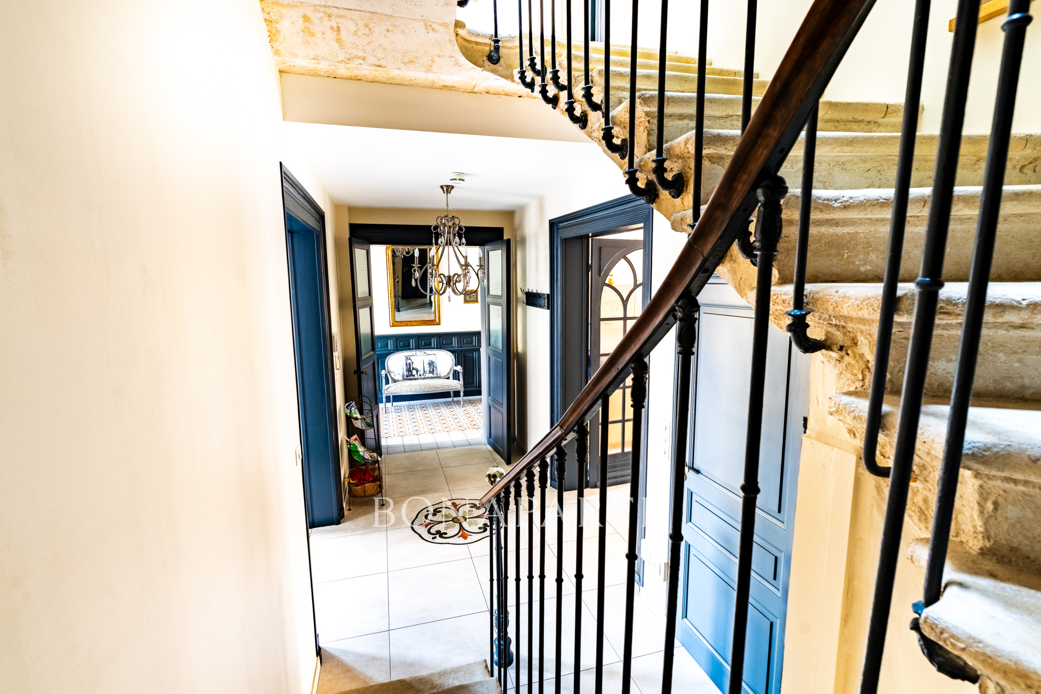 Dès l'entrée, le charme opère : parquet ancien, ferronneries d'art et mosaïques composent une atmosphère feutrée et raffinée. Les pièces de réception s'ouvrent sur un jardin clos, véritable refuge en coeur de ville, où s'expriment calme, convivialité et beauté. Maison de famille ou maison d'accueil élégante, elle conjugue harmonie des espaces et douceur de vivre.