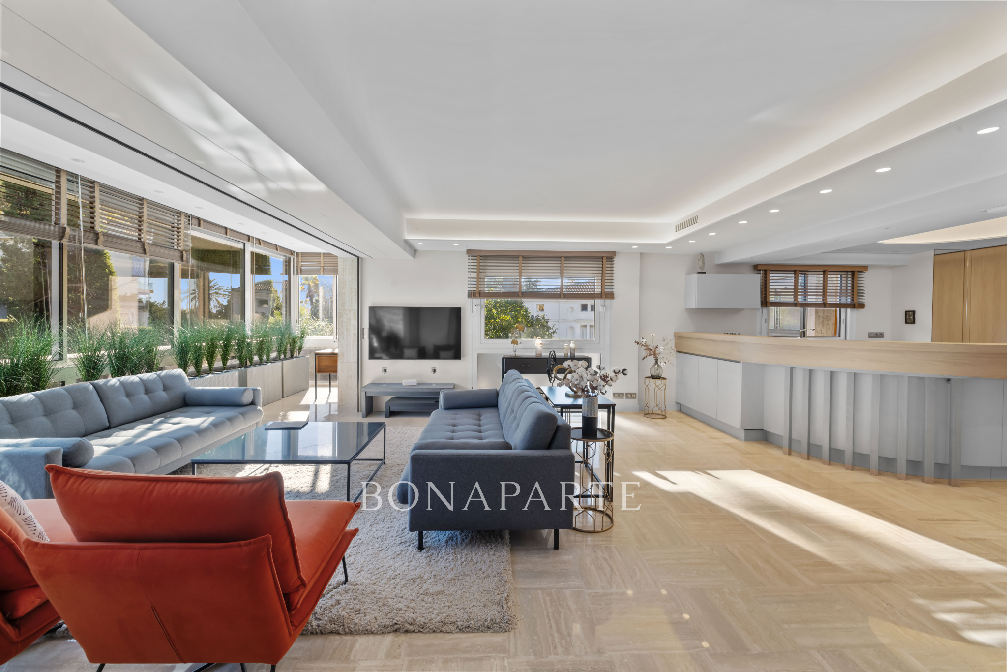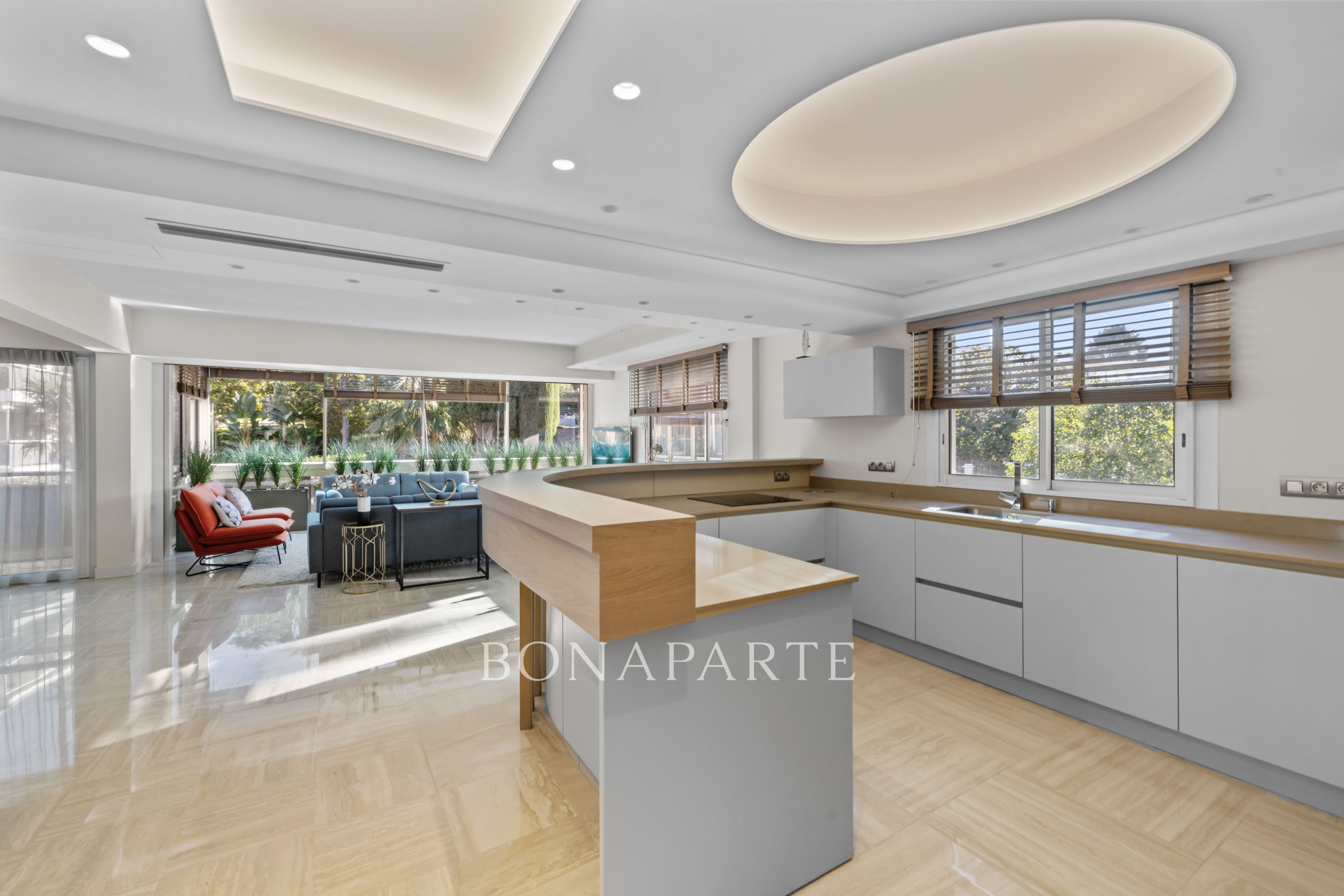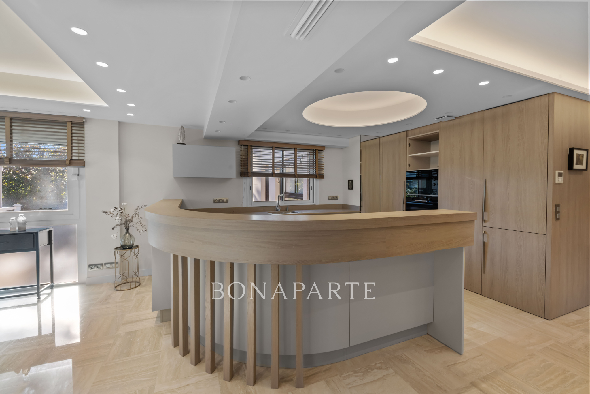 Occupant le dernier étage, cet appartement d'environ 155 m2 s'ouvre sur un somptueux toit-terrasse paysagé de 130 m2, conçu comme un véritable espace de réception à ciel ouvert. Entièrement rénové par un architecte avec des matériaux nobles et des finitions haut de gamme, il offre une ambiance contemporaine et raffinée.