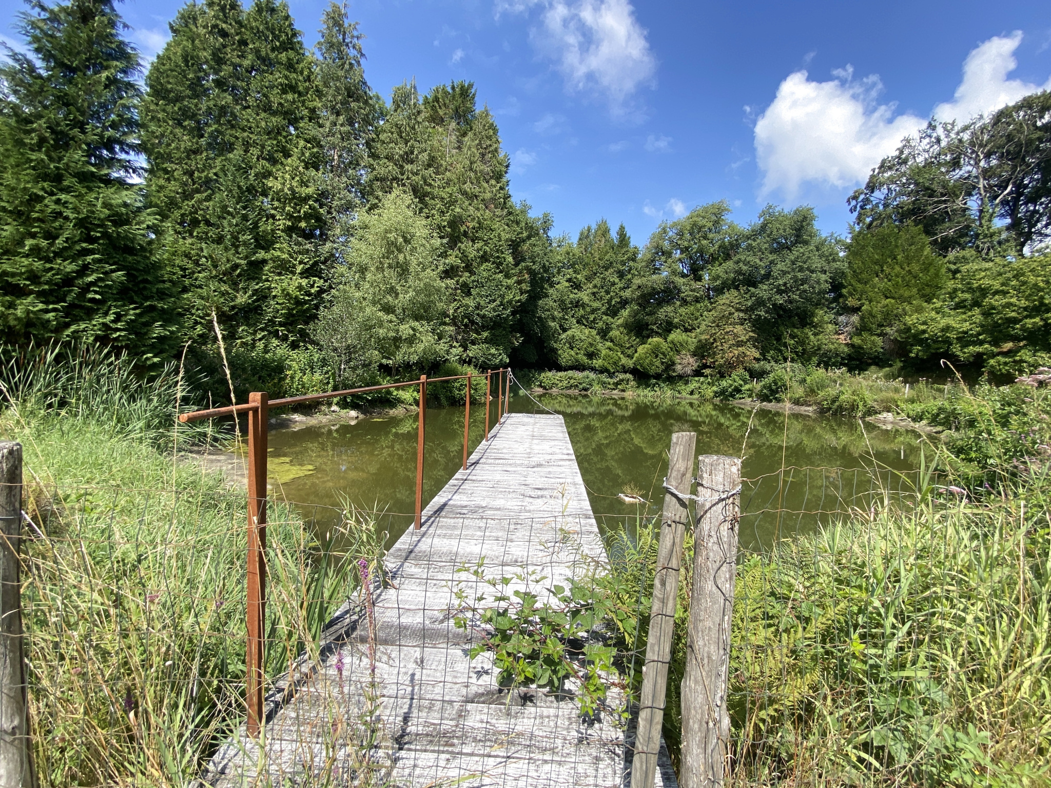 Edifiée en 1966 sur un site séléctionné avec soin par son propriétaire, passionné de nature et de patrimoine,cette belle demeure s'est enveloppée au fil du temps d'un parc façonné avec amour : allées ombragées, espaces paisibles pour se ressourcer, grans étang privé créé avec son ponton pour la pêche ou les ballades en barque. A l'arrière de la propriété, une châtaigneraie a été plantée où se mêlent plusieurs essences d'arbres.