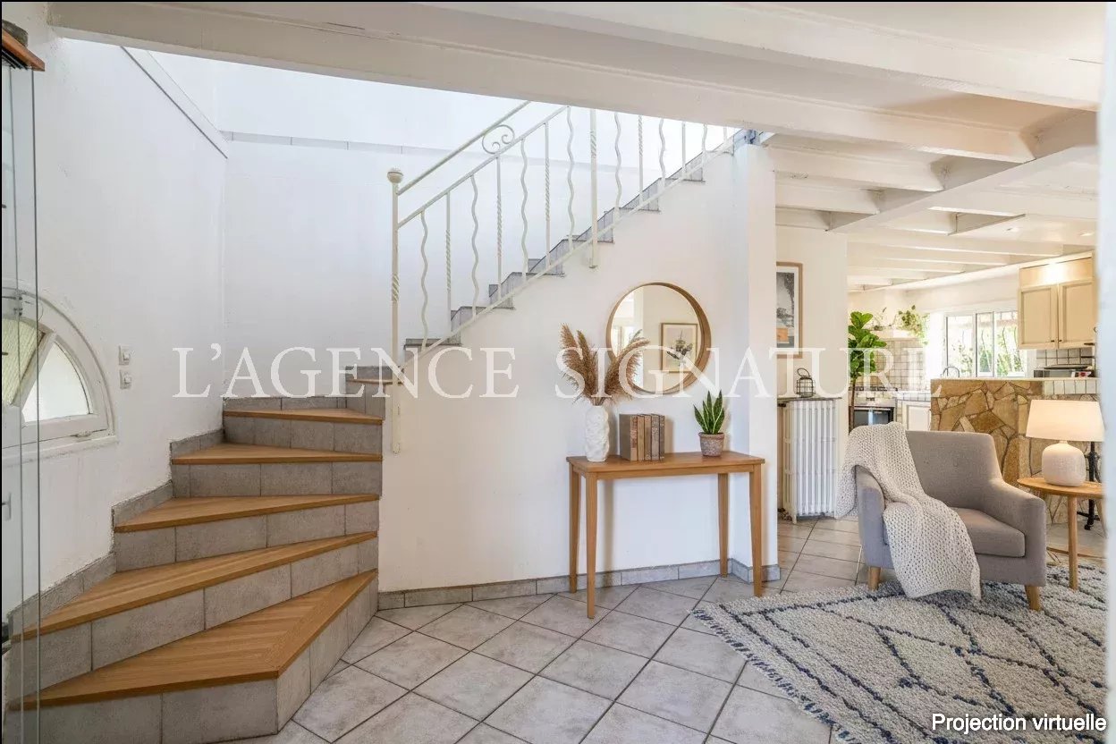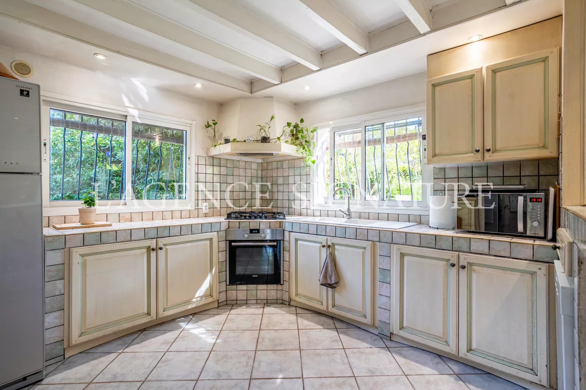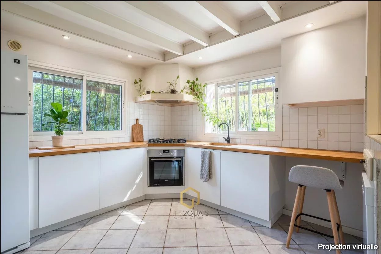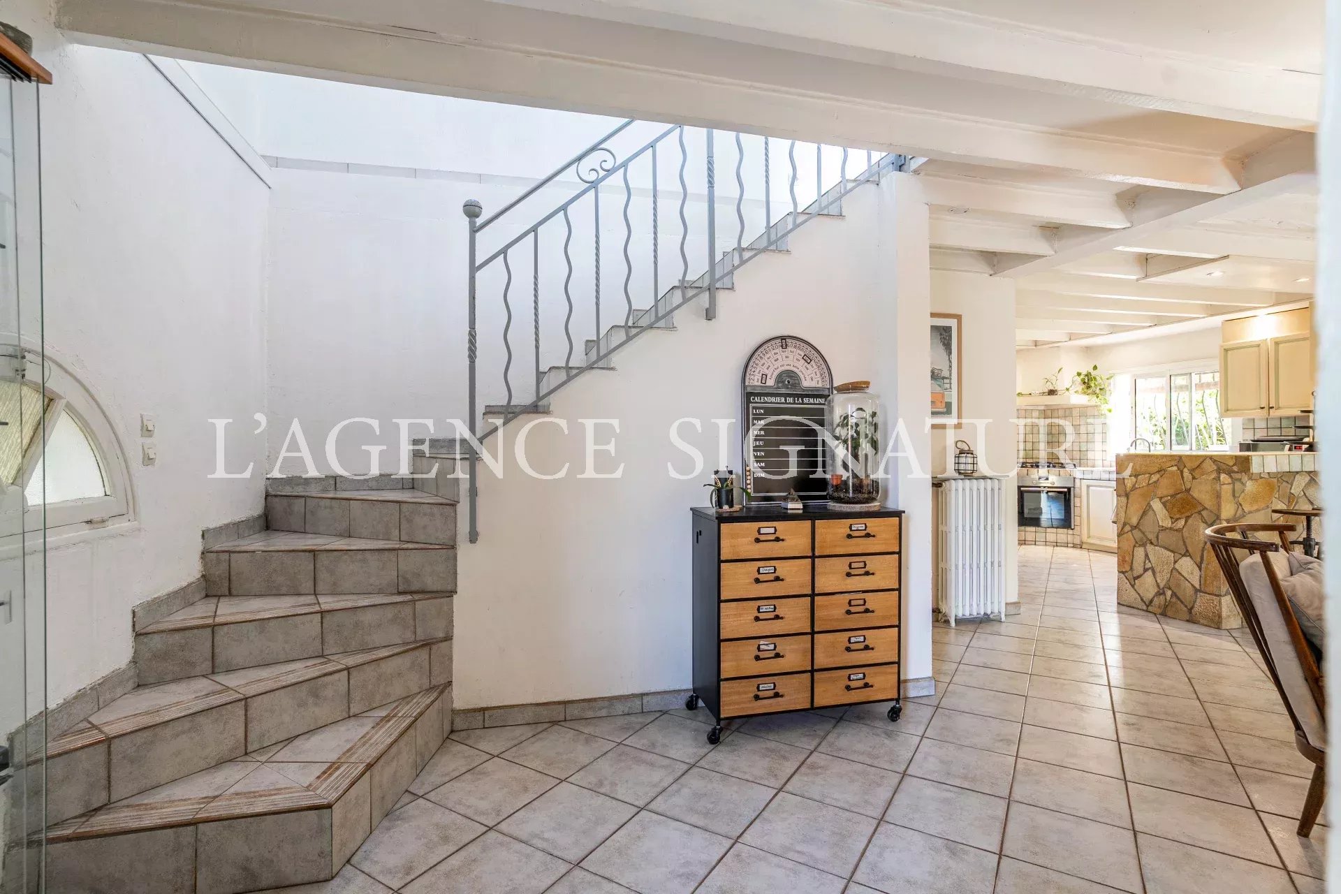 Elle se compose au rez-de-chaussée d’une entrée avec placards, d’une salle d’eau avec WC, d’un séjour et d’une grande cuisine aménagée et équipée, le tout ouvrant sur une spacieuse terrasse et un jardin à l’ambiance tropicale, parfaits pour recevoir famille et amis.