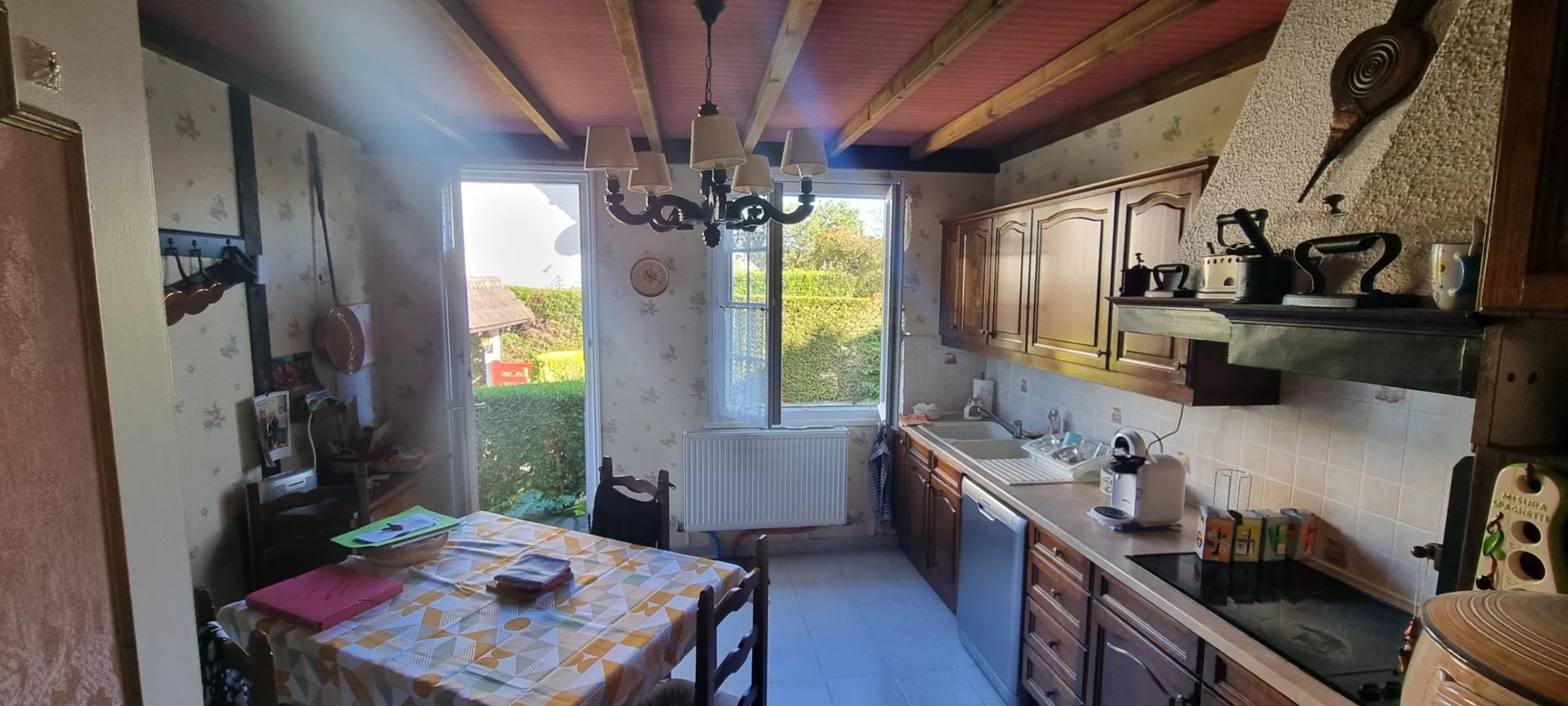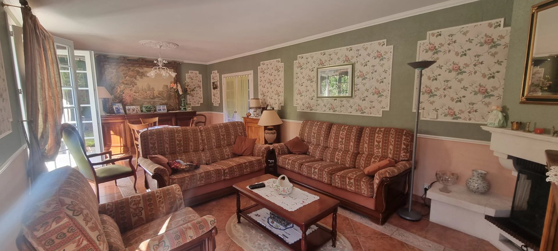 Comprenant : Sas d'entrée, cuisine équipée donnant sur l'extérieur, séjour double avec cheminée donnant sur terrasse et jardin, 3 chambres, salle de bain mixte (douche et baignoire), salle d'eau, wc.