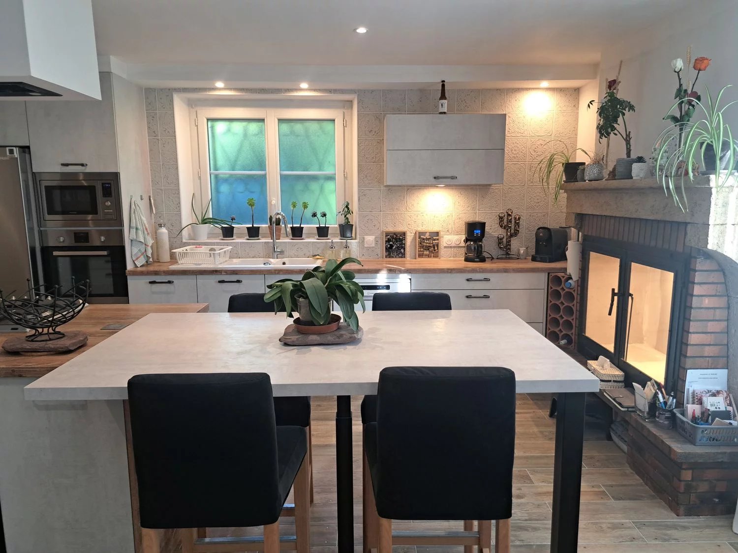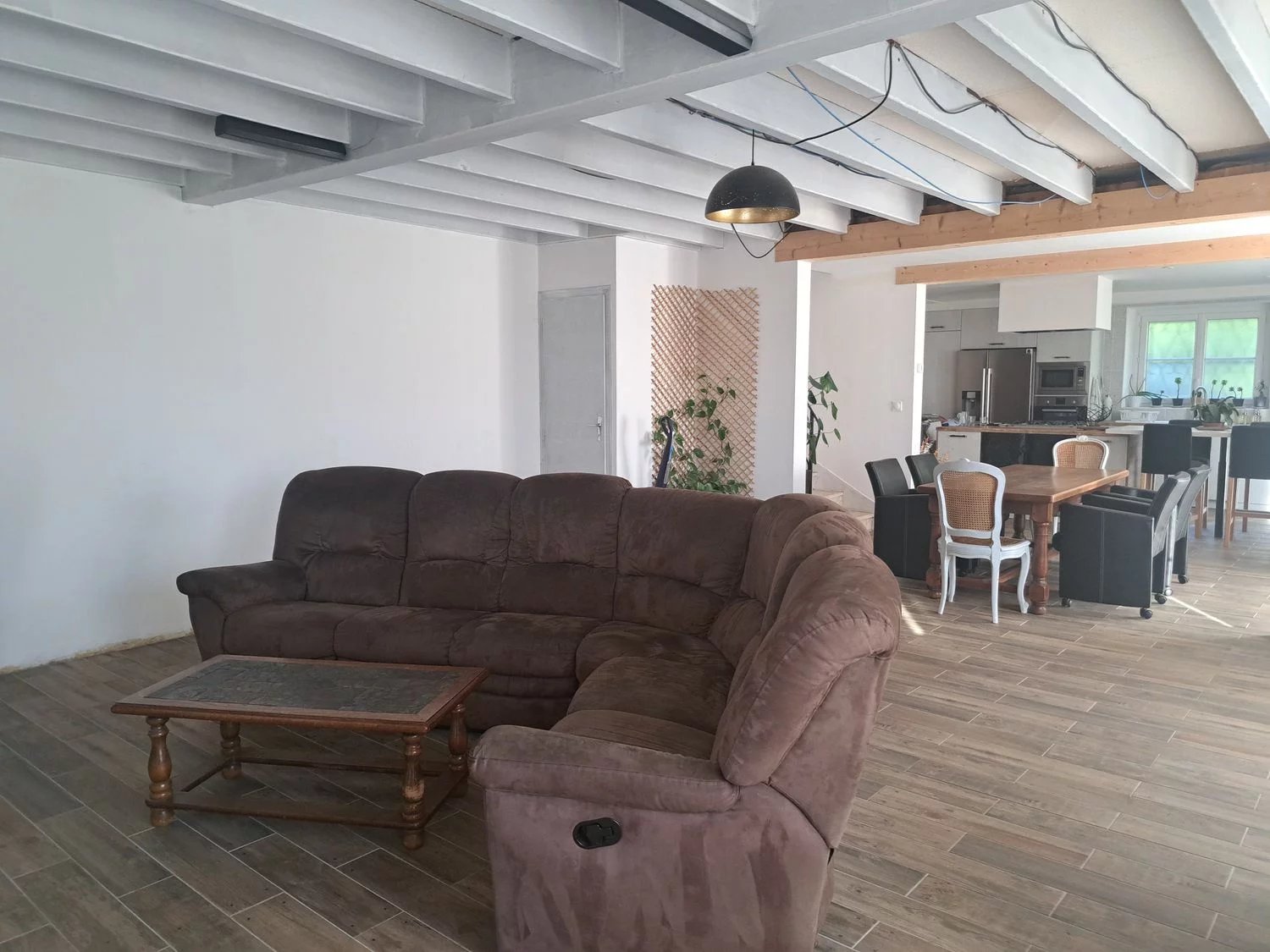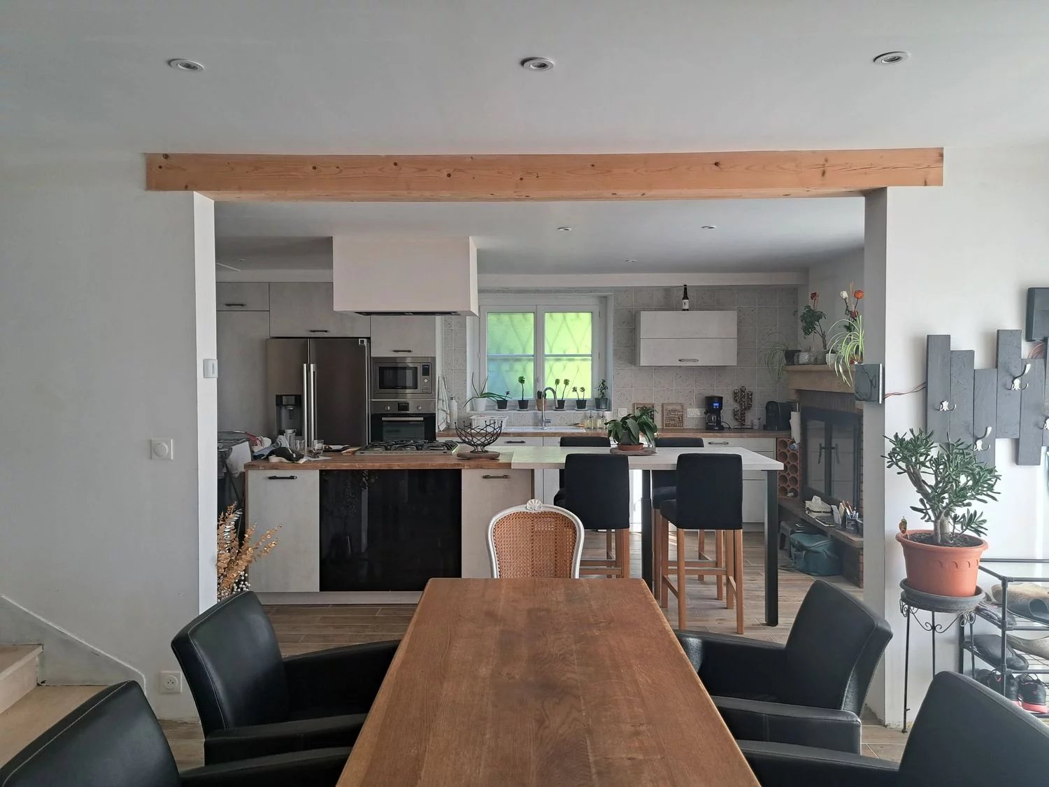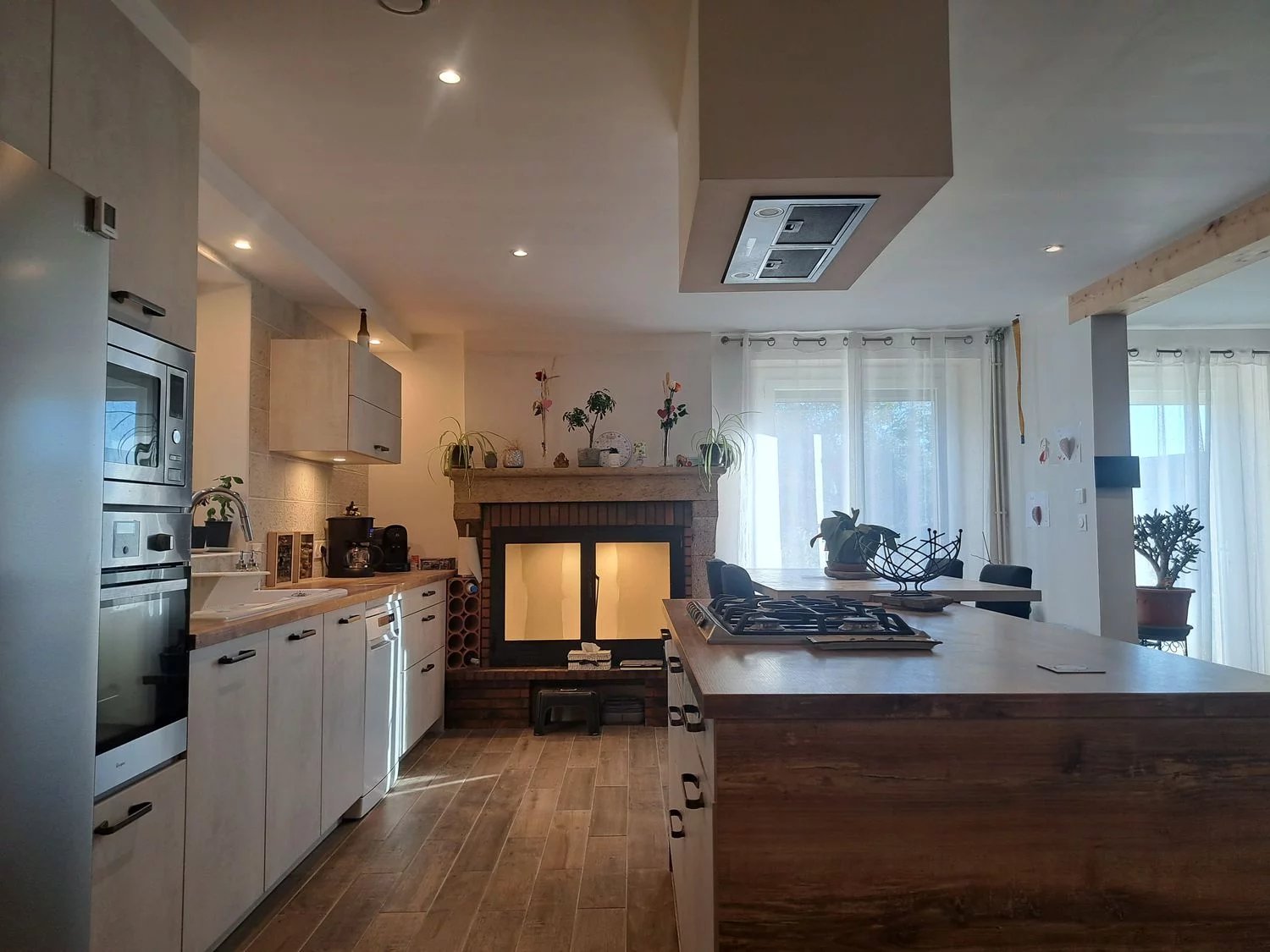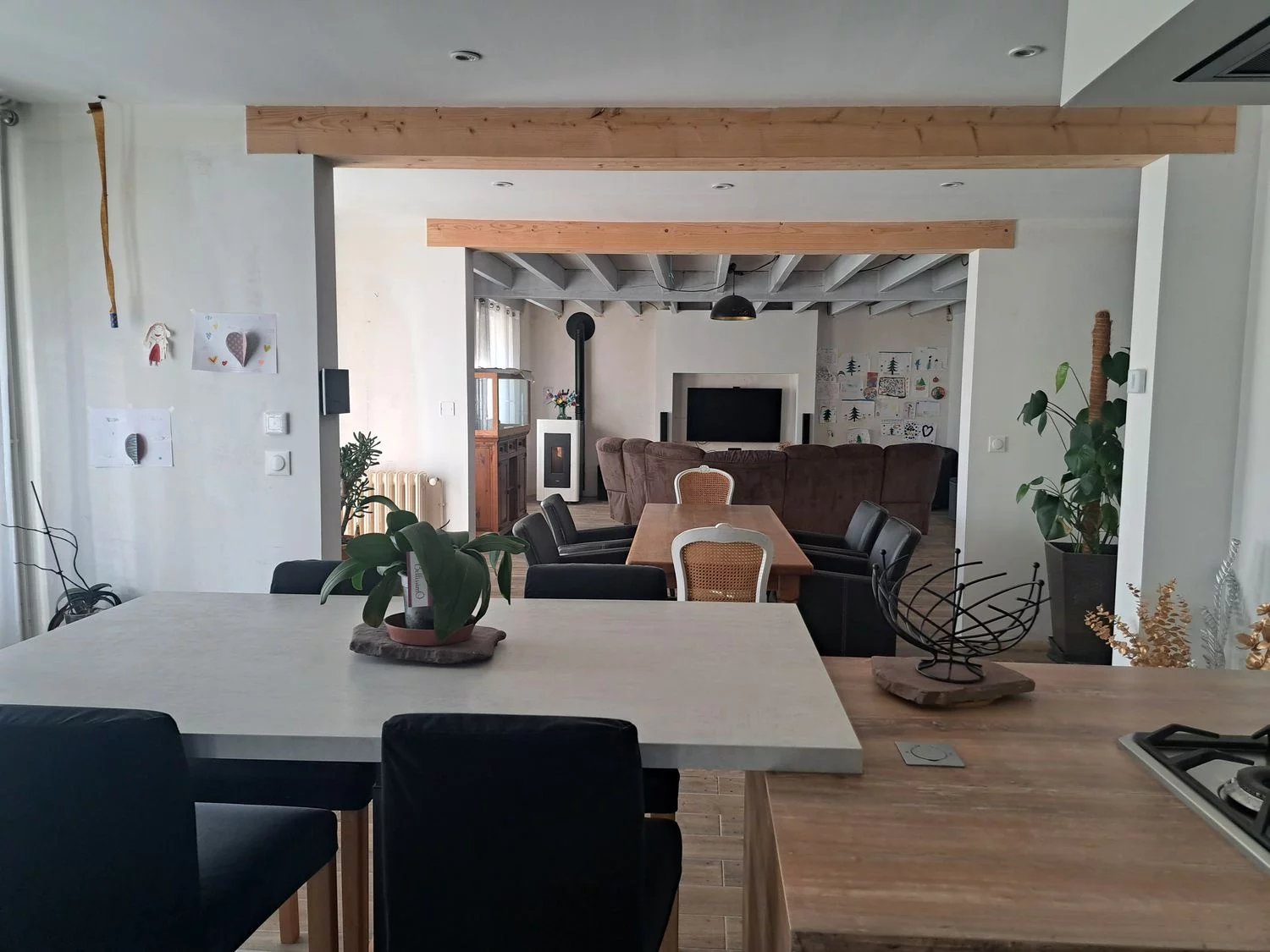 La maison d'environ 160 m2 se compose au rez-de-chaussée d'une entrée accueillante, d'une grande pièce de vie de 74 m2 comprenant une cuisine aménagée et équipée, une salle à manger et un salon doté d'un poêle, parfait pour des moments conviviaux et chaleureux.