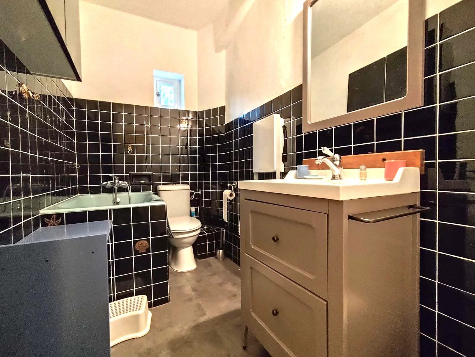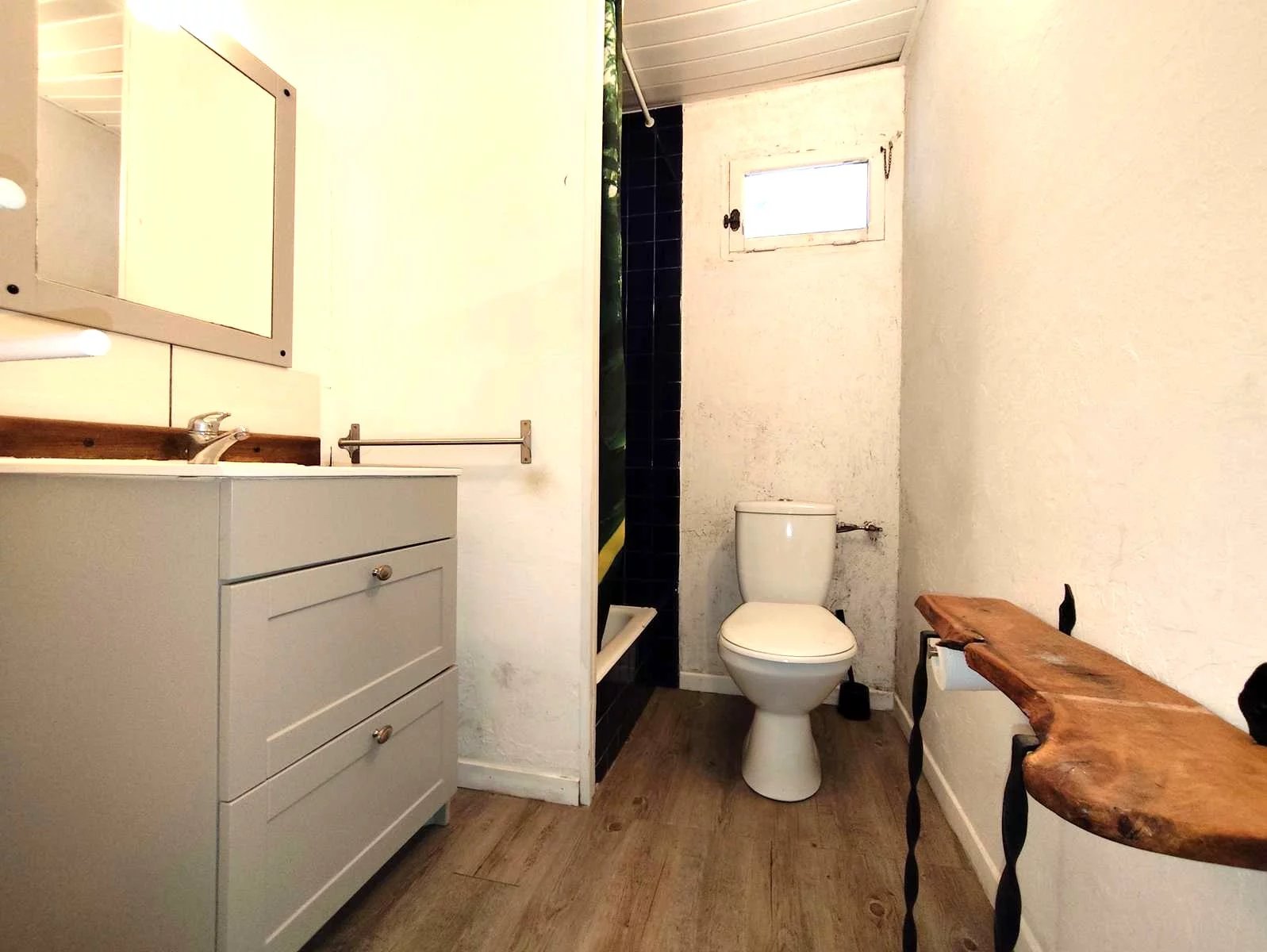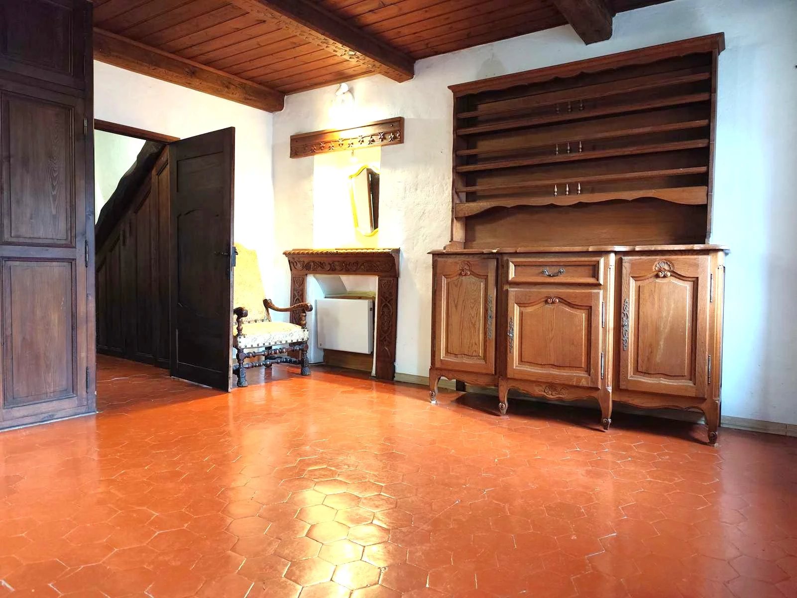 composé : d'une cuisine aménagée indépendante, rangements sous-escalier, salle de douche / WC, salon avec cheminée,