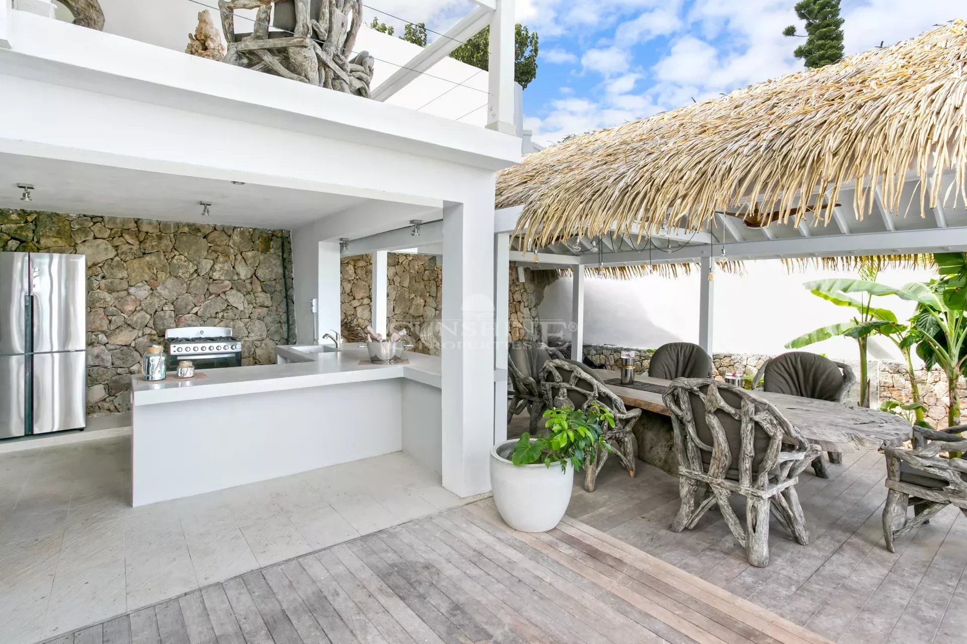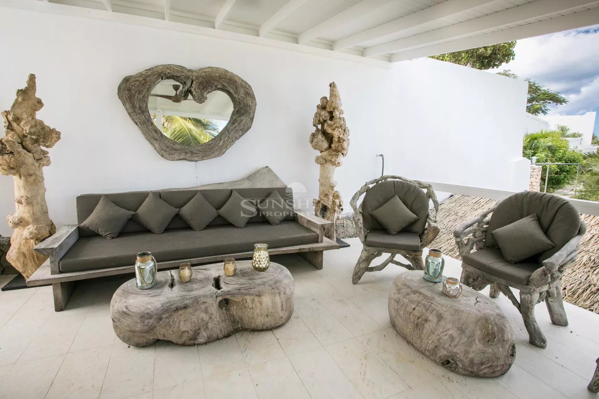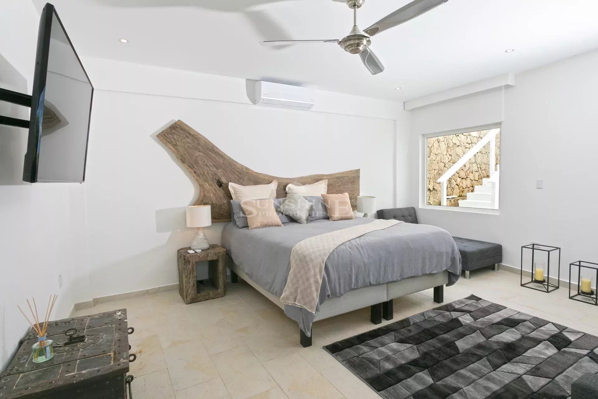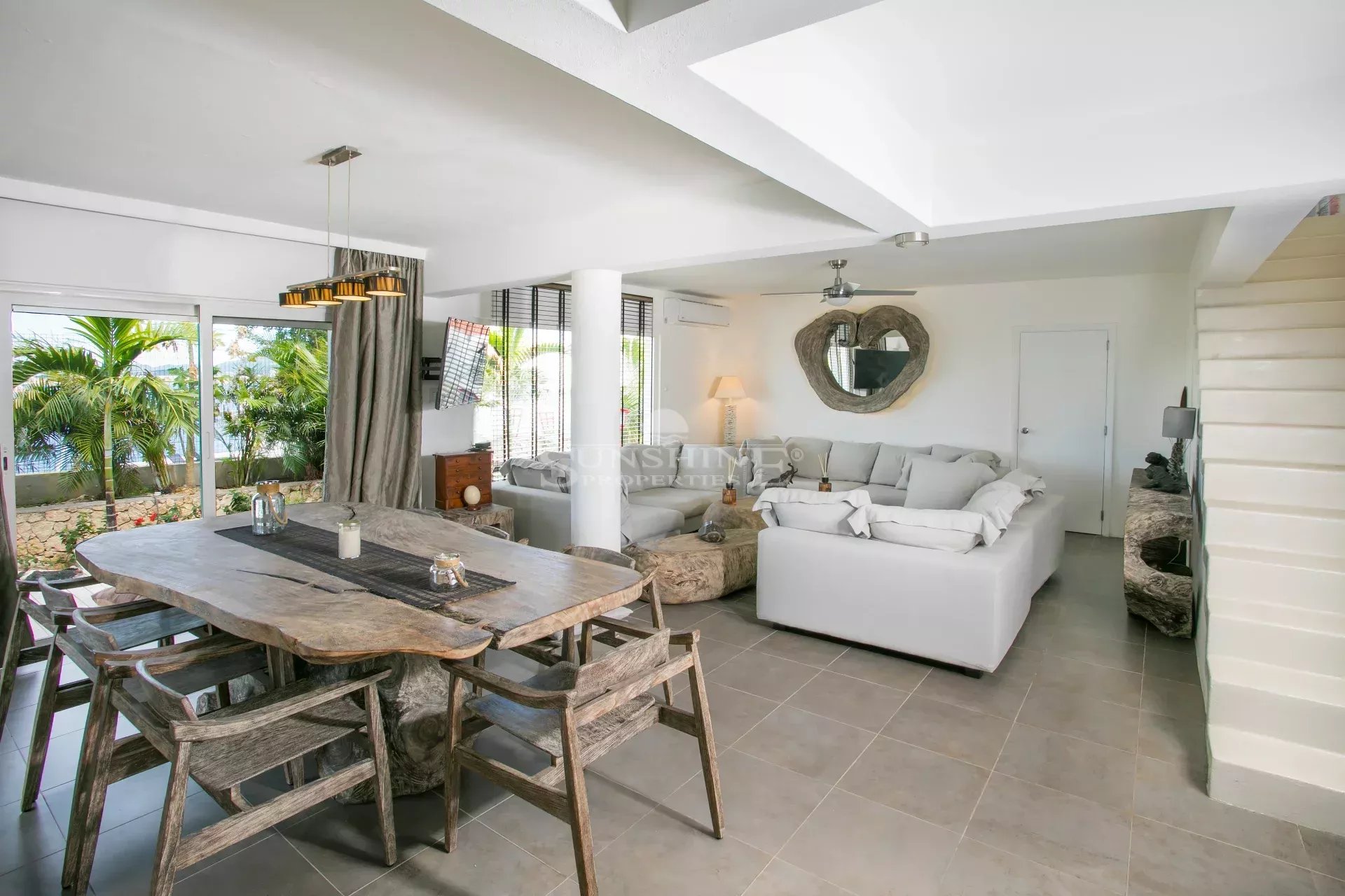 Inside, the villa offers a generous, resort-style layout with multiple airy living spaces, seamless indoor-outdoor flow. The home is currently configured for large-scale entertaining and family living, with luxury ensuite bedrooms and flexible guest accommodations (commonly arranged as six bedrooms, with additional suites available depending on use). A bright great room and dining area connect to well-equipped indoor and outdoor kitchens, ideal for hosting sunset dinners and laid-back Caribbean gatherings.