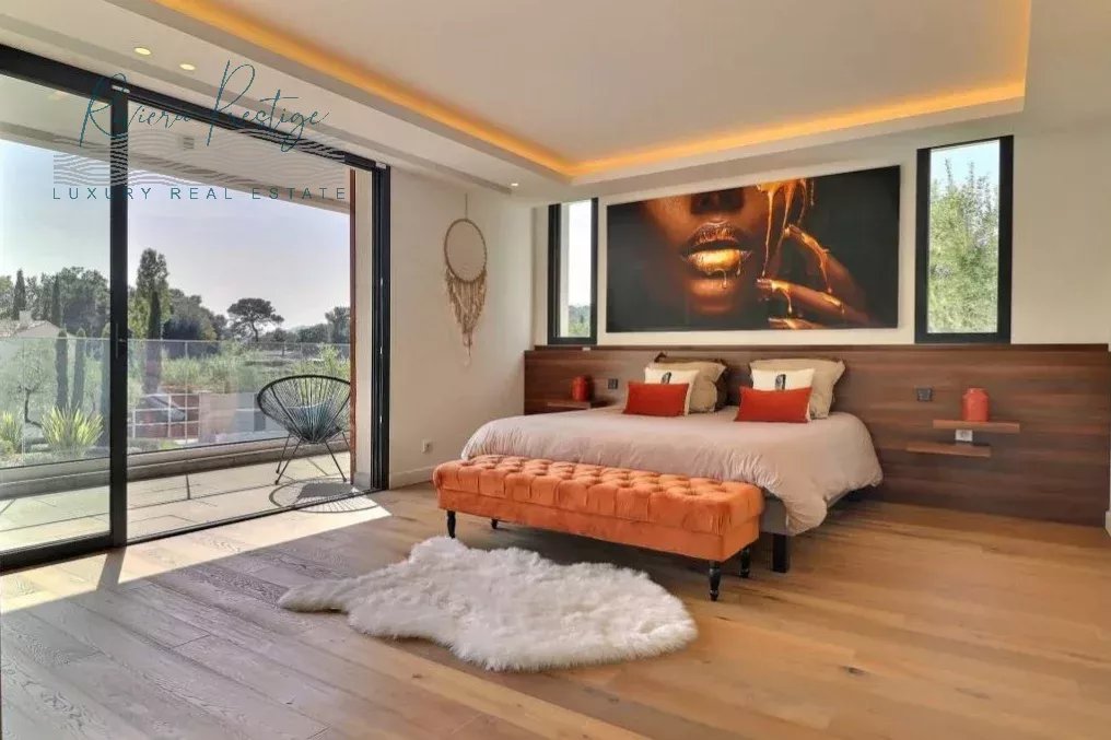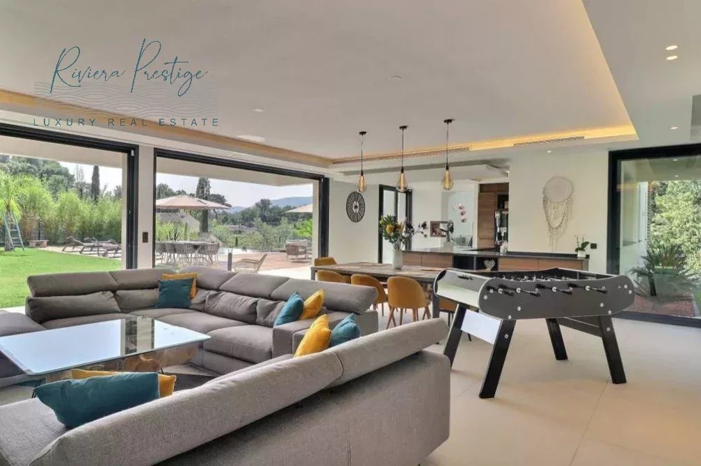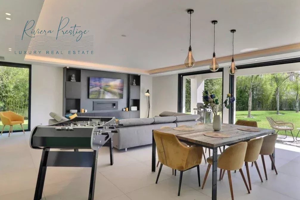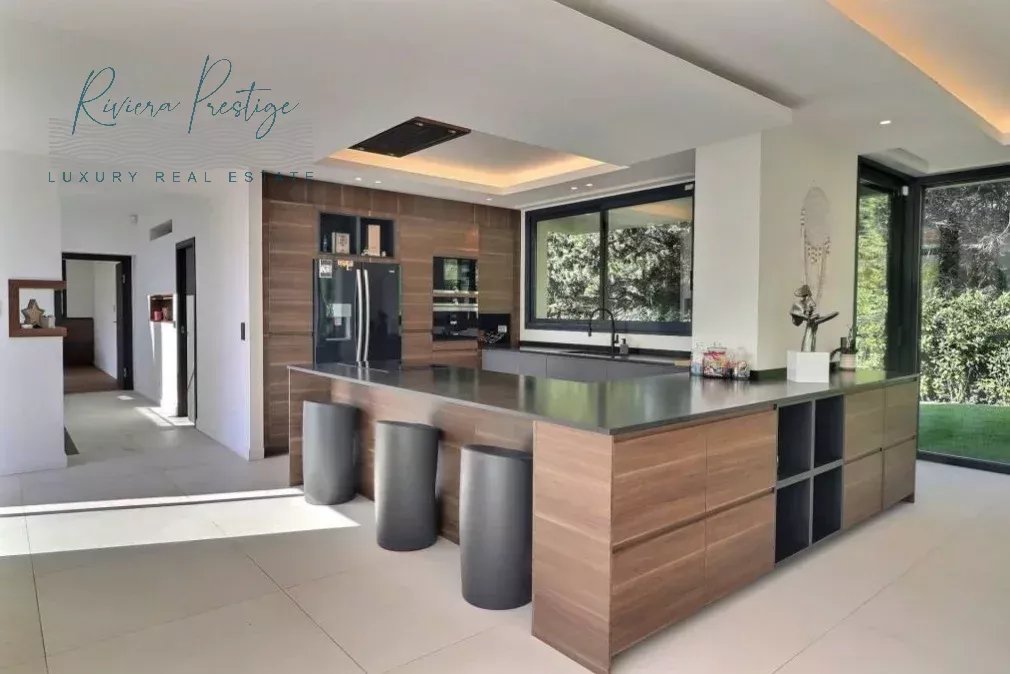 la terrasse et l'espace piscine et spa, cuisine américaine équipée, chambre de Maître en suite de 50m² avec SDB et dressing . À l'étage, 3 chambres en suite