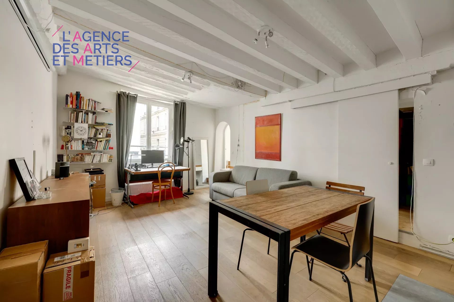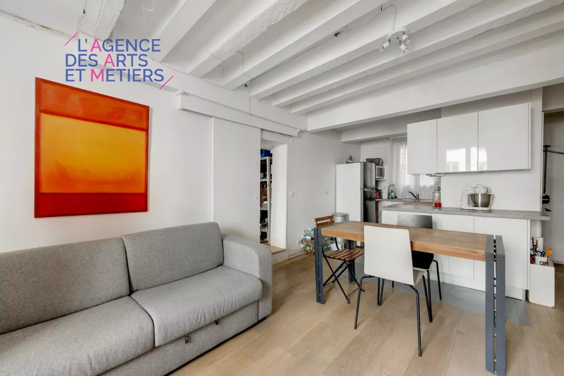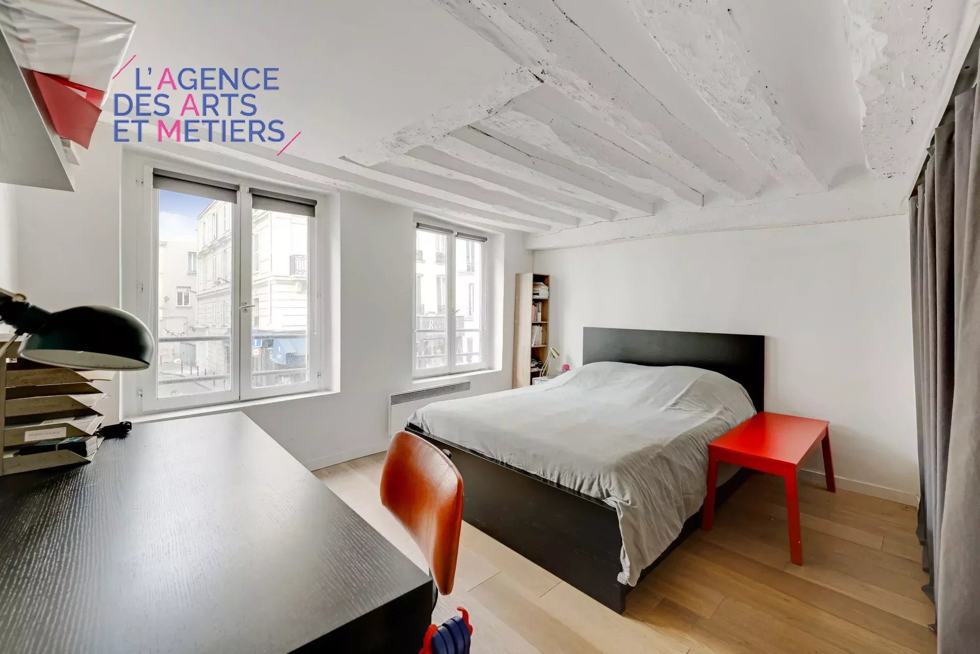 Au coeur de Paris, à la frontière de plusieurs quartiers, ce secteur Sud du 10ème arrondissement, est à deux pas de la Porte Saint Martin. Appartement 3 PIÈCES de charme avec une double exposition sur rue (OUEST) et cour (EST) comprenant une entrée, un grand séjour/cuisine américaine, deux chambres, une salle de bains avec baignoire et douche et un WC séparé. Poutres d'origine peintes en blanc, parquet au sol. Plusieurs fenêtres. Vis à vis éloigné. Double vitrage et DPE E.