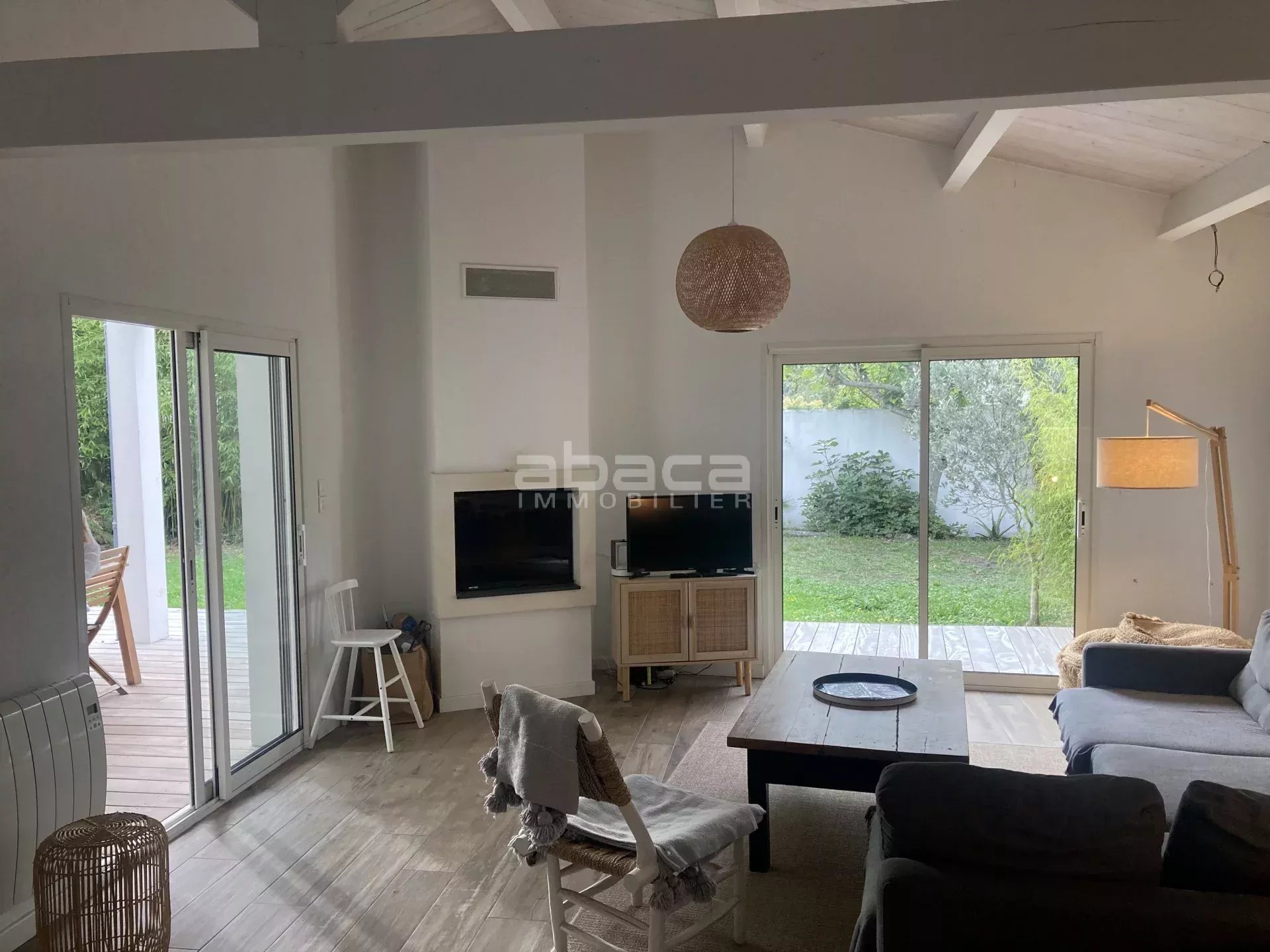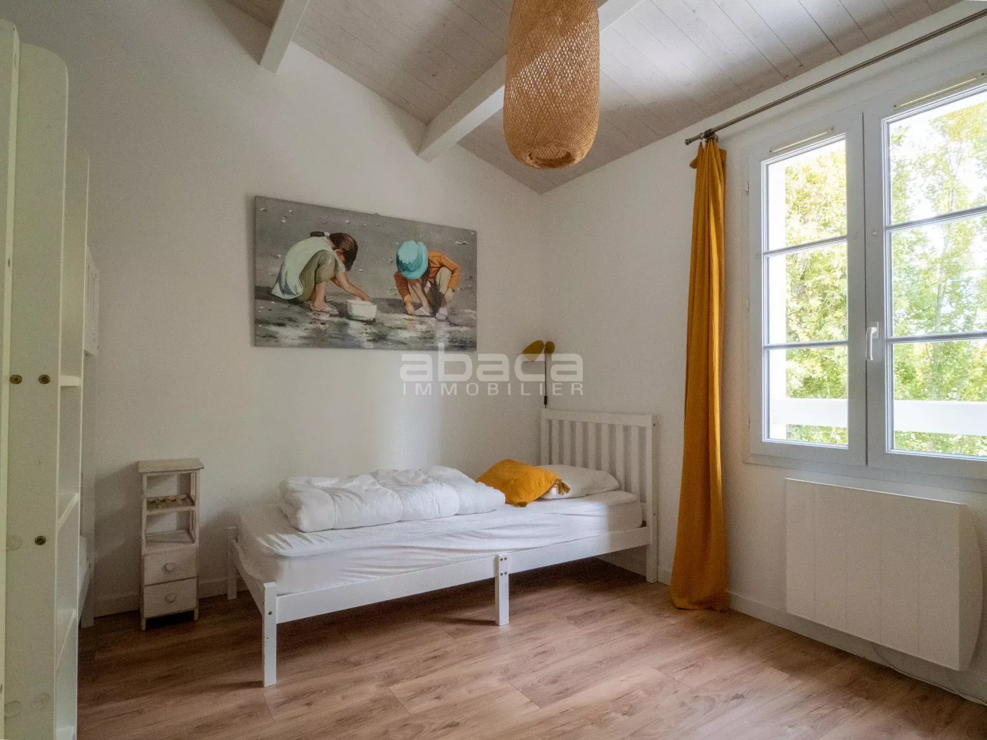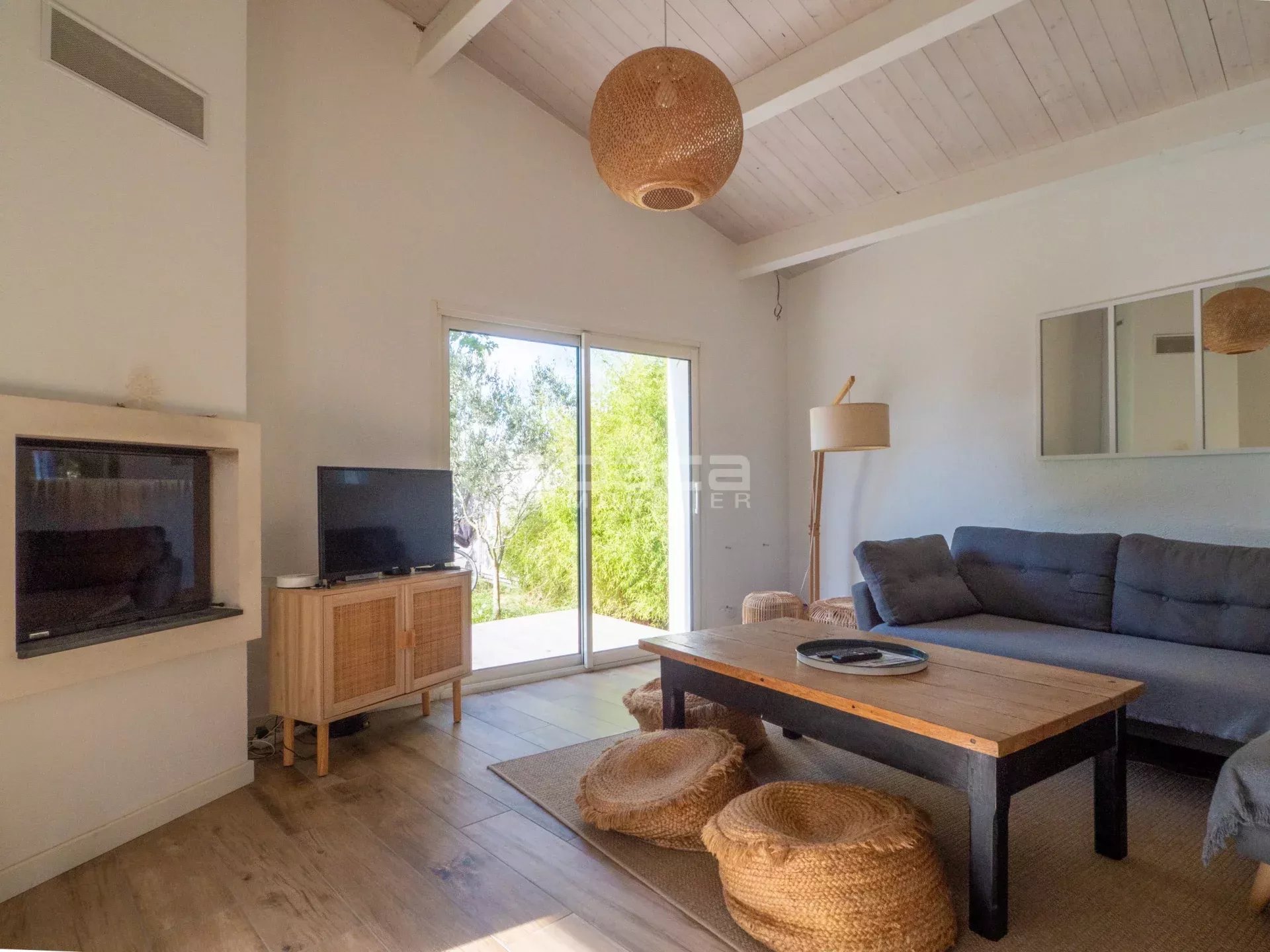 A proximité des commerces et des plages, jolie maison rénovée composée d'une pièce de vie lumineuse donnant sur le jardin, cuisine ouverte équipée, 4 chambres, 2 salles d'eau. Jardin ensoleillé avec terrasse et préau.